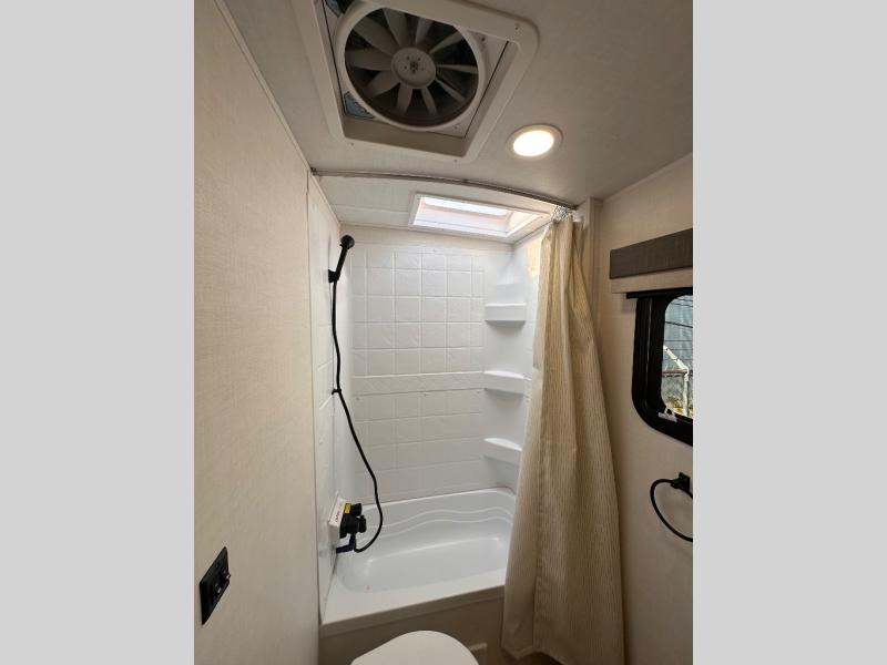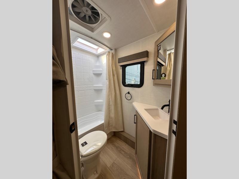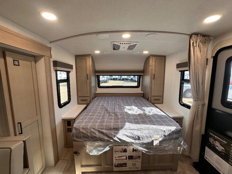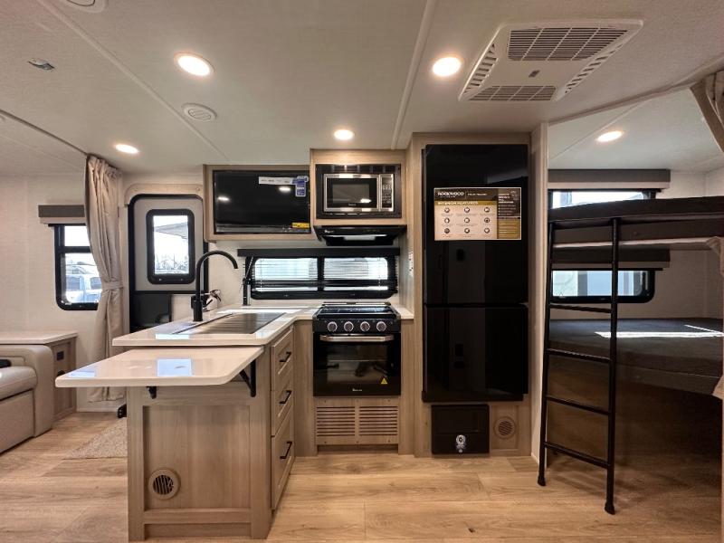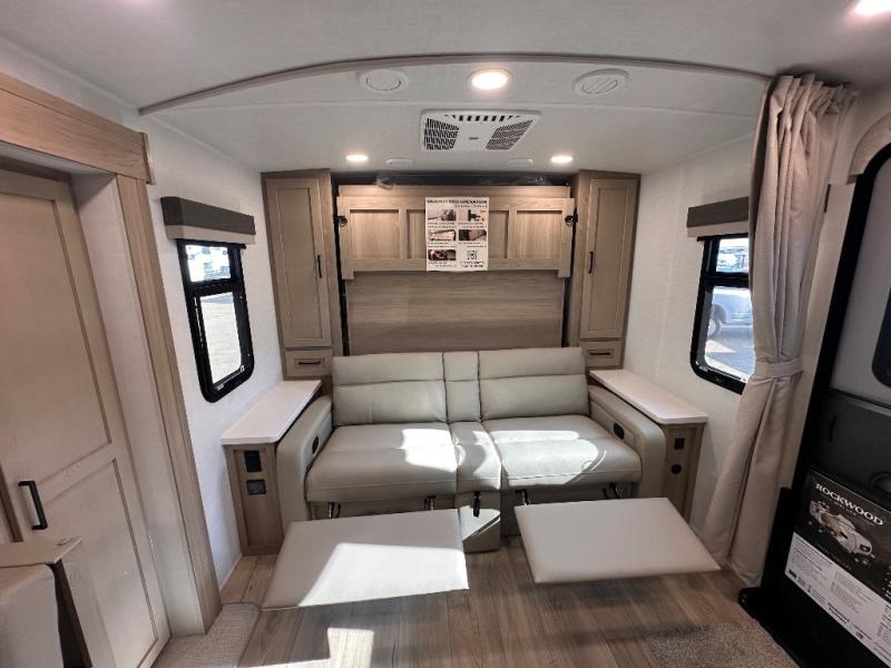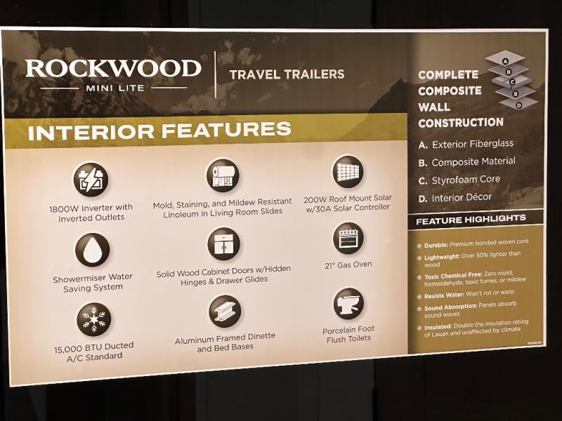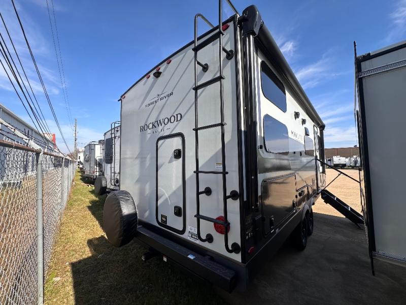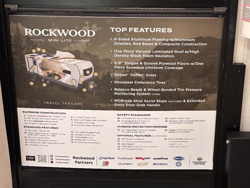 Each Rockwood Mini Lite travel trailer by Forest River is constructed with a fully laminated one-piece walkable roof, sleek frameless windows, and a six-sided full aluminum frame for strength and durability. The 12V thermostatically controlled heated tanks, plus radiant foil in the underbelly will allow you to camp well into the colder months, and the 200W roof solar panel will be perfect for a little off-gridding. Each model includes solid surface kitchen countertops, hidden hinge cabinet doors, roller shades, plus many more interior features. Having an AIR 360+ omnidirectional antenna with WiFi prep on board gives you the option to get some work done if it's needed, and the power tongue jack provides hassle-free set up, so you can enjoy more time relaxing!