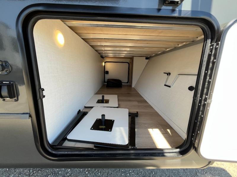 Camping trips to the lake just got sweeter with this dual slide out travel trailer in tow! Once you arrive, unload your gear from the exterior drop-frame pass-through storage, then start lunch on the exterior griddle. If you need a rest after traveling all day, the RV queen bed in the front bedroom is sure to give you comfort, or you can relax on the theater seating. The fireplace and entertainment center with a 32" TV will make this space feel just like home, and check out the spacious full rear bath for added privacy. This model also includes an entryway closet/pantry for jackets, shoes, and food!