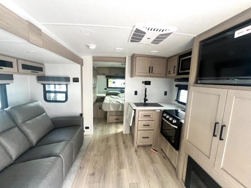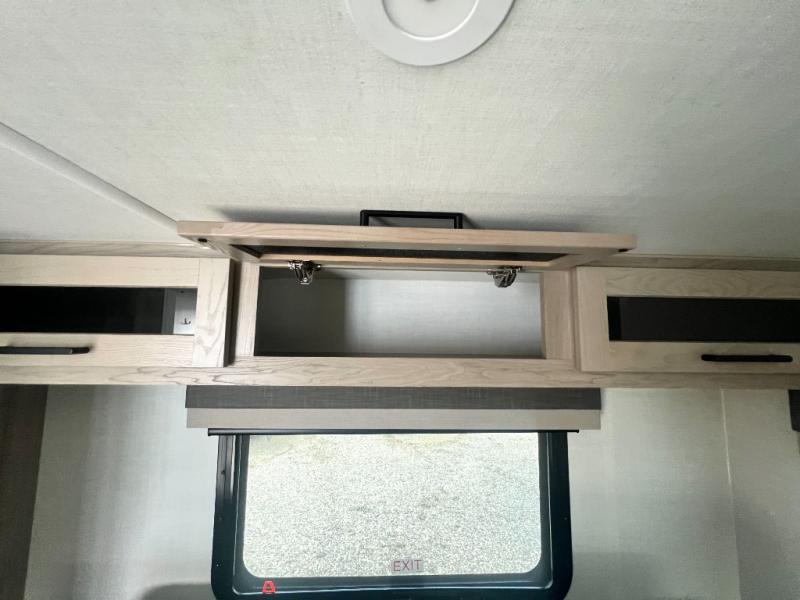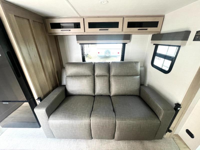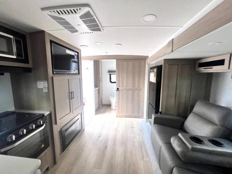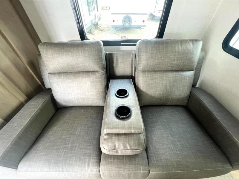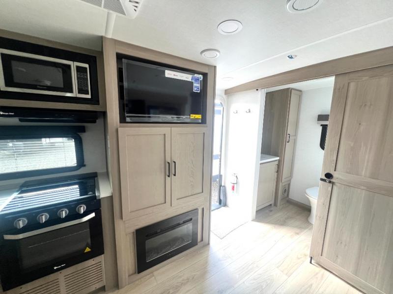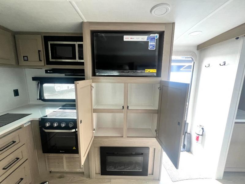 Camping trips to the lake just got sweeter with this dual slide out travel trailer in tow! Once you arrive, unload your gear from the exterior drop-frame pass-through storage, then start lunch on the exterior griddle. If you need a rest after traveling all day, the RV queen bed in the front bedroom is sure to give you comfort, or you can relax on the theater seating. The fireplace and entertainment center with a 32" TV will make this space feel just like home, and check out the spacious full rear bath for added privacy. This model also includes an entryway closet/pantry for jackets, shoes, and food!