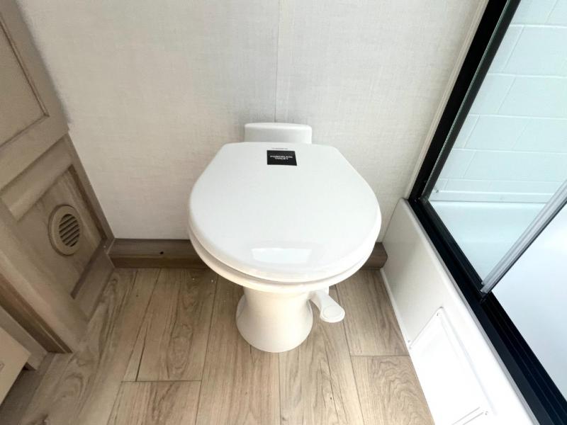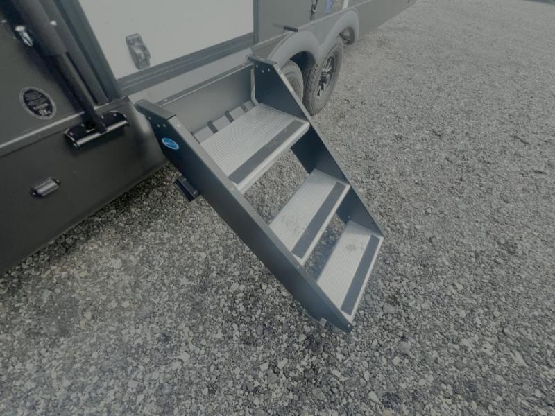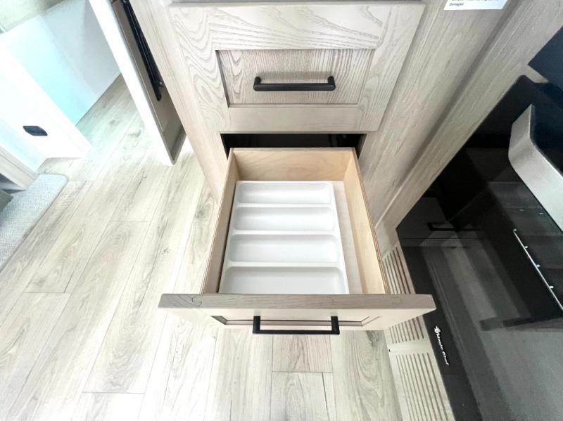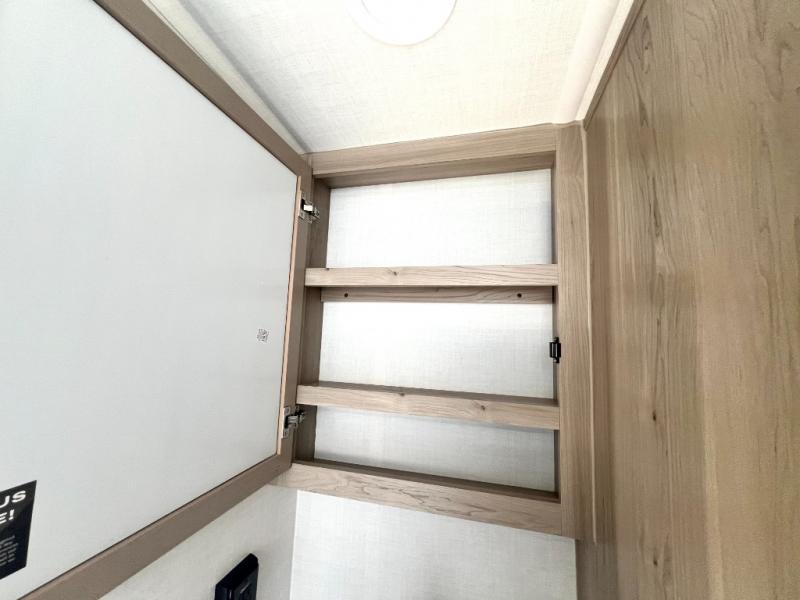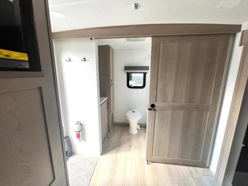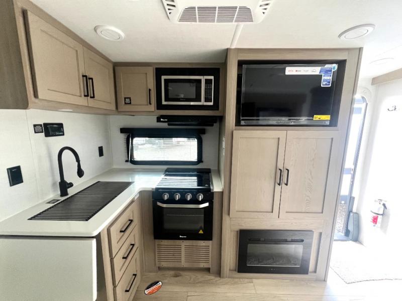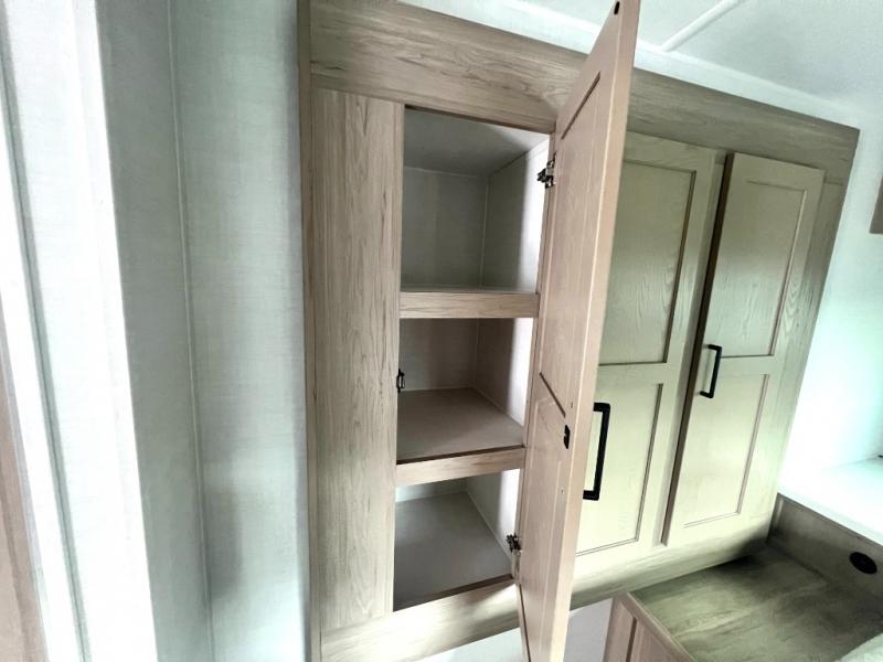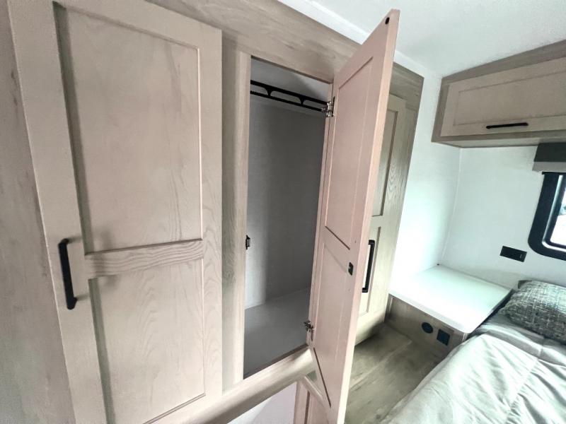 Camping trips to the lake just got sweeter with this dual slide out travel trailer in tow! Once you arrive, unload your gear from the exterior drop-frame pass-through storage, then start lunch on the exterior griddle. If you need a rest after traveling all day, the RV queen bed in the front bedroom is sure to give you comfort, or you can relax on the theater seating. The fireplace and entertainment center with a 32" TV will make this space feel just like home, and check out the spacious full rear bath for added privacy. This model also includes an entryway closet/pantry for jackets, shoes, and food!