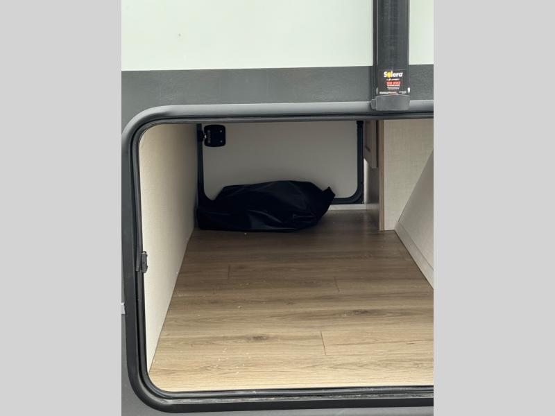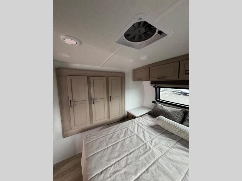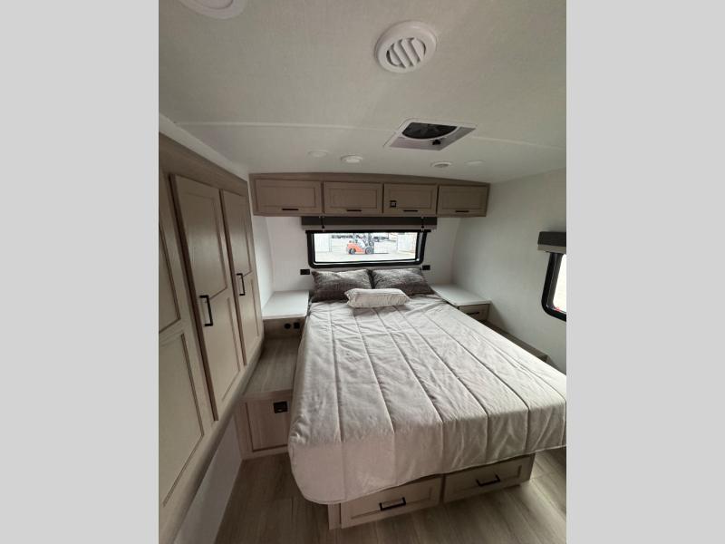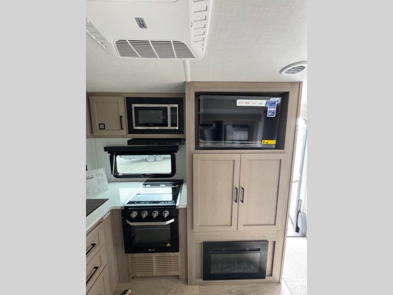 Camping trips to the lake just got sweeter with this dual slide out travel trailer in tow! Once you arrive, unload your gear from the exterior drop-frame pass-through storage, then start lunch on the exterior griddle. If you need a rest after traveling all day, the RV queen bed in the front bedroom is sure to give you comfort, or you can relax on the theater seating. The fireplace and entertainment center with a 32" TV will make this space feel just like home, and check out the spacious full rear bath for added privacy. This model also includes an entryway closet/pantry for jackets, shoes, and food!