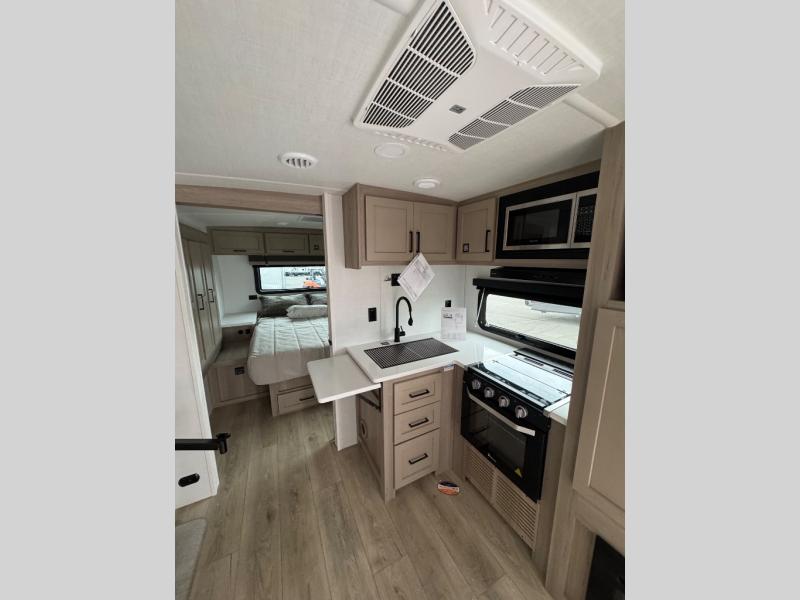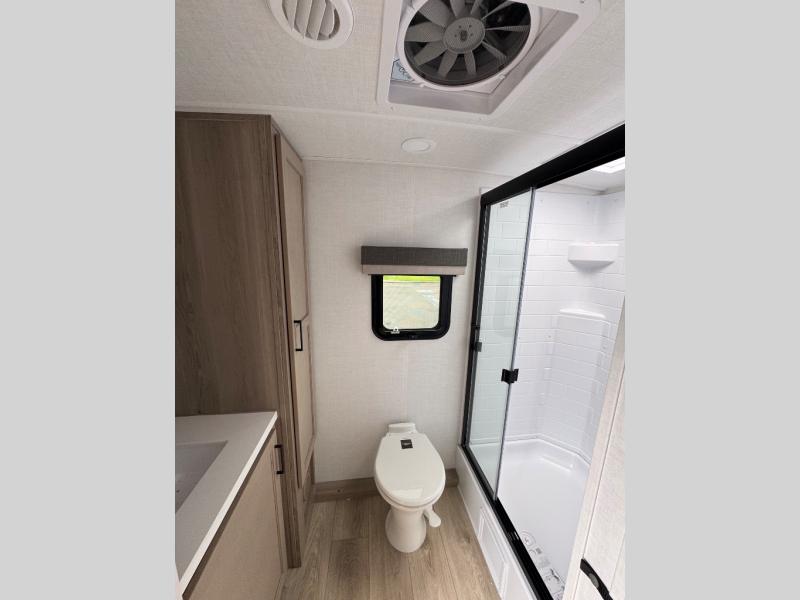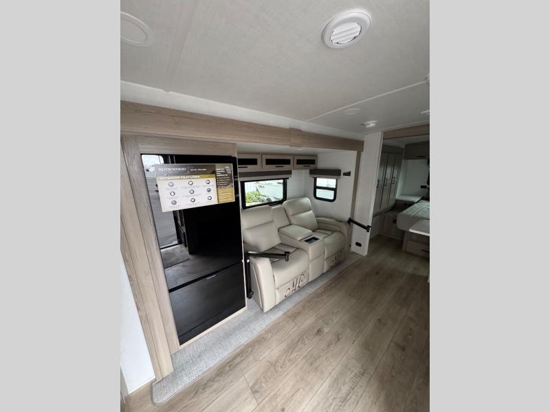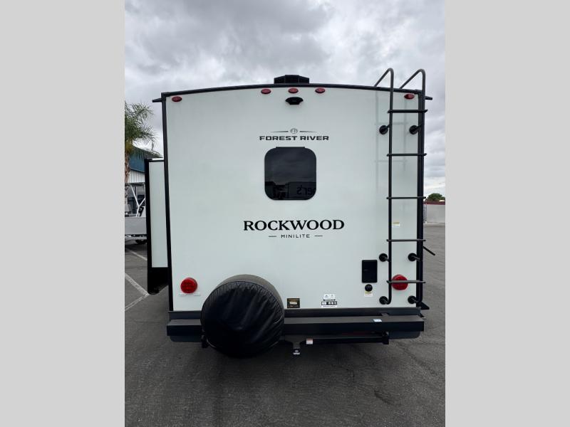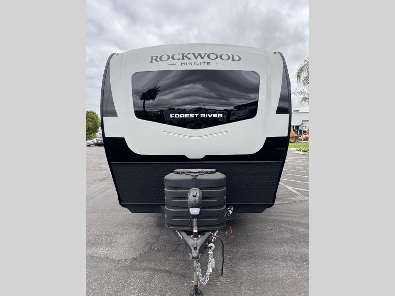 Each Rockwood Mini Lite travel trailer by Forest River is constructed with a fully laminated one-piece walkable roof, sleek frameless windows, and a six-sided full aluminum frame for strength and durability. The 12V thermostatically controlled heated tanks, plus radiant foil in the underbelly will allow you to camp well into the colder months, and the 200W roof solar panel will be perfect for a little off-gridding. Each model includes solid surface kitchen countertops, hidden hinge cabinet doors, roller shades, plus many more interior features. Having an AIR 360+ omnidirectional antenna with WiFi prep on board gives you the option to get some work done if it's needed, and the power tongue jack provides hassle-free set up, so you can enjoy more time relaxing!