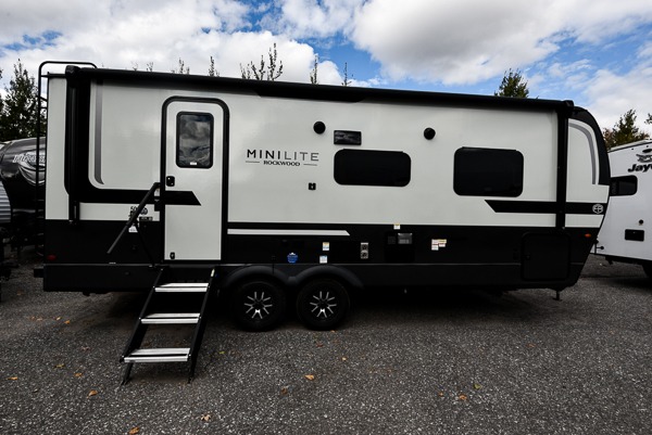 Each Rockwood Mini Lite travel trailer by Forest River is constructed with a fully laminated one-piece walkable roof, sleek frameless windows, and a six-sided full aluminum frame for strength and durability. The 12V thermostatically controlled heated tanks, plus radiant foil in the underbelly will allow you to camp well into the colder months, and the 200W roof solar panel will be perfect for a little off-gridding. Each model includes solid surface kitchen countertops, hidden hinge cabinet doors, roller shades, plus many more interior features. Having an AIR 360+ omnidirectional antenna with WiFi prep on board gives you the option to get some work done if it's needed, and the power tongue jack provides hassle-free set up, so you can enjoy more time relaxing!