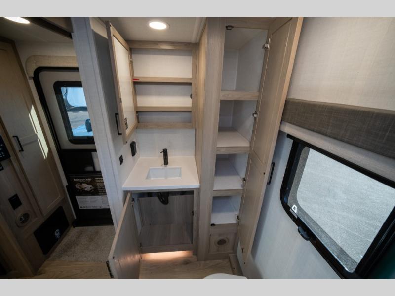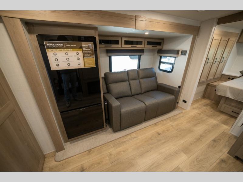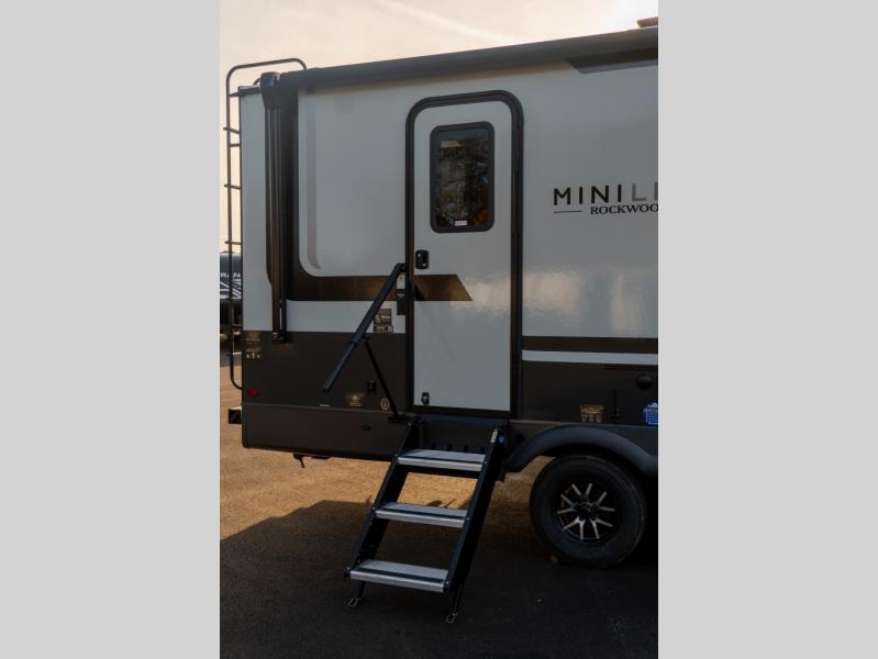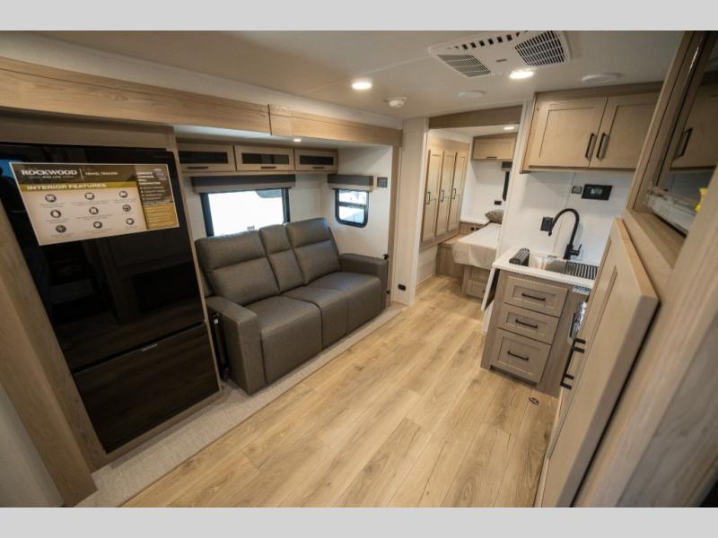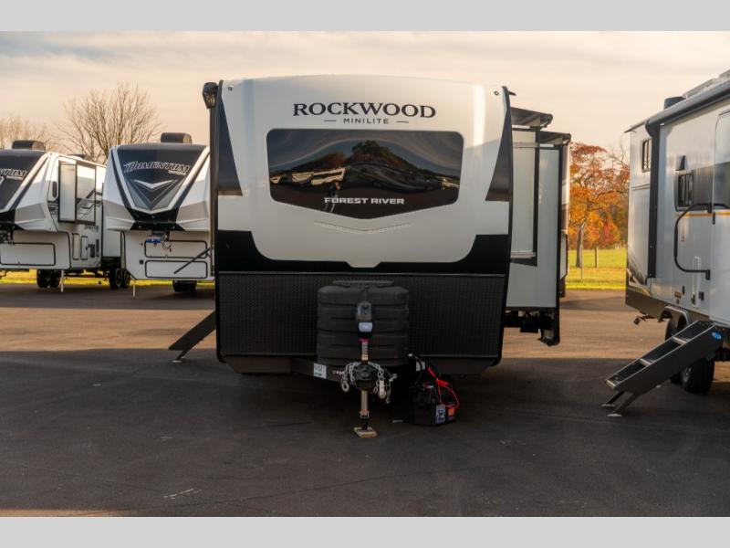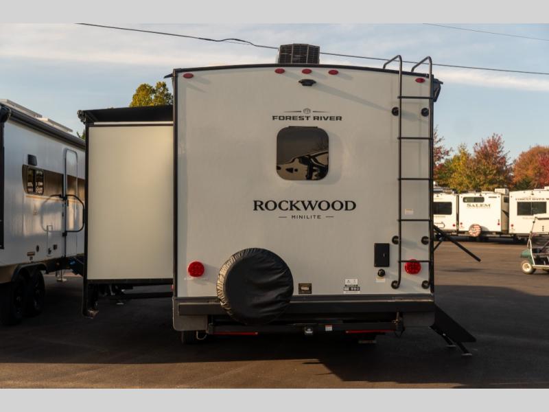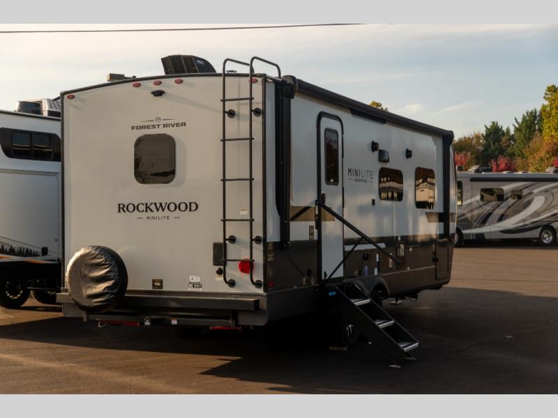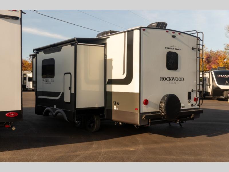 Each Rockwood Mini Lite travel trailer by Forest River is constructed with a fully laminated one-piece walkable roof, sleek frameless windows, and a six-sided full aluminum frame for strength and durability. The 12V thermostatically controlled heated tanks, plus radiant foil in the underbelly will allow you to camp well into the colder months, and the 200W roof solar panel will be perfect for a little off-gridding. Each model includes solid surface kitchen countertops, hidden hinge cabinet doors, roller shades, plus many more interior features. Having an AIR 360+ omnidirectional antenna with WiFi prep on board gives you the option to get some work done if it's needed, and the power tongue jack provides hassle-free set up, so you can enjoy more time relaxing!