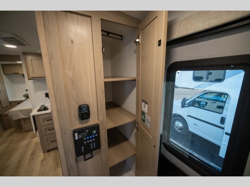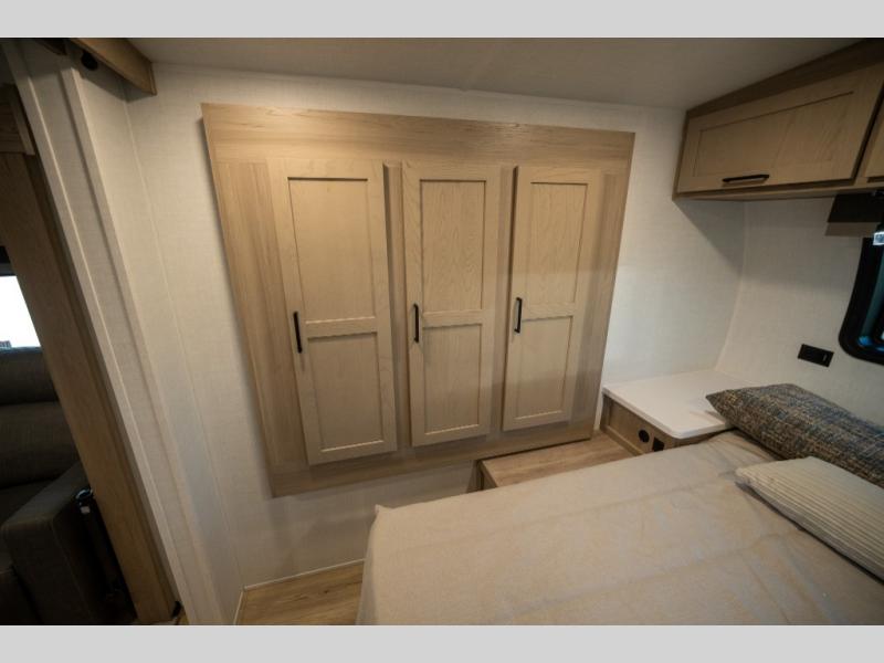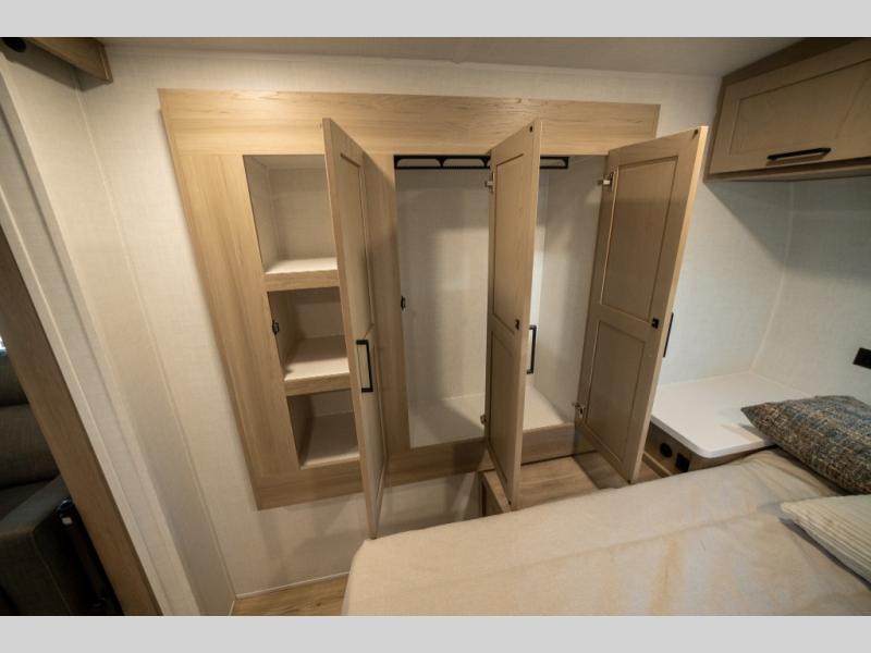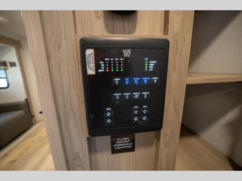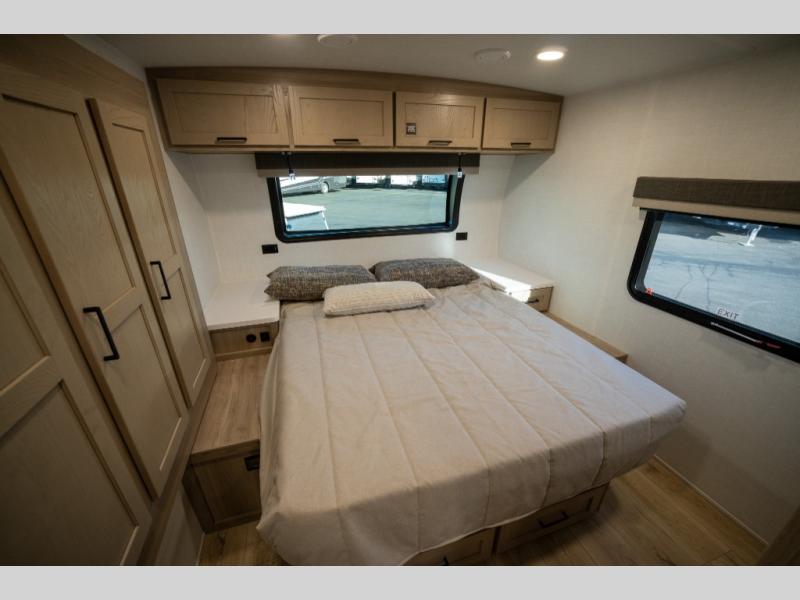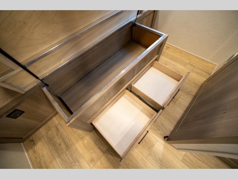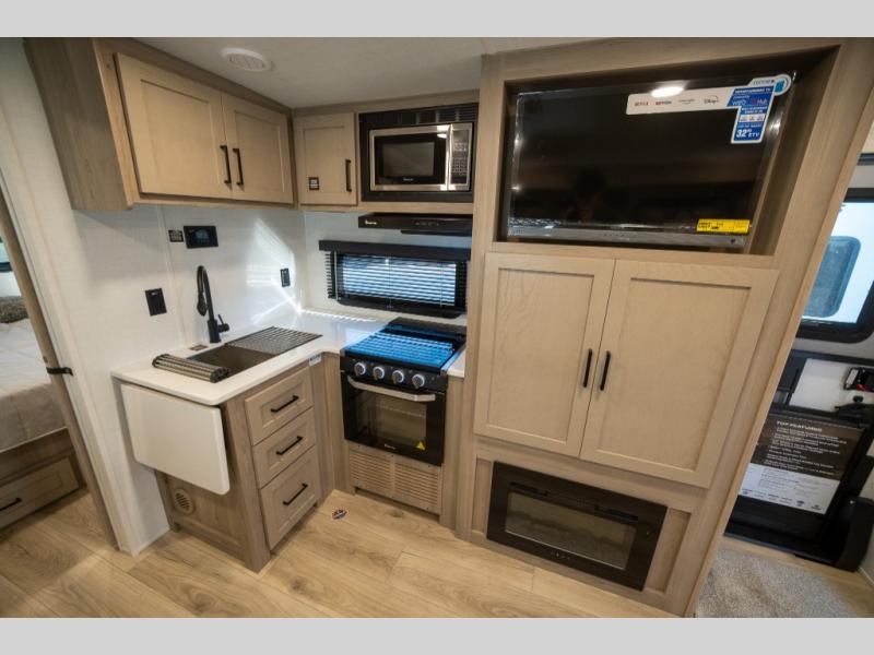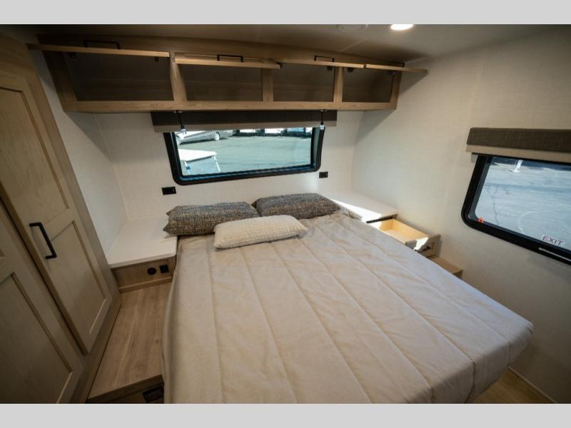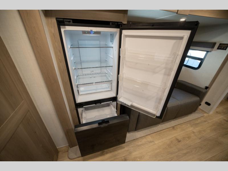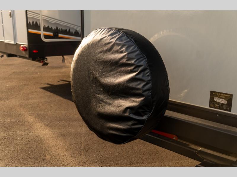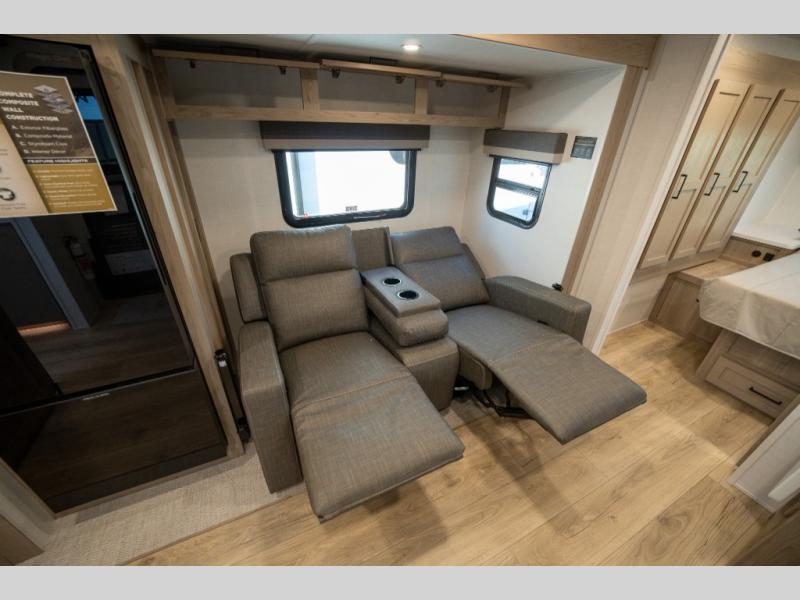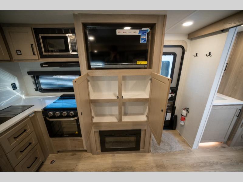 Camping trips to the lake just got sweeter with this dual slide out travel trailer in tow! Once you arrive, unload your gear from the exterior drop-frame pass-through storage, then start lunch on the exterior griddle. If you need a rest after traveling all day, the RV queen bed in the front bedroom is sure to give you comfort, or you can relax on the theater seating. The fireplace and entertainment center with a 32" TV will make this space feel just like home, and check out the spacious full rear bath for added privacy. This model also includes an entryway closet/pantry for jackets, shoes, and food!