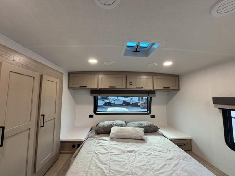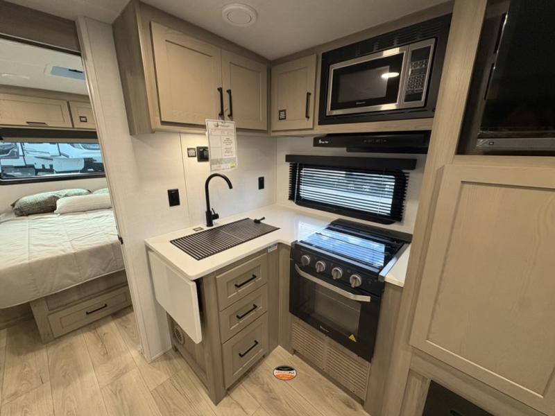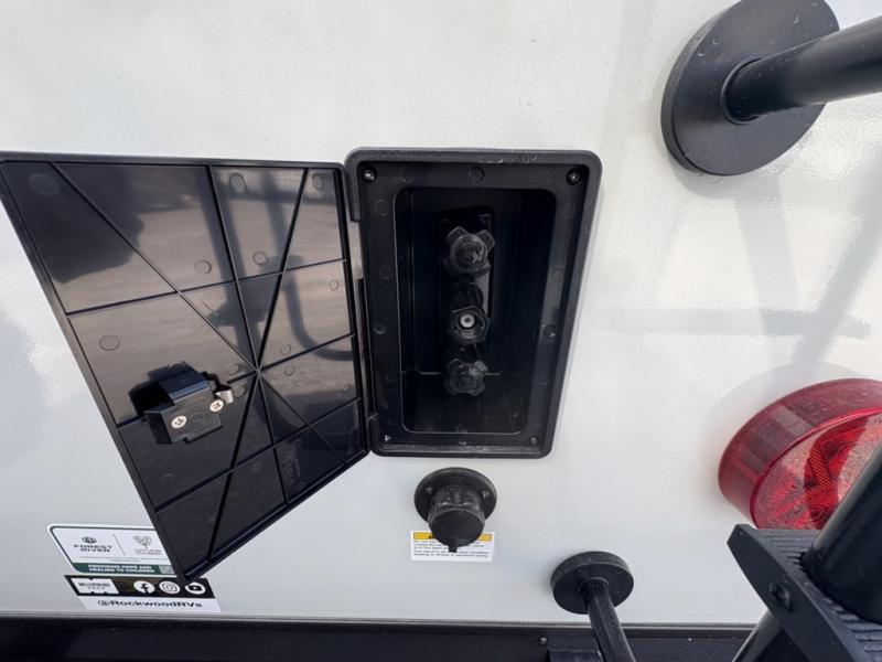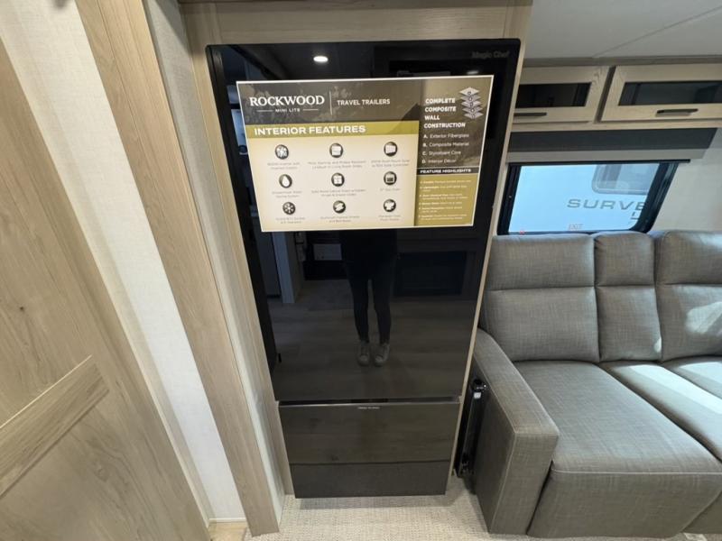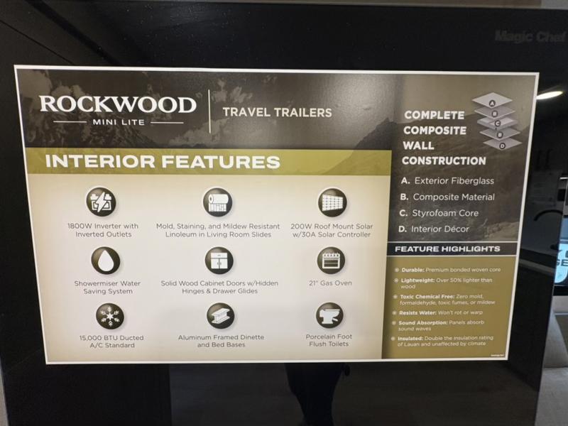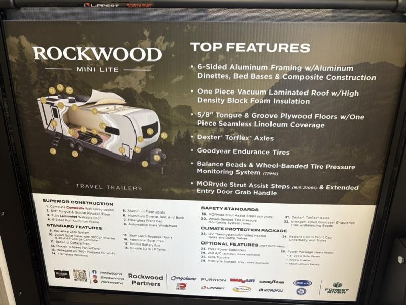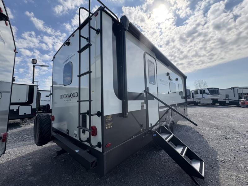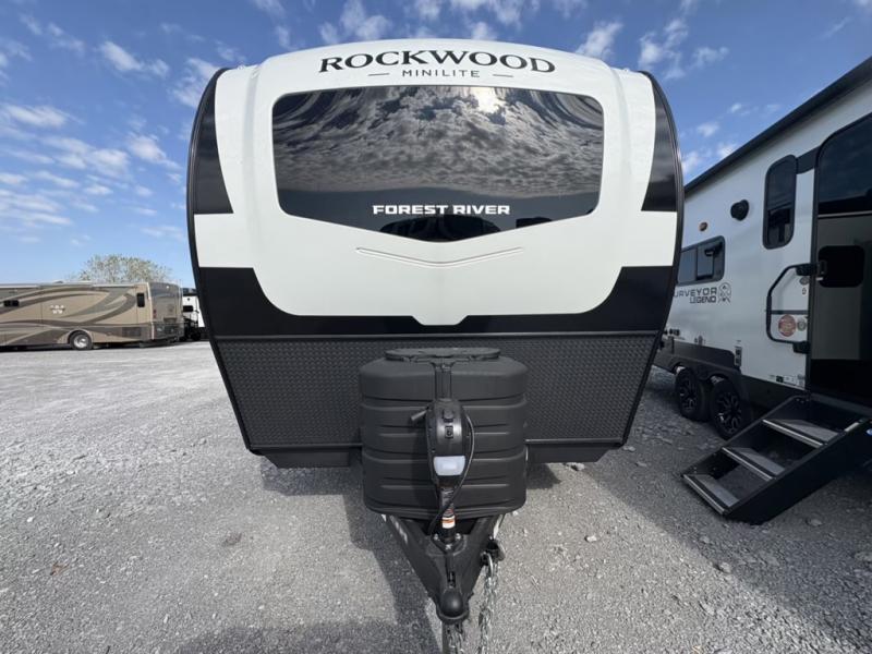 Each Rockwood Mini Lite travel trailer by Forest River is constructed with a fully laminated one-piece walkable roof, sleek frameless windows, and a six-sided full aluminum frame for strength and durability. The 12V thermostatically controlled heated tanks, plus radiant foil in the underbelly will allow you to camp well into the colder months, and the 200W roof solar panel will be perfect for a little off-gridding. Each model includes solid surface kitchen countertops, hidden hinge cabinet doors, roller shades, plus many more interior features. Having an AIR 360+ omnidirectional antenna with WiFi prep on board gives you the option to get some work done if it's needed, and the power tongue jack provides hassle-free set up, so you can enjoy more time relaxing!