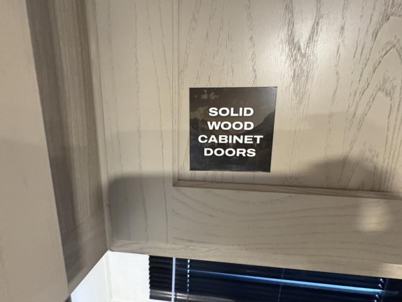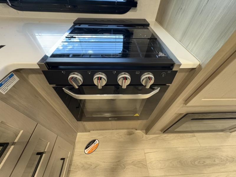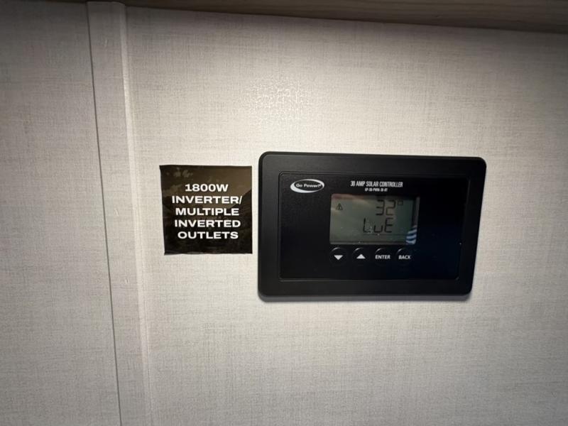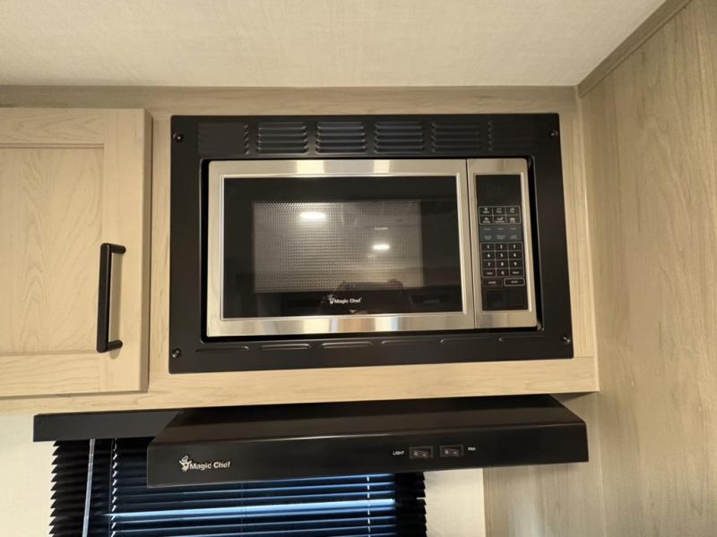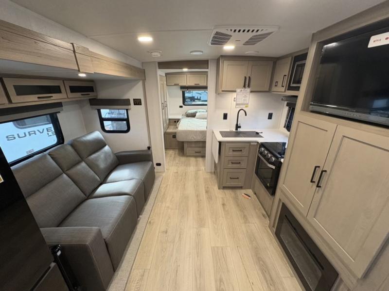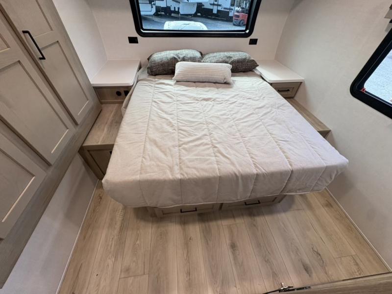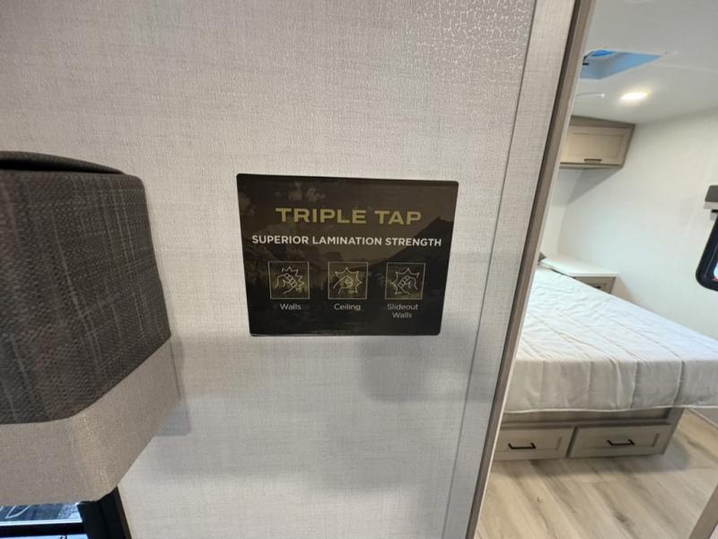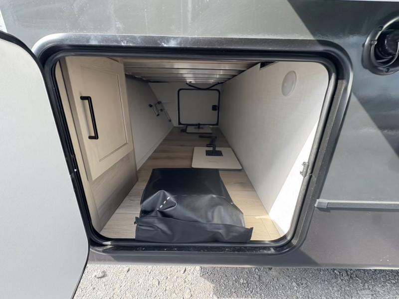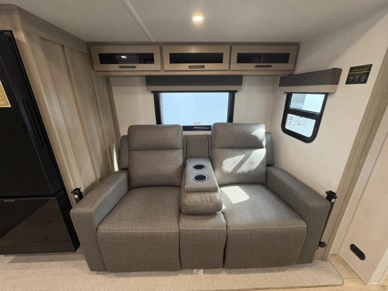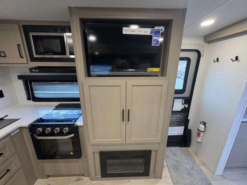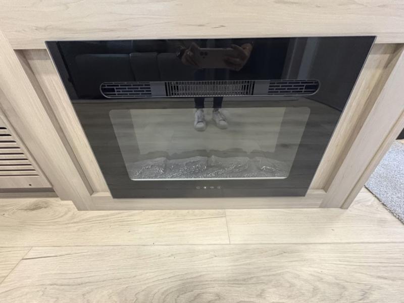Camping trips to the lake just got sweeter with this dual slide out travel trailer in tow! Once you arrive, unload your gear from the exterior drop-frame pass-through storage, then start lunch on the exterior griddle. If you need a rest after traveling all day, the RV queen bed in the front bedroom is sure to give you comfort, or you can relax on the theater seating. The fireplace and entertainment center with a 32" TV will make this space feel just like home, and check out the spacious full rear bath for added privacy. This model also includes an entryway closet/pantry for jackets, shoes, and food!