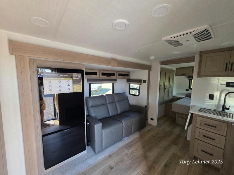 Each Rockwood Mini Lite travel trailer by Forest River is constructed with a fully laminated one-piece walkable roof, sleek frameless windows, and a six-sided full aluminum frame for strength and durability. The 12V thermostatically controlled heated tanks, plus radiant foil in the underbelly will allow you to camp well into the colder months, and the 200W roof solar panel will be perfect for a little off-gridding. Each model includes solid surface kitchen countertops, hidden hinge cabinet doors, roller shades, plus many more interior features. Having an AIR 360+ omnidirectional antenna with WiFi prep on board gives you the option to get some work done if it's needed, and the power tongue jack provides hassle-free set up, so you can enjoy more time relaxing!