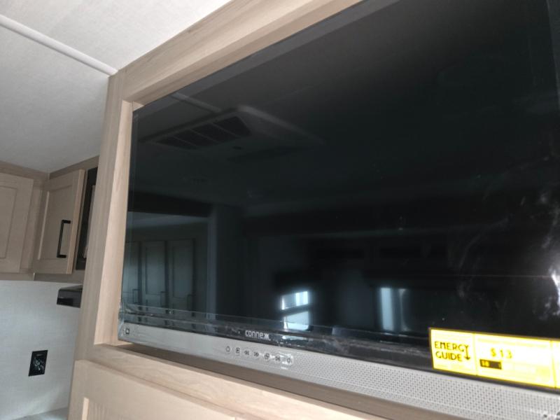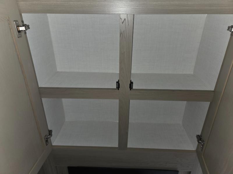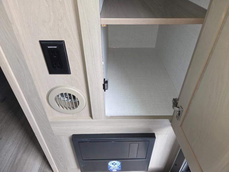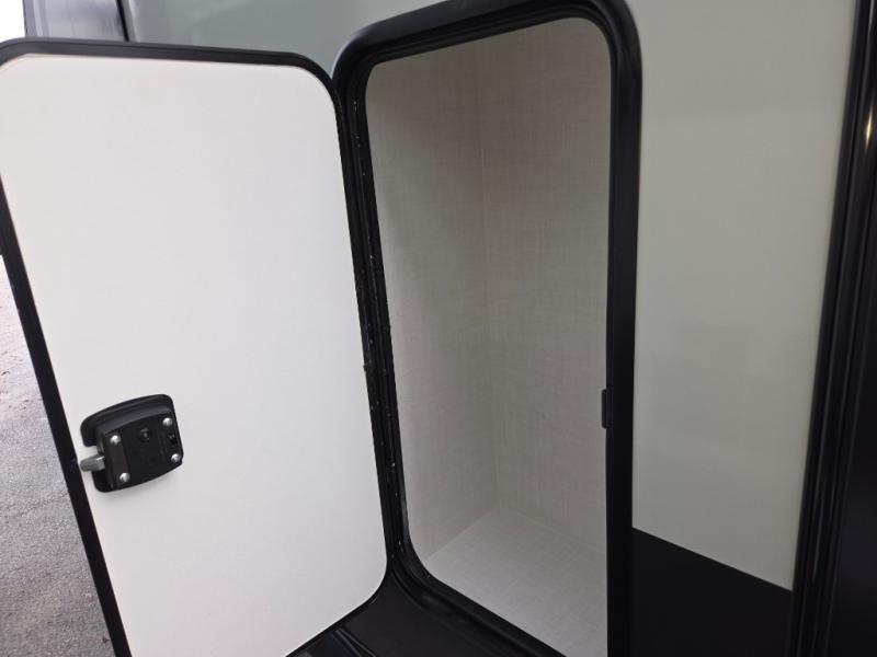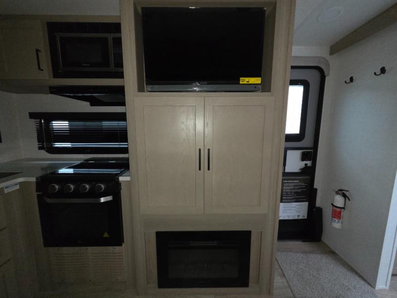 Camping trips to the lake just got sweeter with this dual slide out travel trailer in tow! Once you arrive, unload your gear from the exterior drop-frame pass-through storage, then start lunch on the exterior griddle. If you need a rest after traveling all day, the RV queen bed in the front bedroom is sure to give you comfort, or you can relax on the theater seating. The fireplace and entertainment center with a 32" TV will make this space feel just like home, and check out the spacious full rear bath for added privacy. This model also includes an entryway closet/pantry for jackets, shoes, and food!