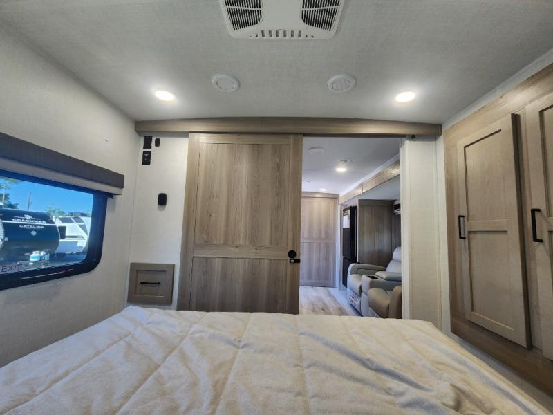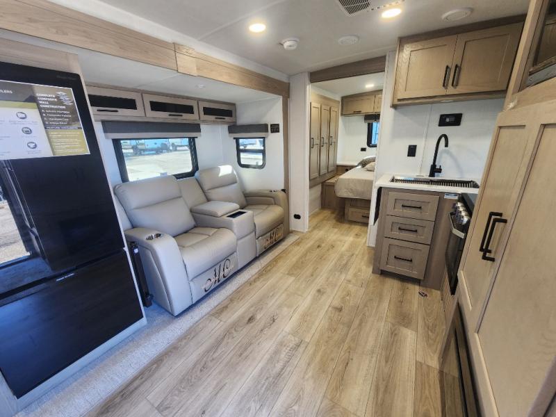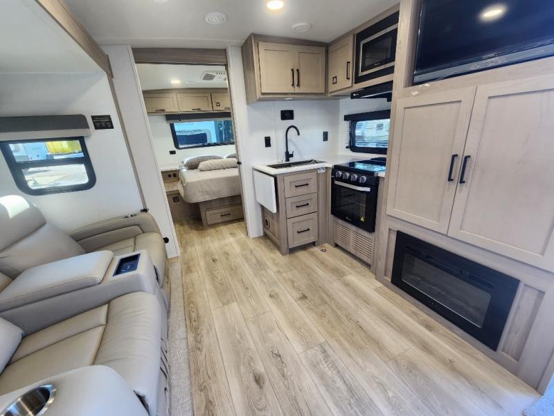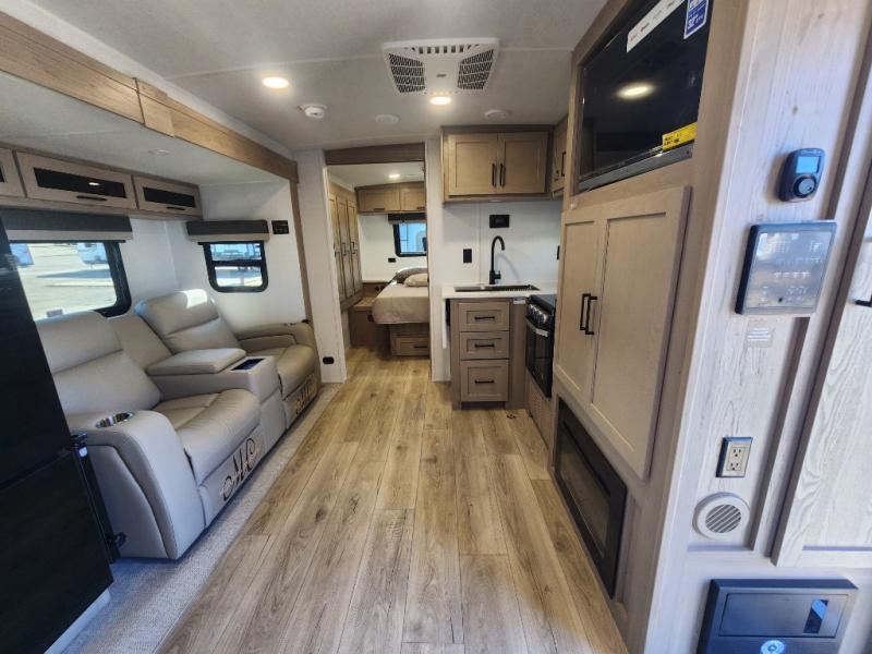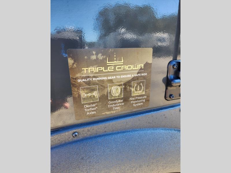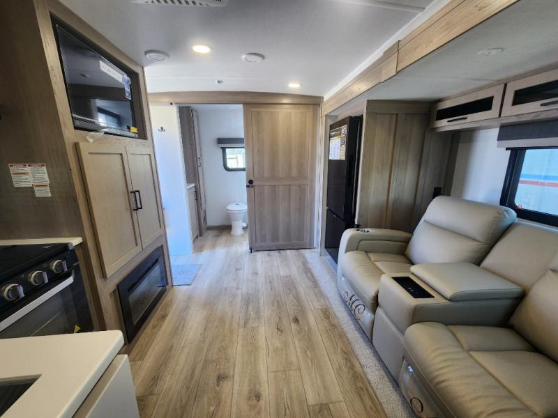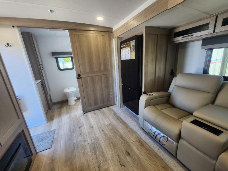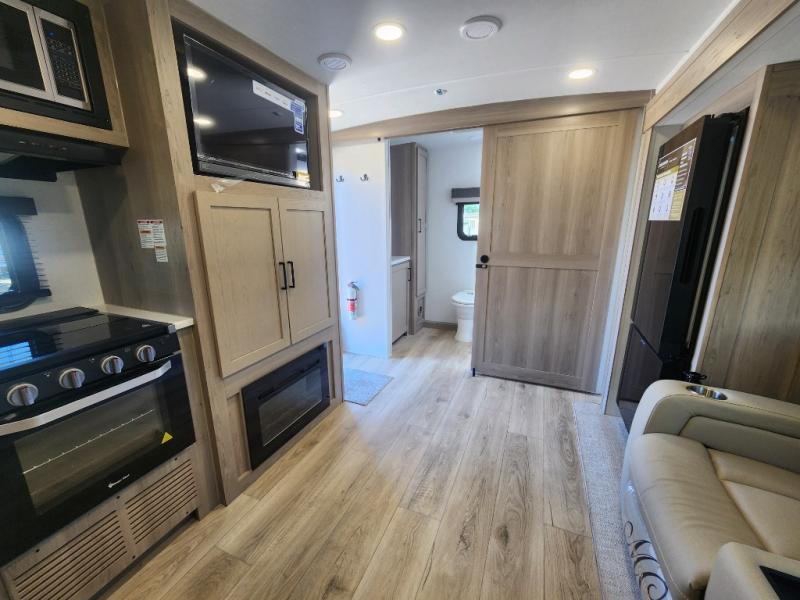 Camping trips to the lake just got sweeter with this dual slide out travel trailer in tow! Once you arrive, unload your gear from the exterior drop-frame pass-through storage, then start lunch on the exterior griddle. If you need a rest after traveling all day, the RV queen bed in the front bedroom is sure to give you comfort, or you can relax on the theater seating. The fireplace and entertainment center with a 32" TV will make this space feel just like home, and check out the spacious full rear bath for added privacy. This model also includes an entryway closet/pantry for jackets, shoes, and food!