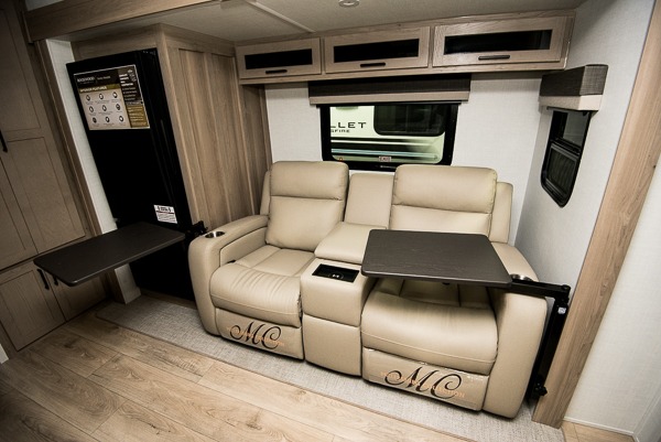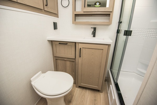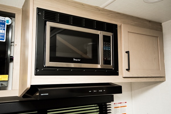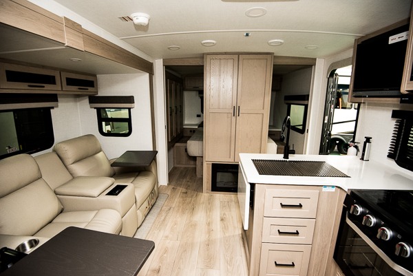 This is the perfect travel trailer for two people looking for comfortable camping trips! You will have your own RV queen bed to sleep on in the front private bedroom, and an optional TV can be added if you enjoy the morning news in bed. Breakfast can be made on the three burner cooktop, or head outdoors to cook on the outside kitchen. The theater seating with a table will provide a place to relax and dine together, and the spacious full rear bath will allow you to clean up before you head out for the day. This model includes plenty of storage space, including two pantries, a wardrobe slide out in the bedroom, plus a drop-frame pass-through storage for larger camp gear!