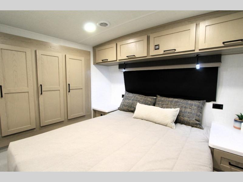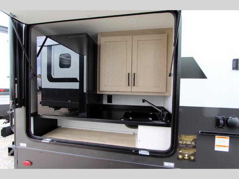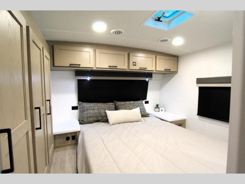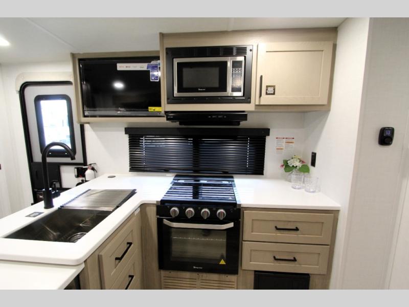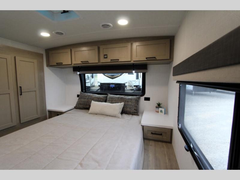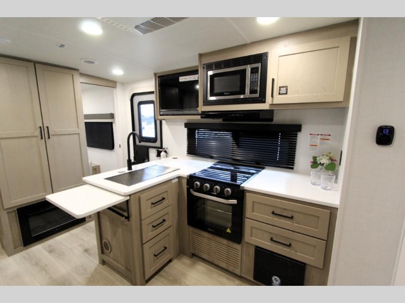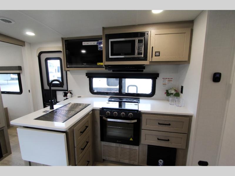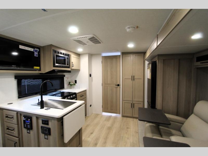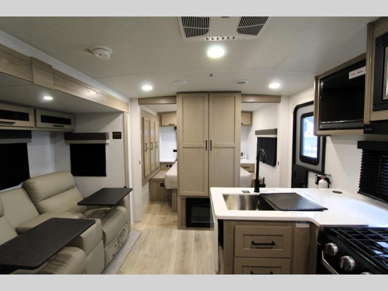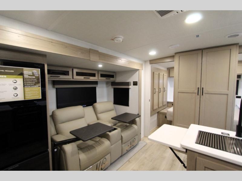 This is the perfect travel trailer for two people looking for comfortable camping trips! You will have your own RV queen bed to sleep on in the front private bedroom, and an optional TV can be added if you enjoy the morning news in bed. Breakfast can be made on the three burner cooktop, or head outdoors to cook on the outside kitchen. The theater seating with a table will provide a place to relax and dine together, and the spacious full rear bath will allow you to clean up before you head out for the day. This model includes plenty of storage space, including two pantries, a wardrobe slide out in the bedroom, plus a drop-frame pass-through storage for larger camp gear!