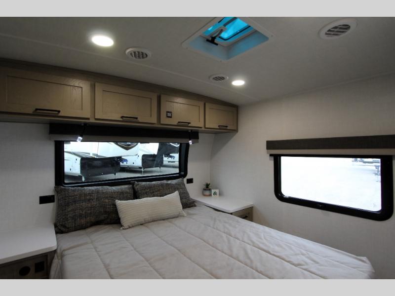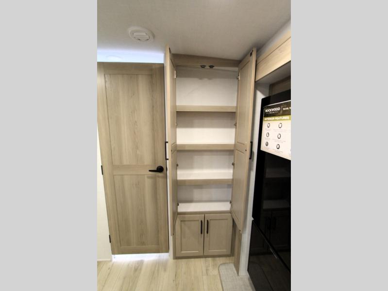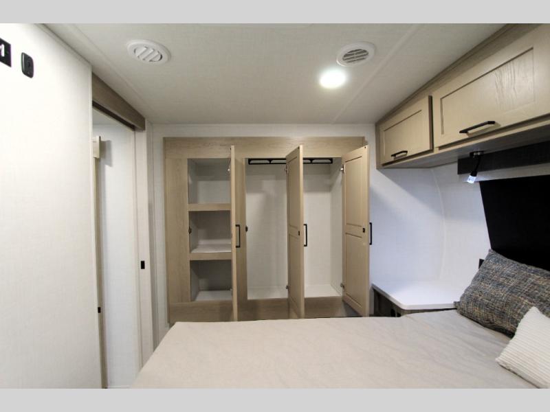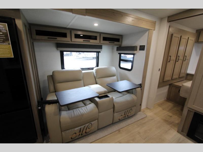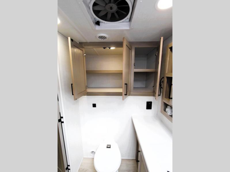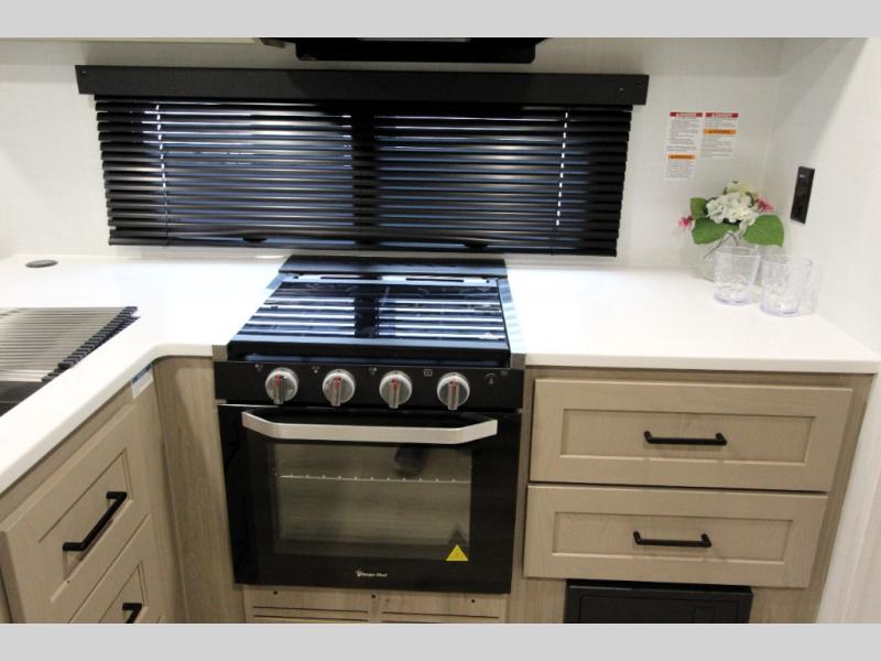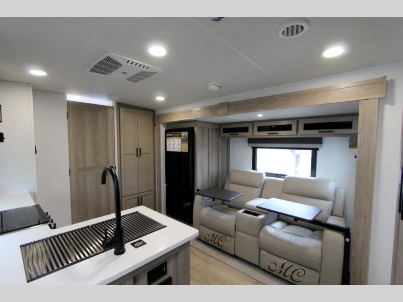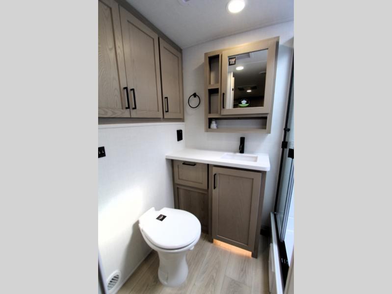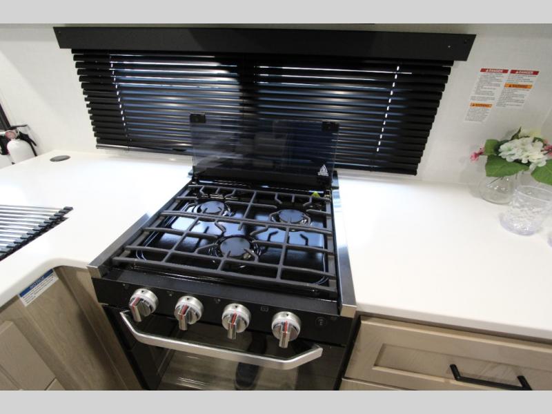 This is the perfect travel trailer for two people looking for comfortable camping trips! You will have your own RV queen bed to sleep on in the front private bedroom, and an optional TV can be added if you enjoy the morning news in bed. Breakfast can be made on the three burner cooktop, or head outdoors to cook on the outside kitchen. The theater seating with a table will provide a place to relax and dine together, and the spacious full rear bath will allow you to clean up before you head out for the day. This model includes plenty of storage space, including two pantries, a wardrobe slide out in the bedroom, plus a drop-frame pass-through storage for larger camp gear!
