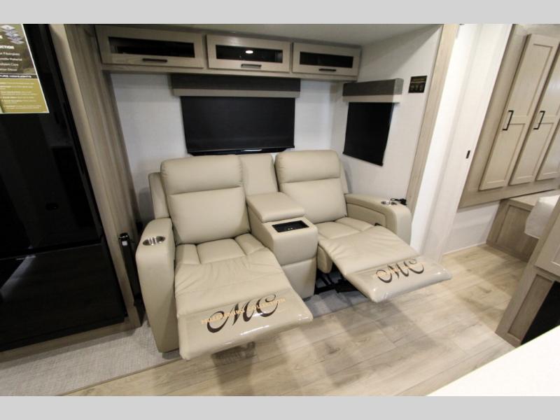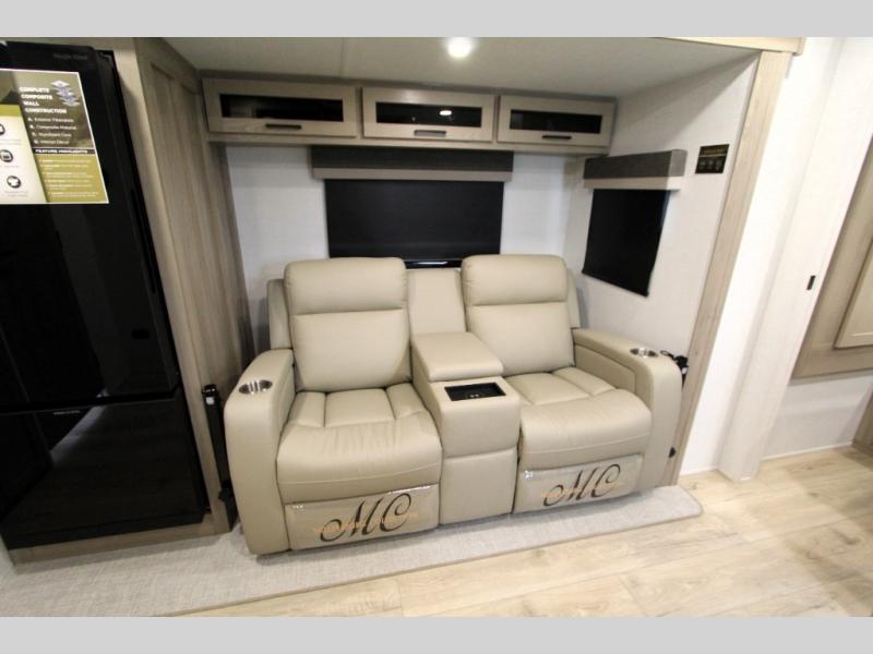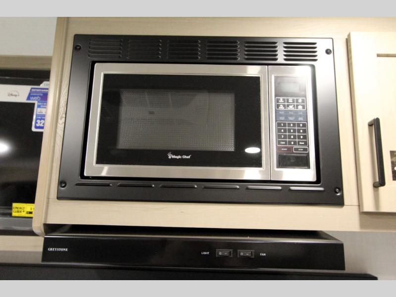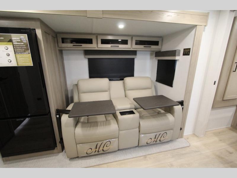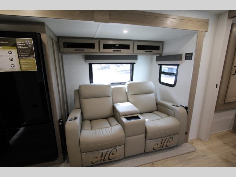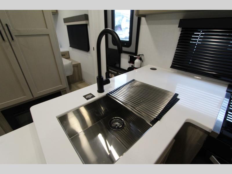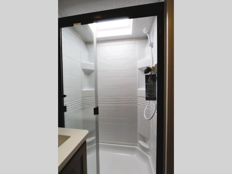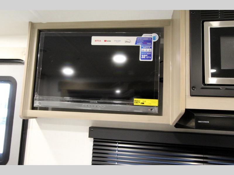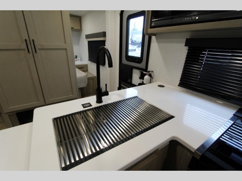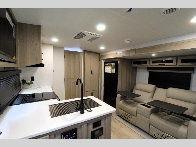 This is the perfect travel trailer for two people looking for comfortable camping trips! You will have your own RV queen bed to sleep on in the front private bedroom, and an optional TV can be added if you enjoy the morning news in bed. Breakfast can be made on the three burner cooktop, or head outdoors to cook on the outside kitchen. The theater seating with a table will provide a place to relax and dine together, and the spacious full rear bath will allow you to clean up before you head out for the day. This model includes plenty of storage space, including two pantries, a wardrobe slide out in the bedroom, plus a drop-frame pass-through storage for larger camp gear!