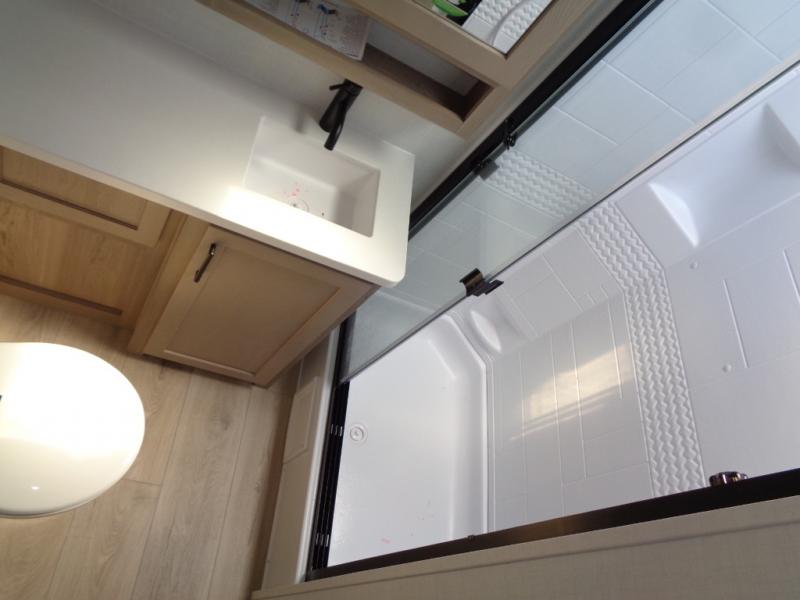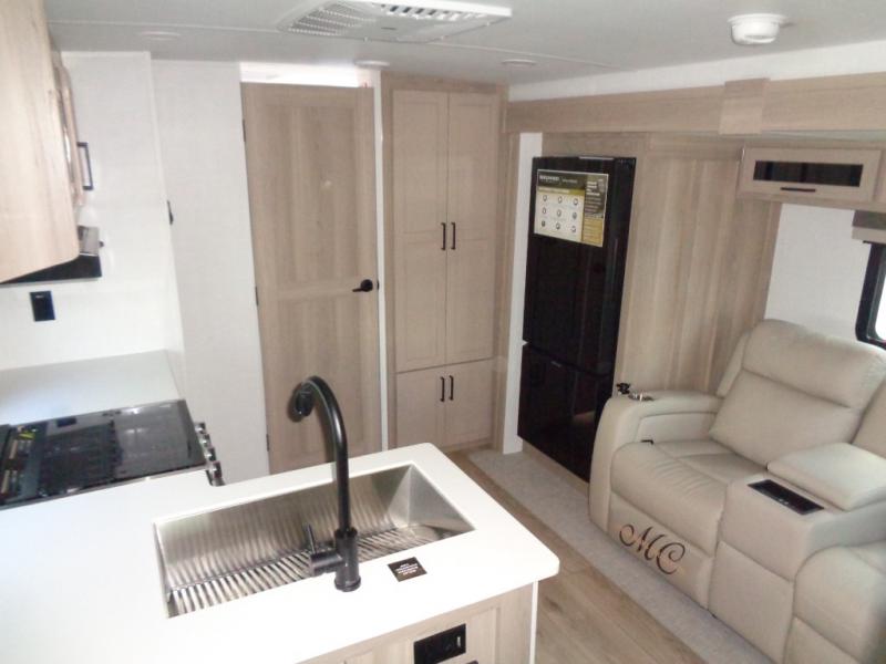 This is the perfect travel trailer for two people looking for comfortable camping trips! You will have your own RV queen bed to sleep on in the front private bedroom, and an optional TV can be added if you enjoy the morning news in bed. Breakfast can be made on the three burner cooktop, or head outdoors to cook on the outside kitchen. The theater seating with a table will provide a place to relax and dine together, and the spacious full rear bath will allow you to clean up before you head out for the day. This model includes plenty of storage space, including two pantries, a wardrobe slide out in the bedroom, plus a drop-frame pass-through storage for larger camp gear!
