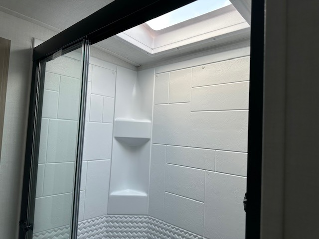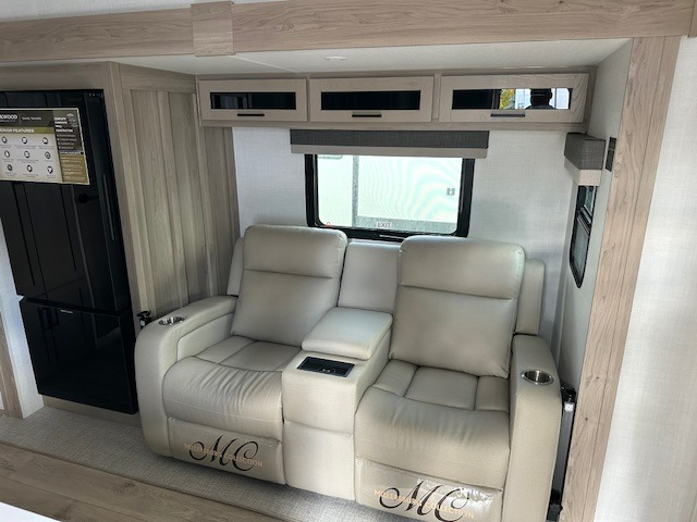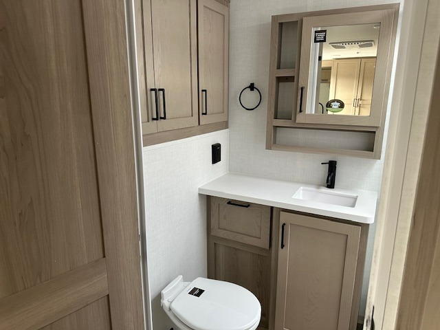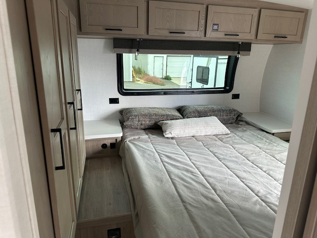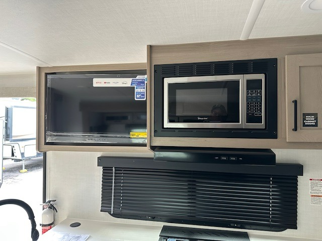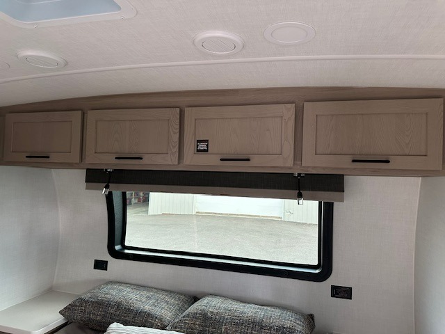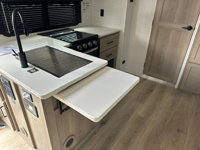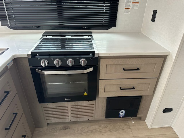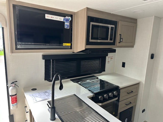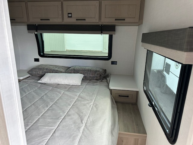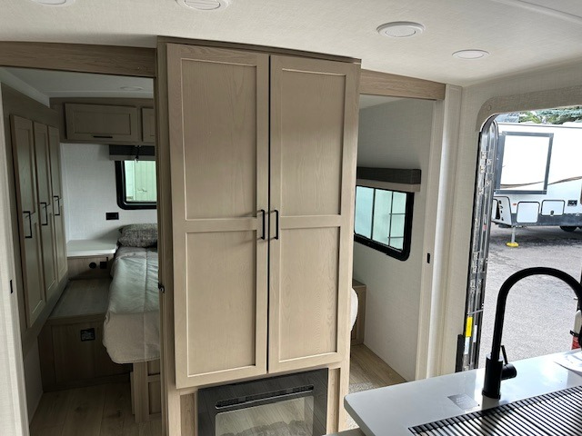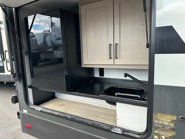 This is the perfect travel trailer for two people looking for comfortable camping trips! You will have your own RV queen bed to sleep on in the front private bedroom, and an optional TV can be added if you enjoy the morning news in bed. Breakfast can be made on the three burner cooktop, or head outdoors to cook on the outside kitchen. The theater seating with a table will provide a place to relax and dine together, and the spacious full rear bath will allow you to clean up before you head out for the day. This model includes plenty of storage space, including two pantries, a wardrobe slide out in the bedroom, plus a drop-frame pass-through storage for larger camp gear!