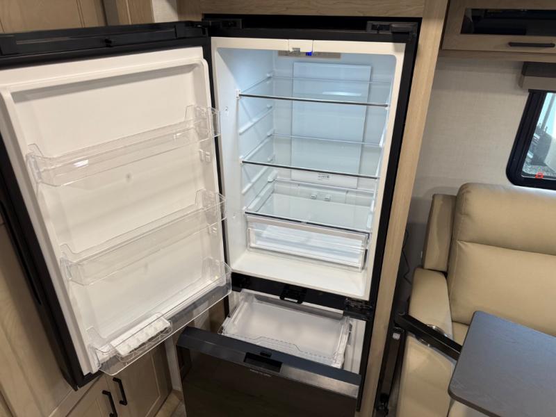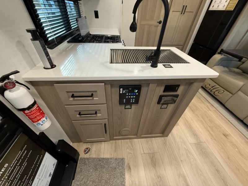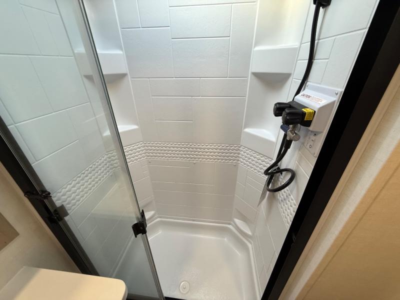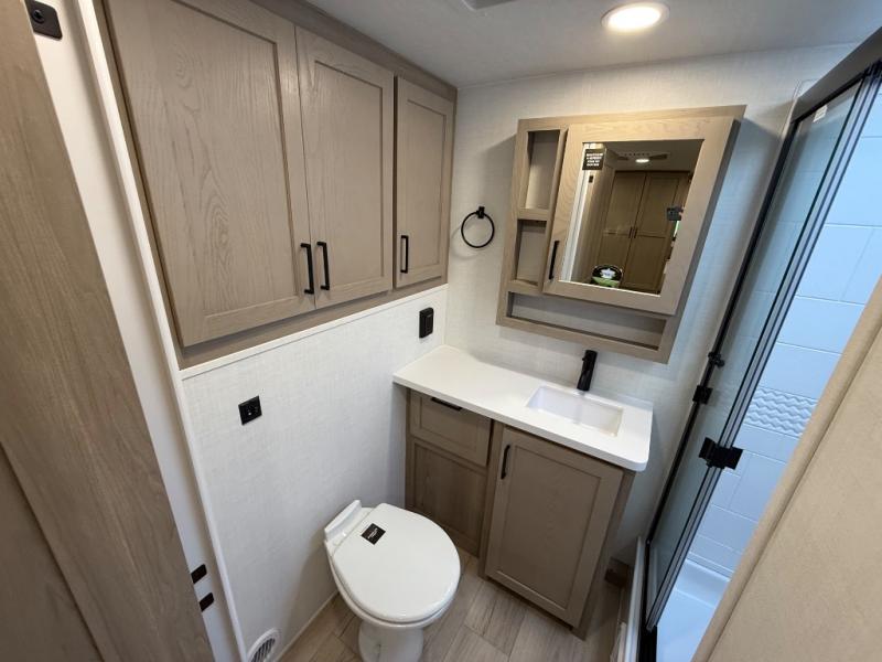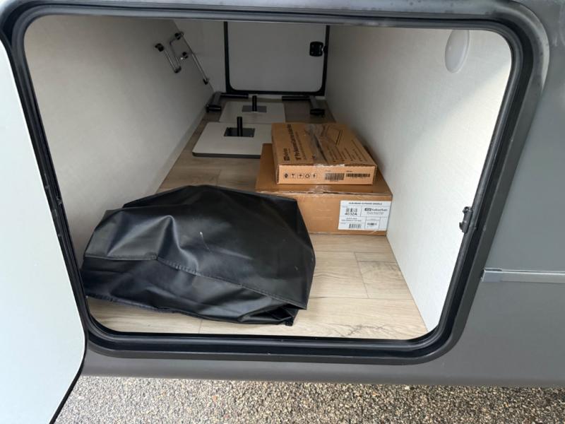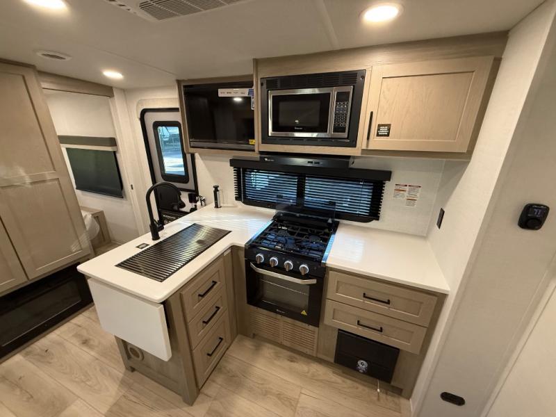 This is the perfect travel trailer for two people looking for comfortable camping trips! You will have your own RV queen bed to sleep on in the front private bedroom, and an optional TV can be added if you enjoy the morning news in bed. Breakfast can be made on the three burner cooktop, or head outdoors to cook on the outside kitchen. The theater seating with a table will provide a place to relax and dine together, and the spacious full rear bath will allow you to clean up before you head out for the day. This model includes plenty of storage space, including two pantries, a wardrobe slide out in the bedroom, plus a drop-frame pass-through storage for larger camp gear!