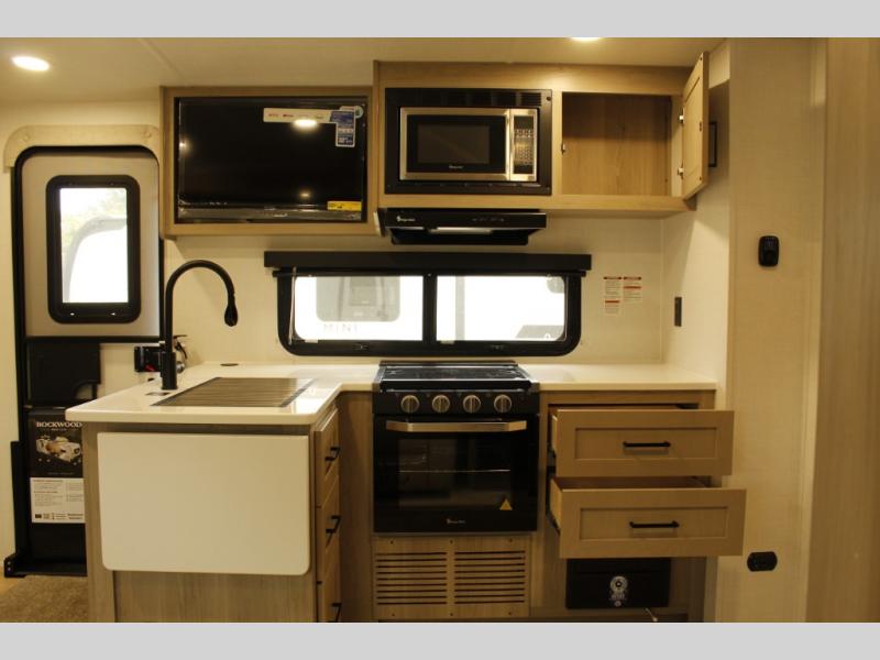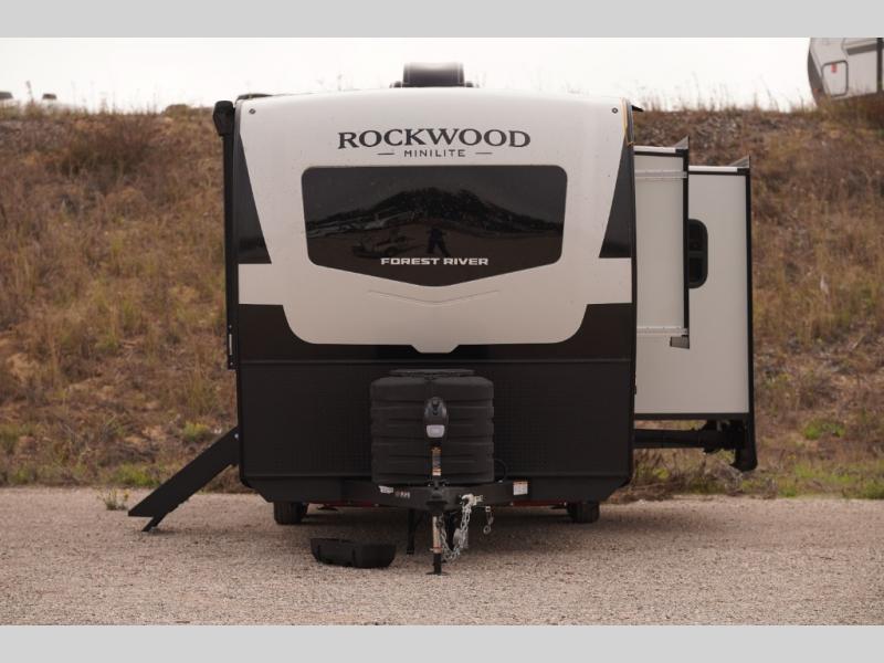 Each Rockwood Mini Lite travel trailer by Forest River is constructed with a fully laminated one-piece walkable roof, sleek frameless windows, and a six-sided full aluminum frame for strength and durability. The 12V thermostatically controlled heated tanks, plus radiant foil in the underbelly will allow you to camp well into the colder months, and the 200W roof solar panel will be perfect for a little off-gridding. Each model includes solid surface kitchen countertops, hidden hinge cabinet doors, roller shades, plus many more interior features. Having an AIR 360+ omnidirectional antenna with WiFi prep on board gives you the option to get some work done if it's needed, and the power tongue jack provides hassle-free set up, so you can enjoy more time relaxing!
