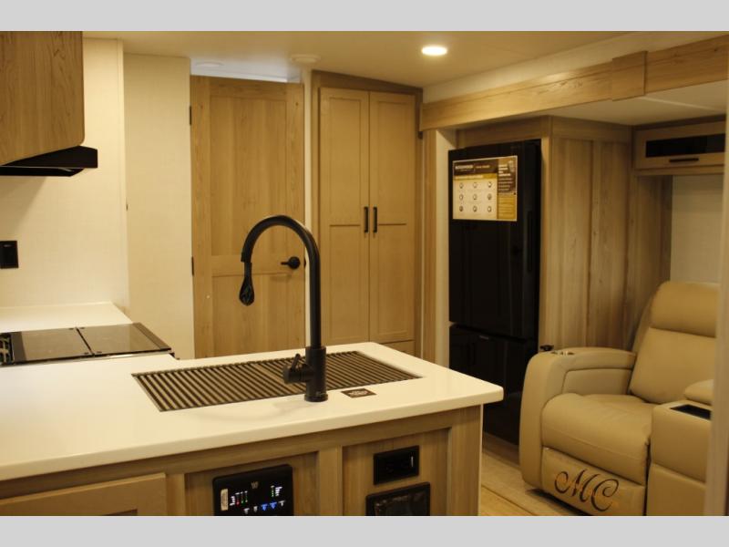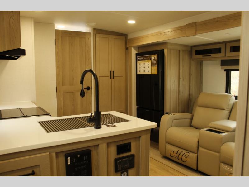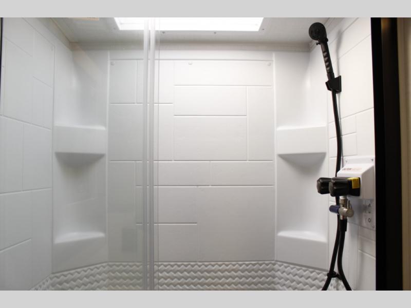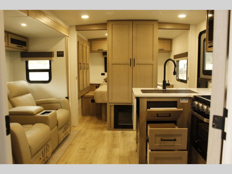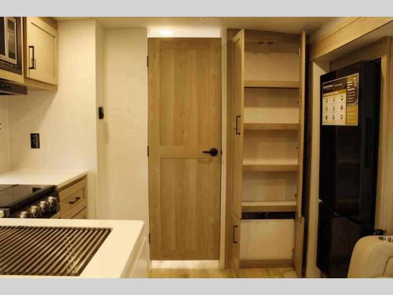 This is the perfect travel trailer for two people looking for comfortable camping trips! You will have your own RV queen bed to sleep on in the front private bedroom, and an optional TV can be added if you enjoy the morning news in bed. Breakfast can be made on the three burner cooktop, or head outdoors to cook on the outside kitchen. The theater seating with a table will provide a place to relax and dine together, and the spacious full rear bath will allow you to clean up before you head out for the day. This model includes plenty of storage space, including two pantries, a wardrobe slide out in the bedroom, plus a drop-frame pass-through storage for larger camp gear!