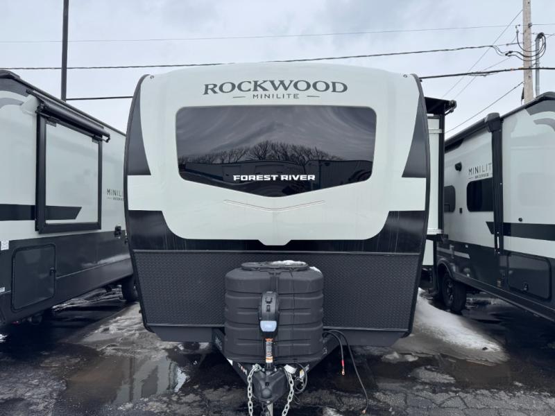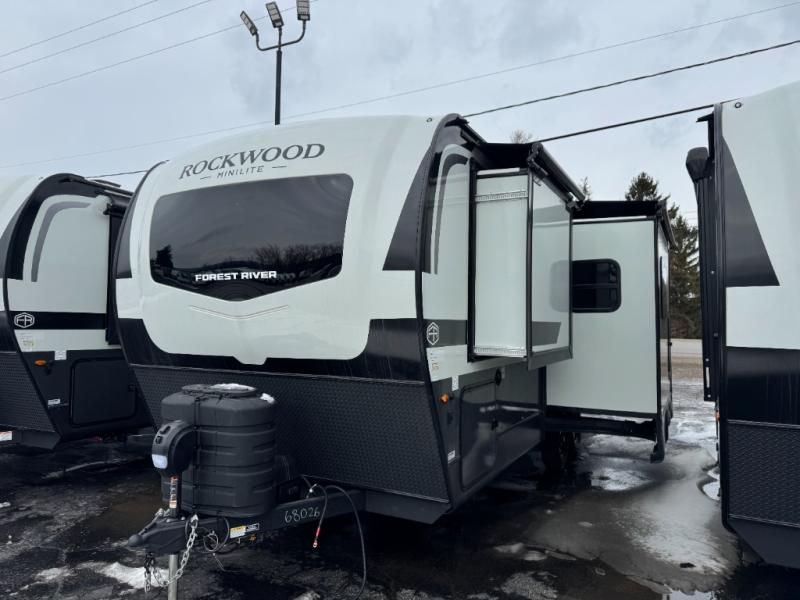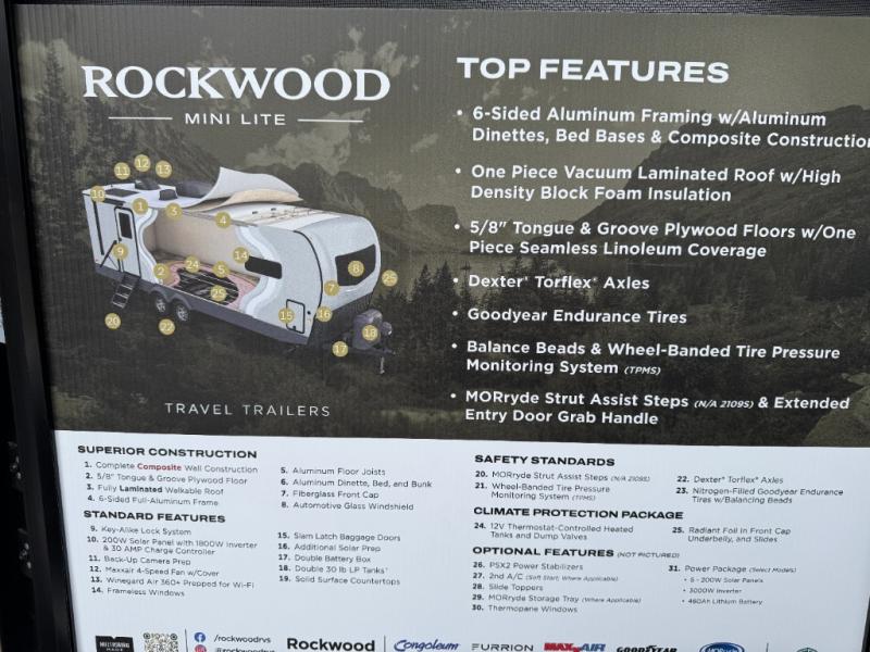 Each Rockwood Mini Lite travel trailer by Forest River is constructed with a fully laminated one-piece walkable roof, sleek frameless windows, and a six-sided full aluminum frame for strength and durability. The 12V thermostatically controlled heated tanks, plus radiant foil in the underbelly will allow you to camp well into the colder months, and the 200W roof solar panel will be perfect for a little off-gridding. Each model includes solid surface kitchen countertops, hidden hinge cabinet doors, roller shades, plus many more interior features. Having an AIR 360+ omnidirectional antenna with WiFi prep on board gives you the option to get some work done if it's needed, and the power tongue jack provides hassle-free set up, so you can enjoy more time relaxing!