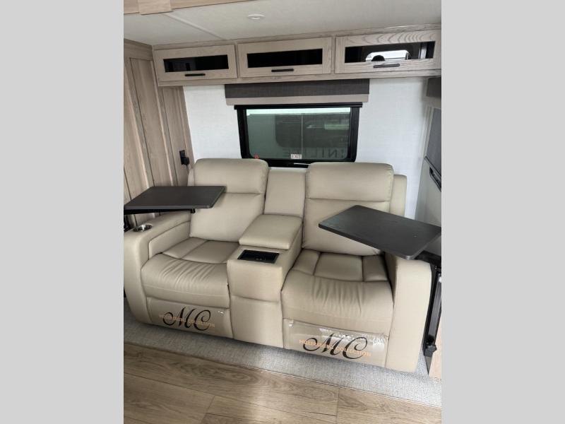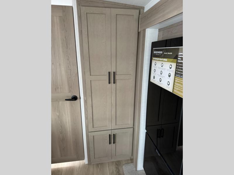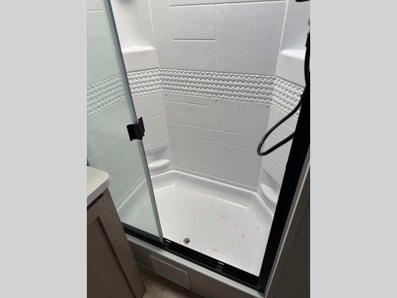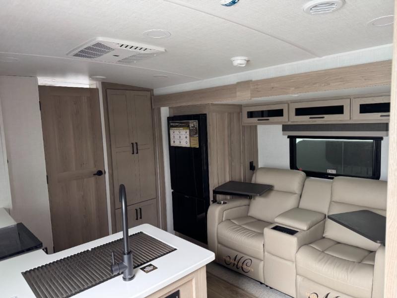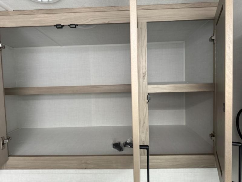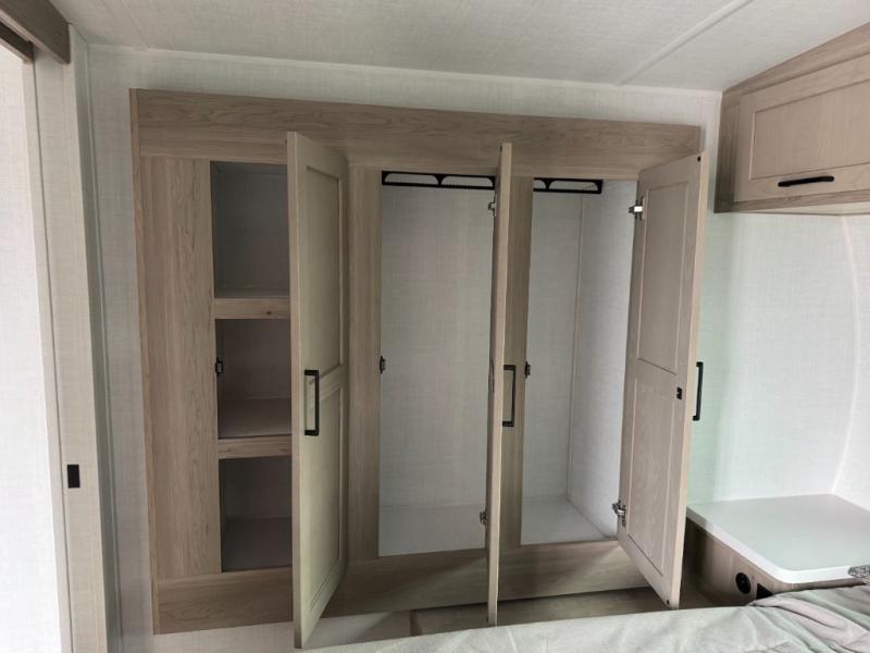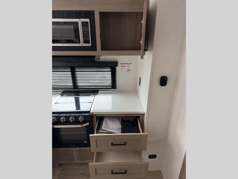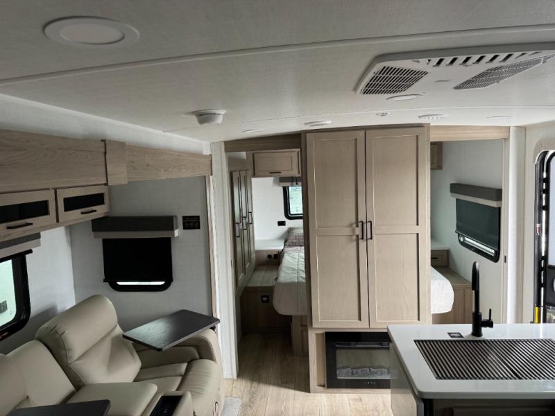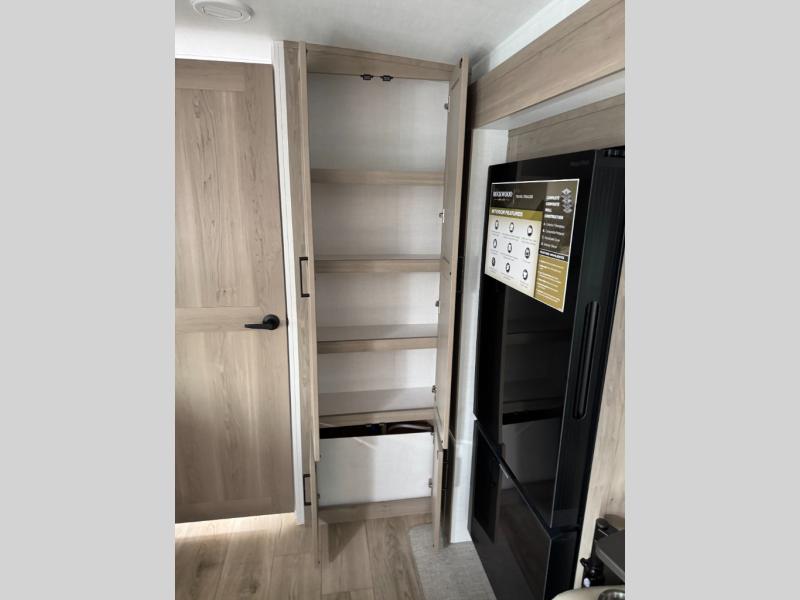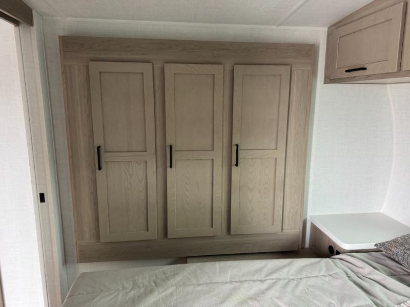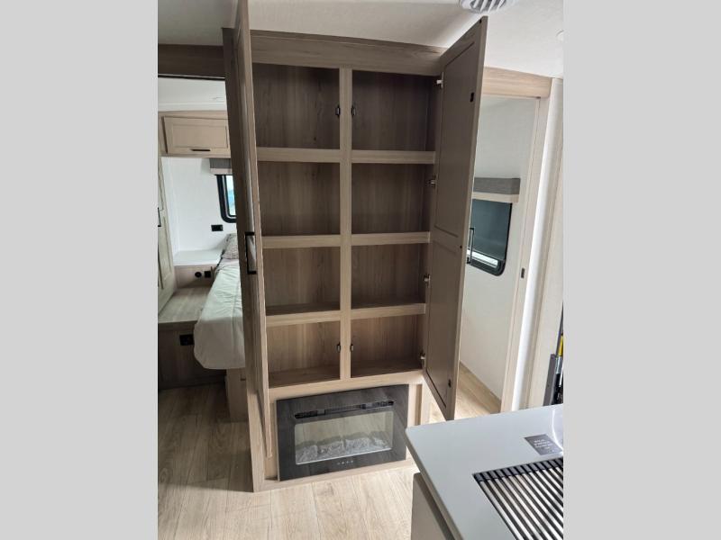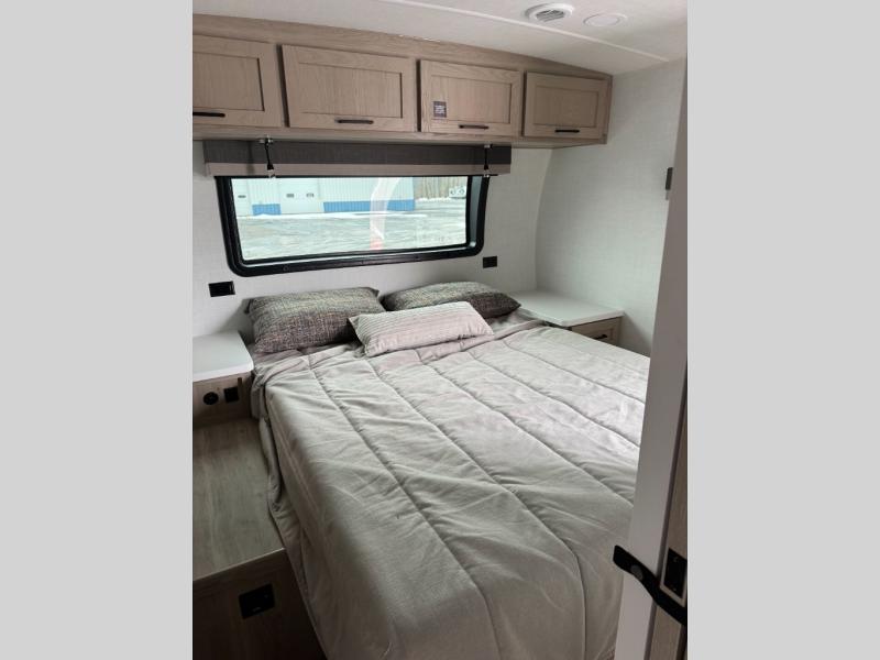 This is the perfect travel trailer for two people looking for comfortable camping trips! You will have your own RV queen bed to sleep on in the front private bedroom, and an optional TV can be added if you enjoy the morning news in bed. Breakfast can be made on the three burner cooktop, or head outdoors to cook on the outside kitchen. The theater seating with a table will provide a place to relax and dine together, and the spacious full rear bath will allow you to clean up before you head out for the day. This model includes plenty of storage space, including two pantries, a wardrobe slide out in the bedroom, plus a drop-frame pass-through storage for larger camp gear!