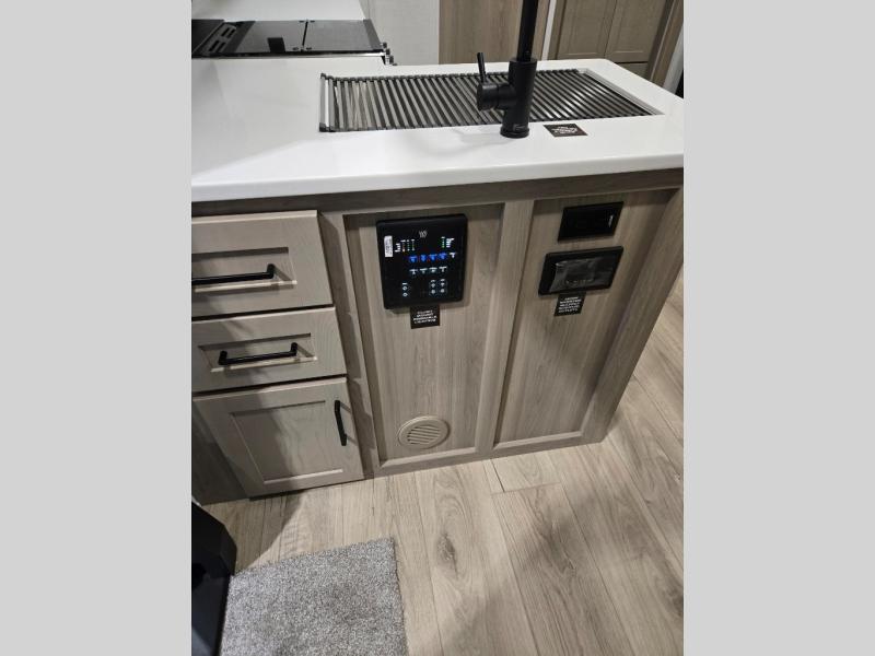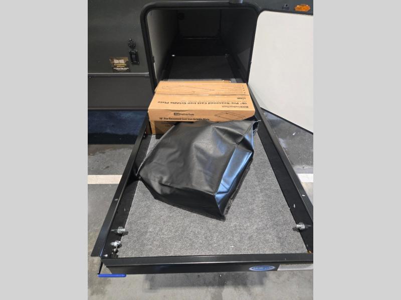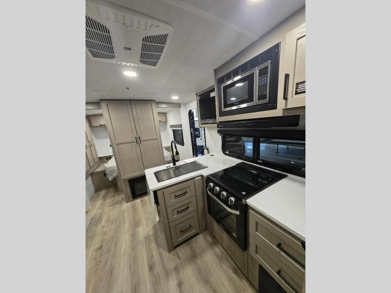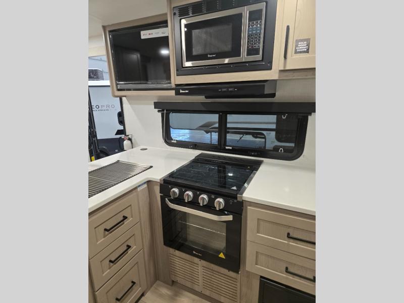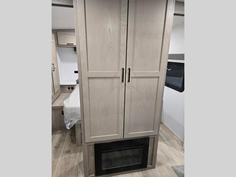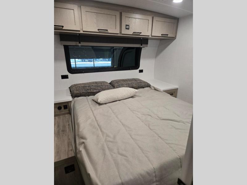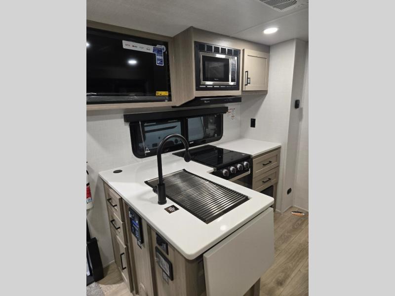 This is the perfect travel trailer for two people looking for comfortable camping trips! You will have your own RV queen bed to sleep on in the front private bedroom, and an optional TV can be added if you enjoy the morning news in bed. Breakfast can be made on the three-burner cooktop, or head outdoors to cook on the outside kitchen. The theater seating with tables will provide a place to relax and dine together, and the spacious full rear bath will allow you to clean up before you head out for the day. This model includes plenty of storage space, including two pantries, a wardrobe slide out in the bedroom, plus a drop-frame pass-through storage for larger camp gear!