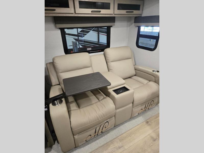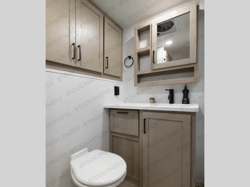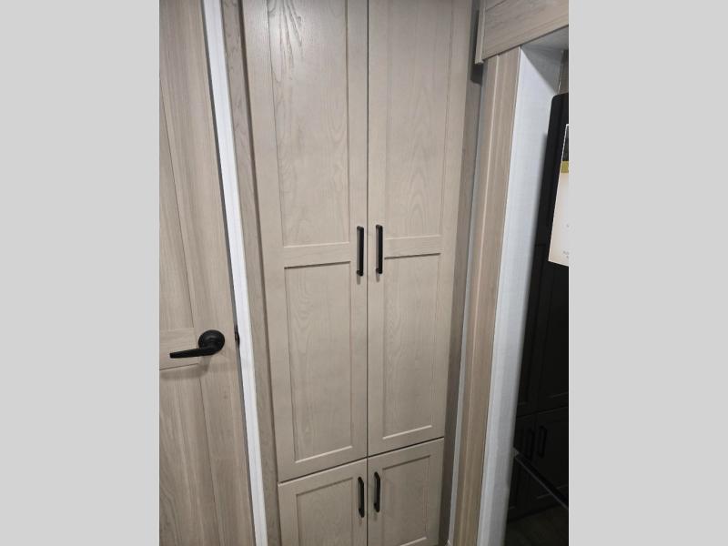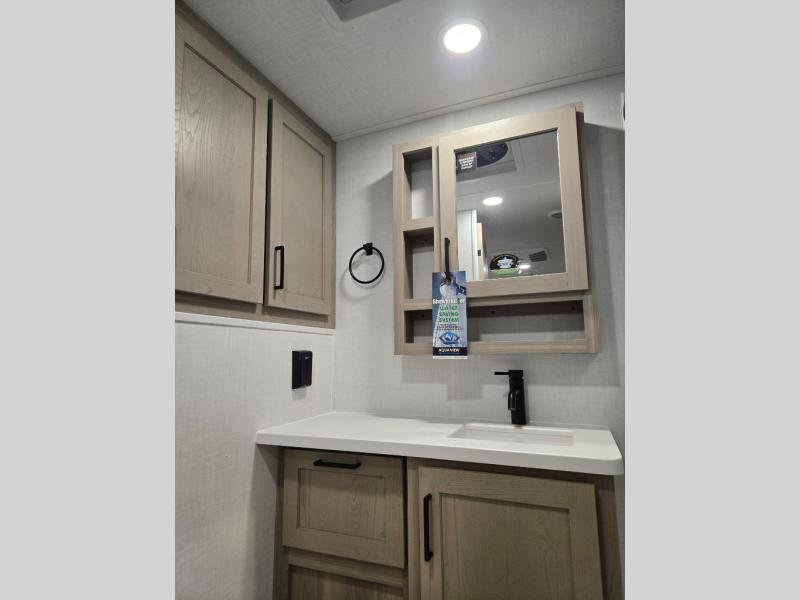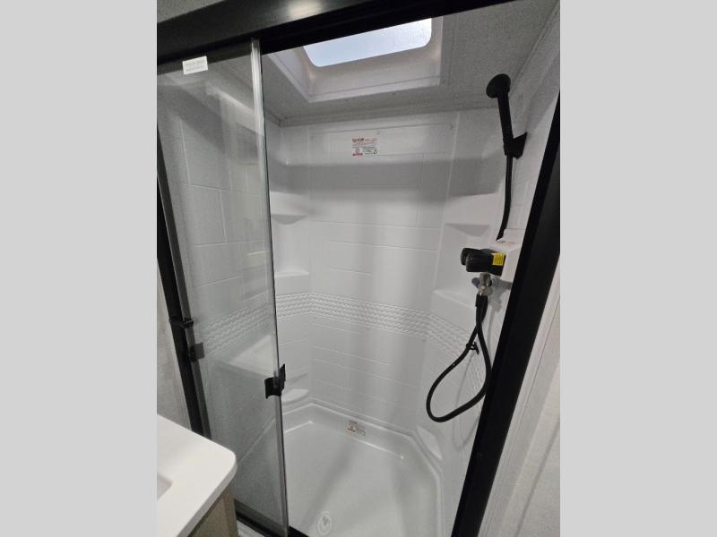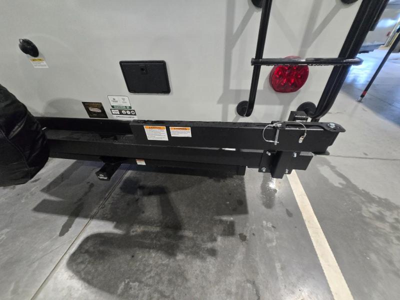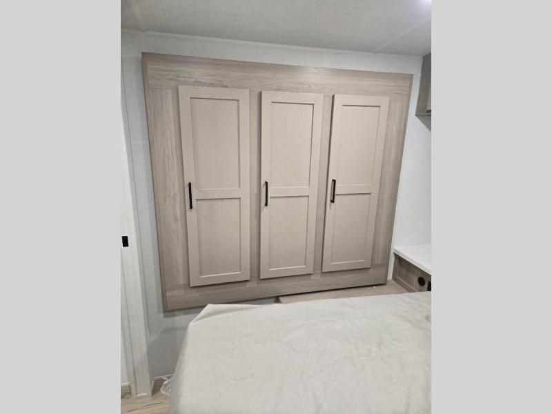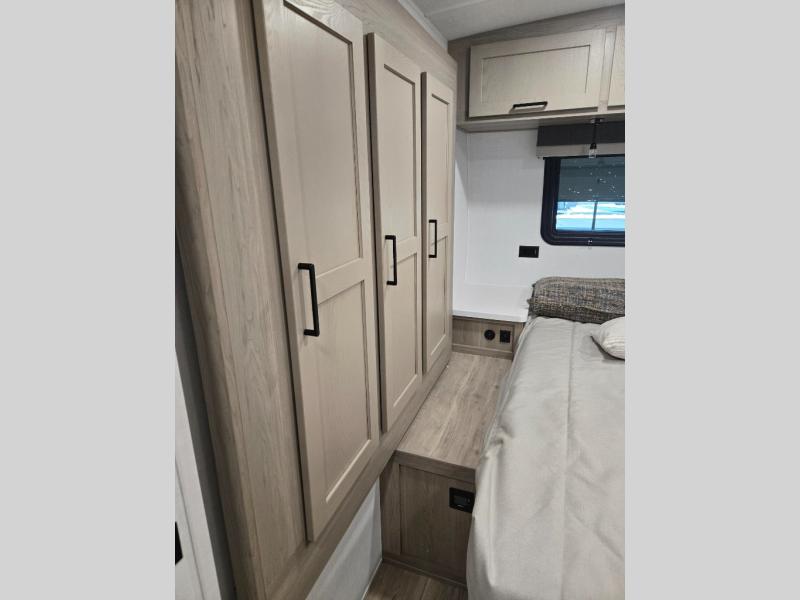 This is the perfect travel trailer for two people looking for comfortable camping trips! You will have your own RV queen bed to sleep on in the front private bedroom, and an optional TV can be added if you enjoy the morning news in bed. Breakfast can be made on the three-burner cooktop, or head outdoors to cook on the outside kitchen. The theater seating with tables will provide a place to relax and dine together, and the spacious full rear bath will allow you to clean up before you head out for the day. This model includes plenty of storage space, including two pantries, a wardrobe slide out in the bedroom, plus a drop-frame pass-through storage for larger camp gear!