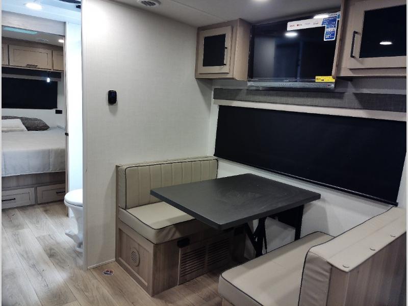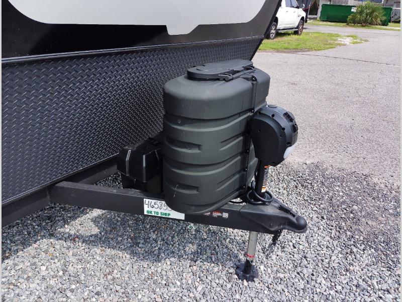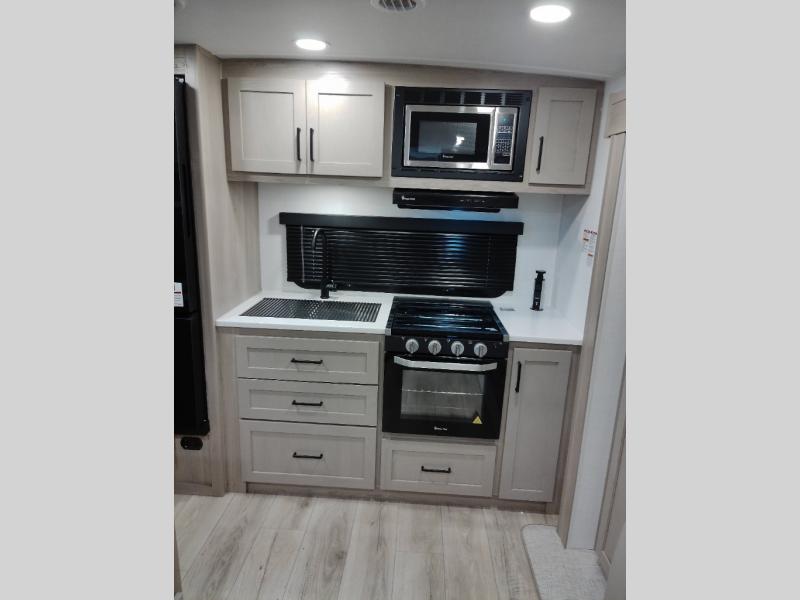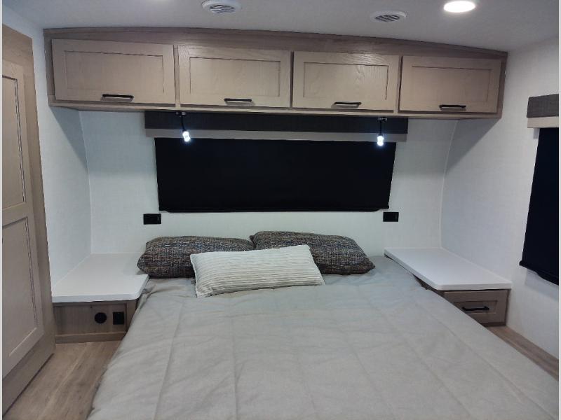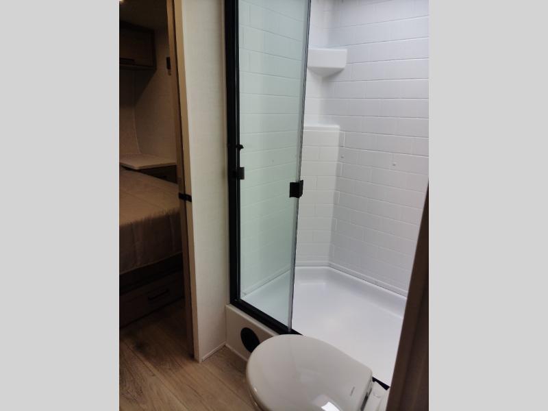 You and your spouse will have a great time camping in this travel trailer! You will have your own RV queen bed to sleep on in the front private bedroom, and an optional TV can be added if you enjoy the morning news in bed. Breakfast can be made on the three burner cooktop in the rear kitchen, or head outdoors to cook on the outside griddle. The 67" theater seating with cupholders will provide a place to relax and dine together, and the spacious walk-through bath will allow you to clean up before you head out for the day. This model includes plenty of storage space, including a pantry for your snacks, a wardrobe slide out in the bedroom, plus a drop-frame pass-through storage for larger camp gear!
