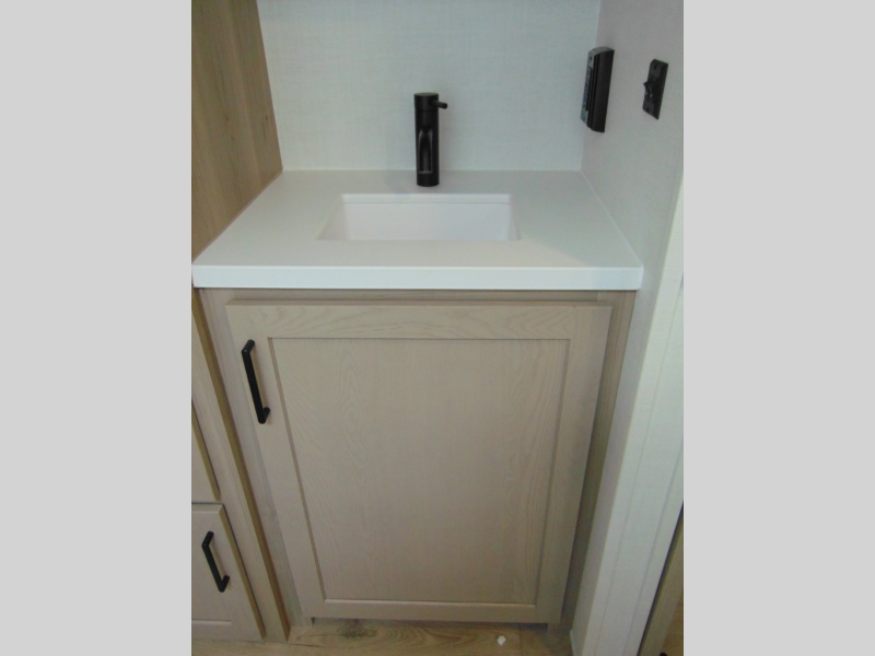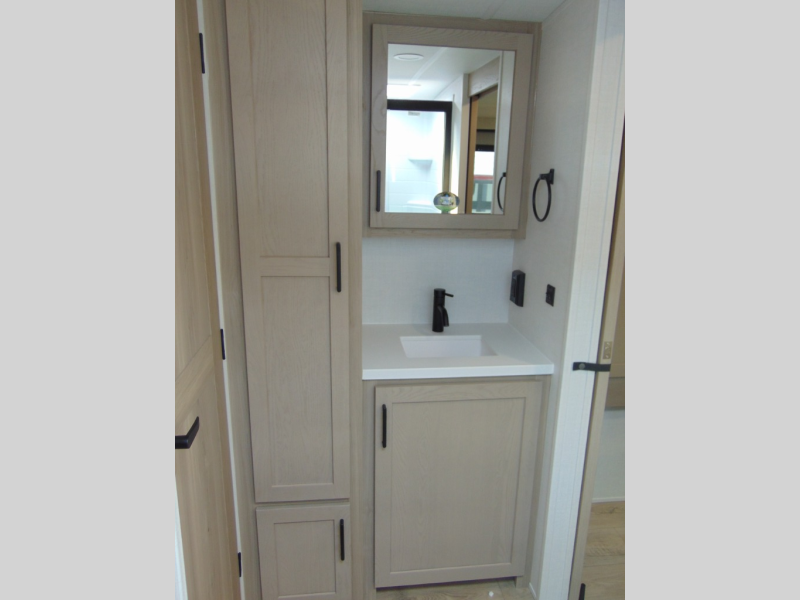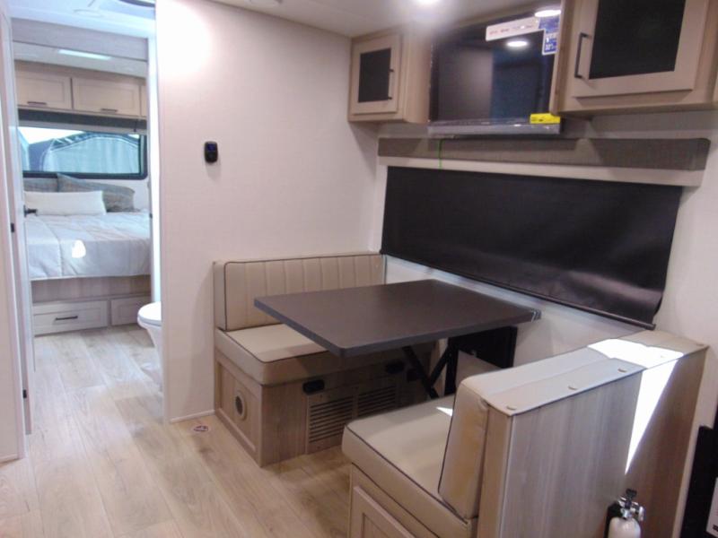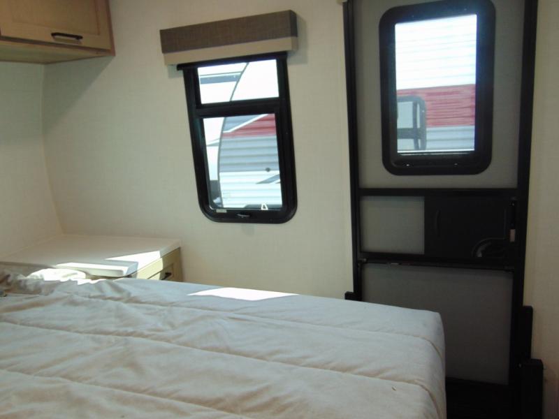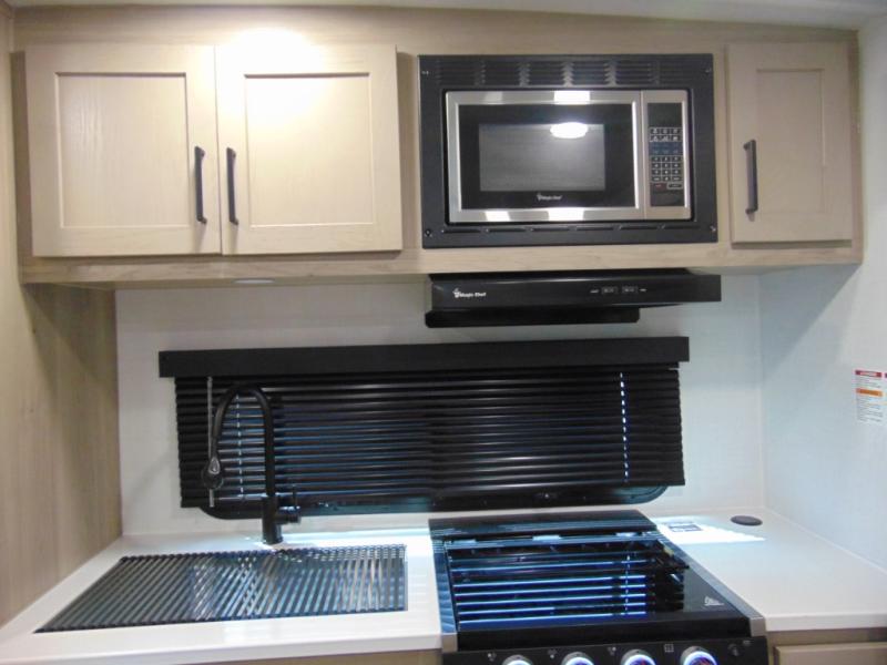 You and your spouse will have a great time camping in this travel trailer! You will have your own RV queen bed to sleep on in the front private bedroom, and an optional TV can be added if you enjoy the morning news in bed. Breakfast can be made on the three burner cooktop in the rear kitchen, or head outdoors to cook on the outside griddle. The 67" theater seating with cupholders will provide a place to relax and dine together, and the spacious walk-through bath will allow you to clean up before you head out for the day. This model includes plenty of storage space, including a pantry for your snacks, a wardrobe slide out in the bedroom, plus a drop-frame pass-through storage for larger camp gear!