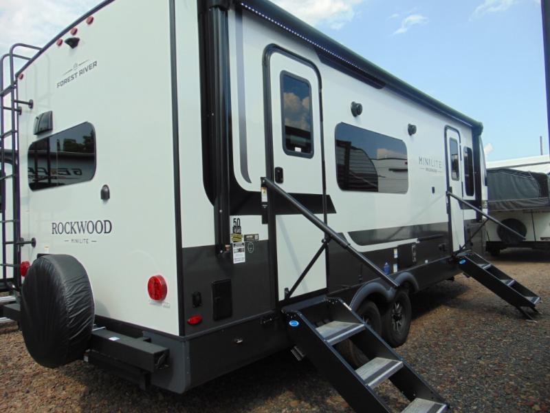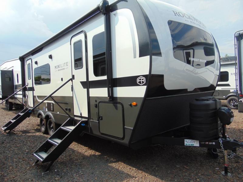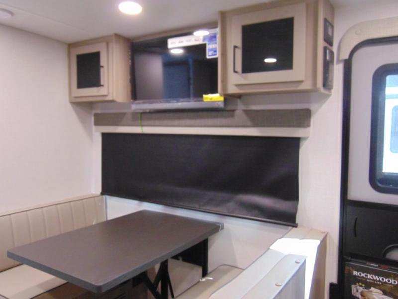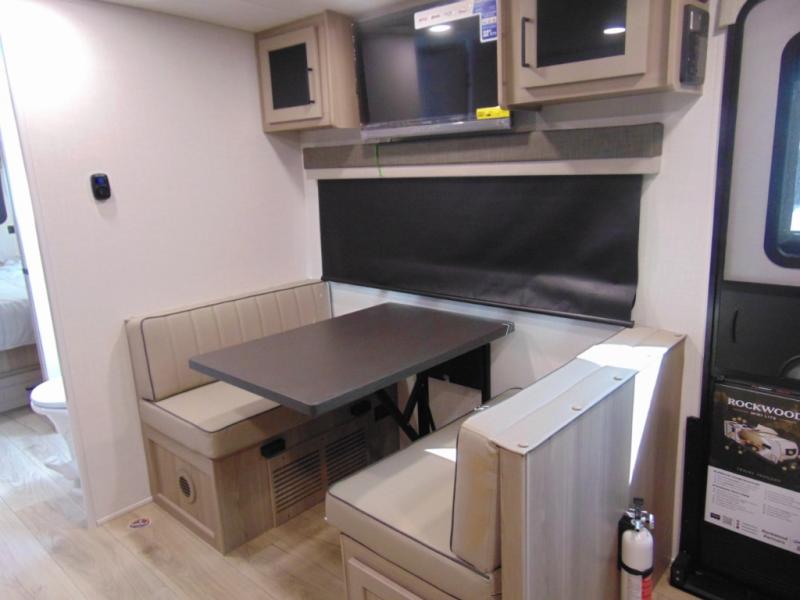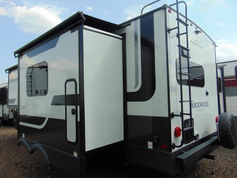 Each Rockwood Mini Lite travel trailer by Forest River is constructed with a fully laminated one-piece walkable roof, sleek frameless windows, and a six-sided full aluminum frame for strength and durability. The 12V thermostatically controlled heated tanks, plus radiant foil in the underbelly and slide out floors will allow you to camp well into the colder months, and the 200W roof solar panel will be perfect for a little off-gridding. Each model includes solid surface kitchen countertops, solid wood cabinet doors, night roller shades, plus many more interior features. Having an AIR 360+ omnidirectional antenna with WiFi prep on board gives you the option to get some work done if it's needed, and the power tongue jack provides hassle-free set up, so you can enjoy more time relaxing!
