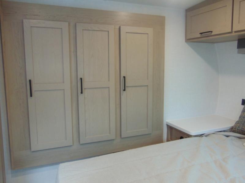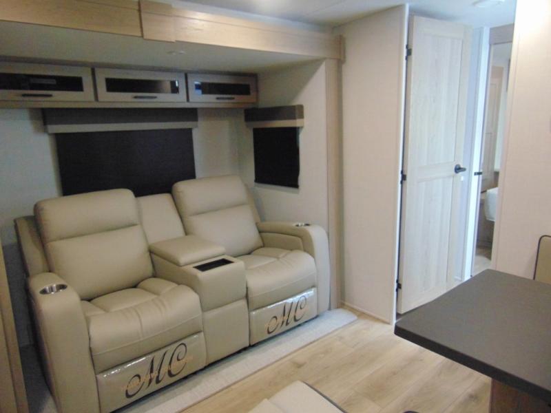 FRONT QUEEN BEDROOM with WARDROBE SLIDEOUT--THEATER SEATING IN SLIDEOUT across from SLEEPER DINETTE