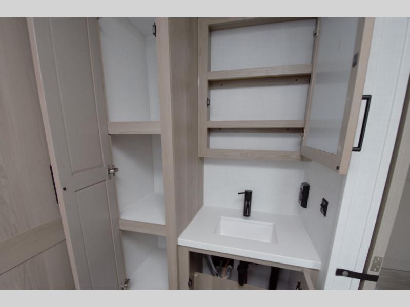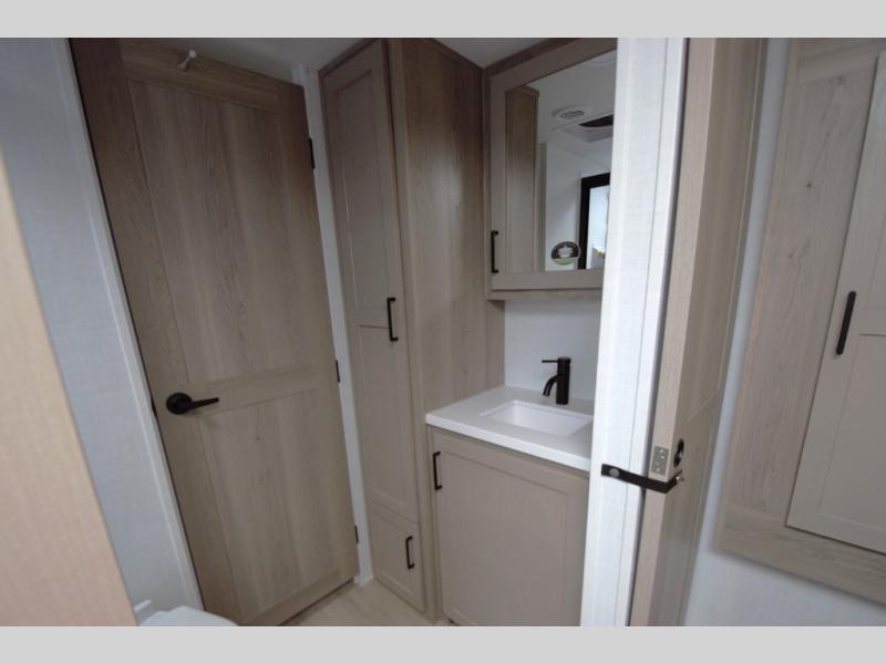 The walk through bathroom provides extra space to move around and leads into the private front bedroom, which includes a wardrobe slide, overhead storage, and an RV queen bed. Dual entry doors make it easy to enter from the bedroom or main living area.