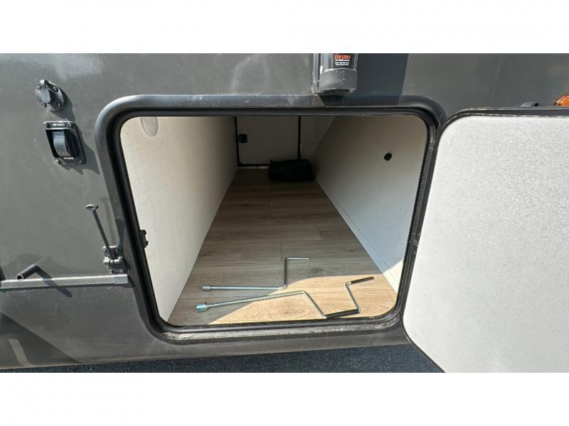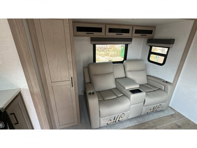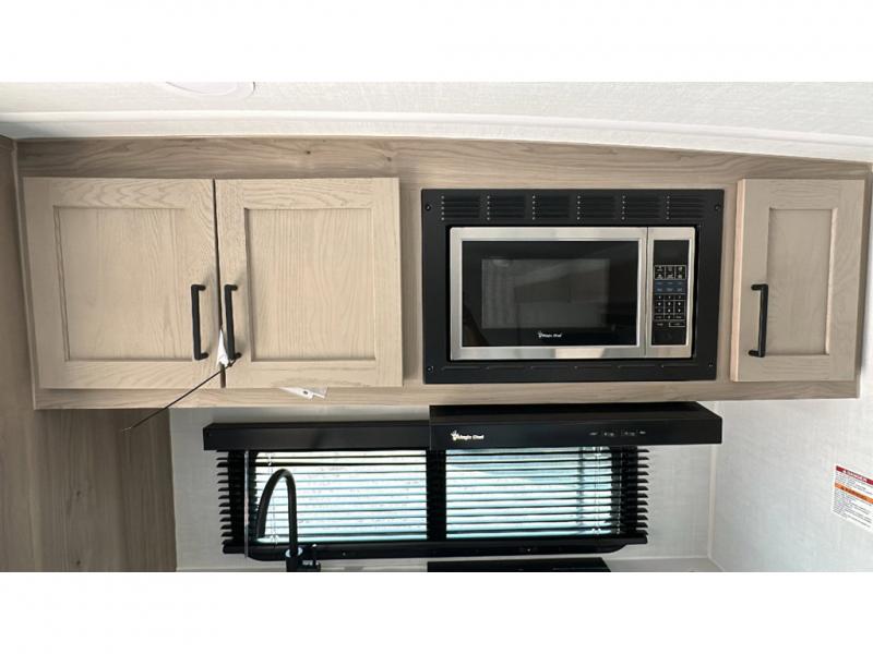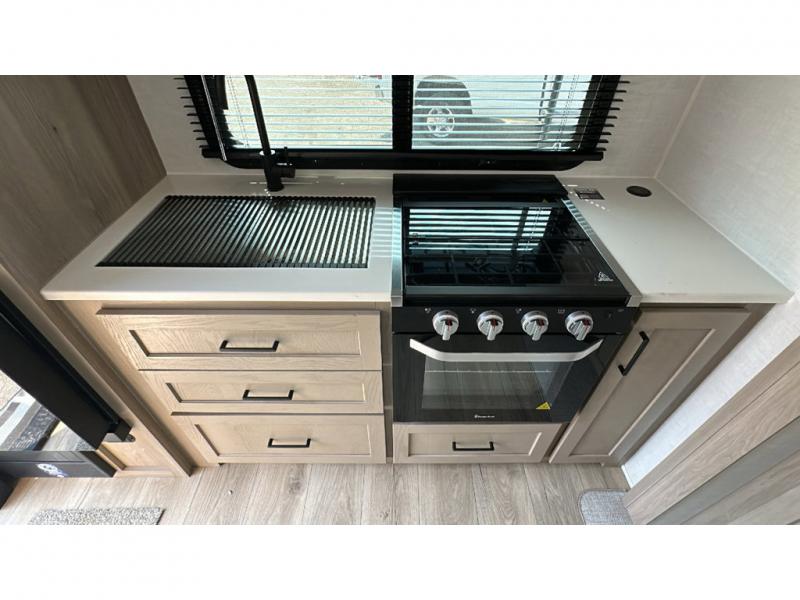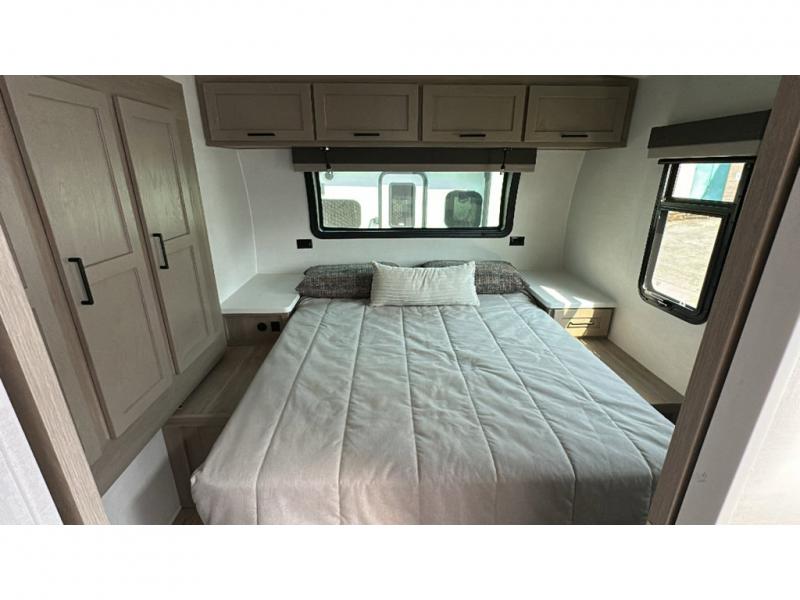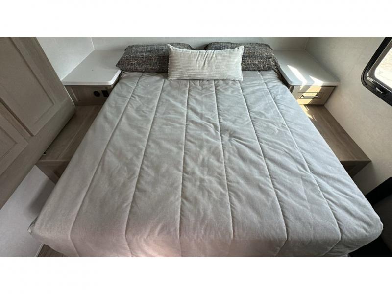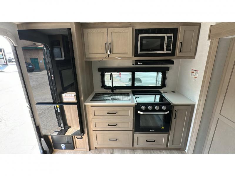 You and your spouse will have a great time camping in this travel trailer! You will have your own RV queen bed to sleep on in the front private bedroom, and an optional TV can be added if you enjoy the morning news in bed. Breakfast can be made on the three burner cooktop in the rear kitchen, or head outdoors to cook on the outside griddle. The 67" theater seating with cupholders will provide a place to relax and dine together, and the spacious walk-through bath will allow you to clean up before you head out for the day. This model includes plenty of storage space, including a pantry for your snacks, a wardrobe slide out in the bedroom, plus a drop-frame pass-through storage for larger camp gear!
