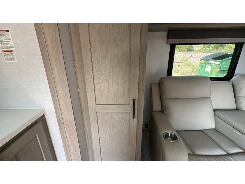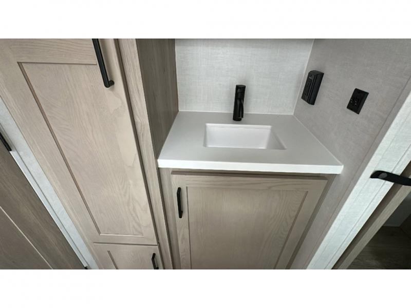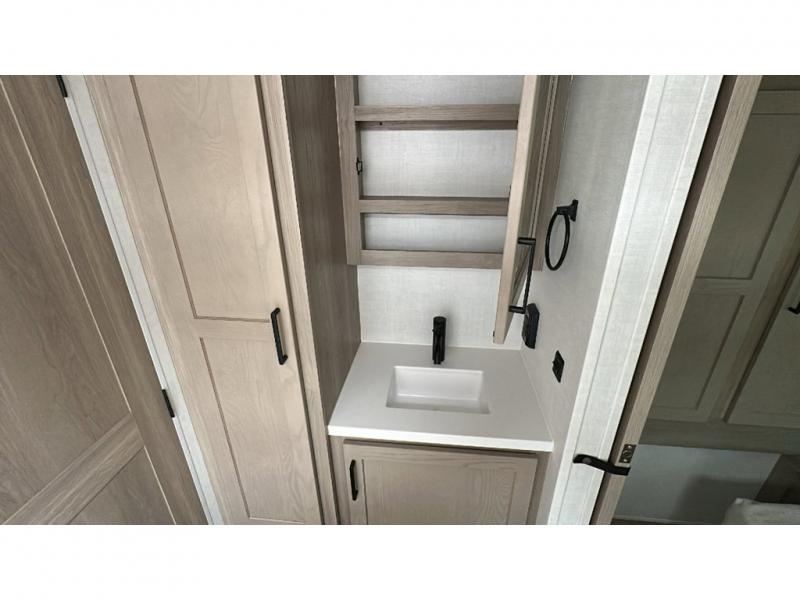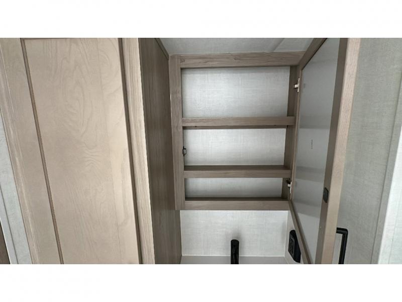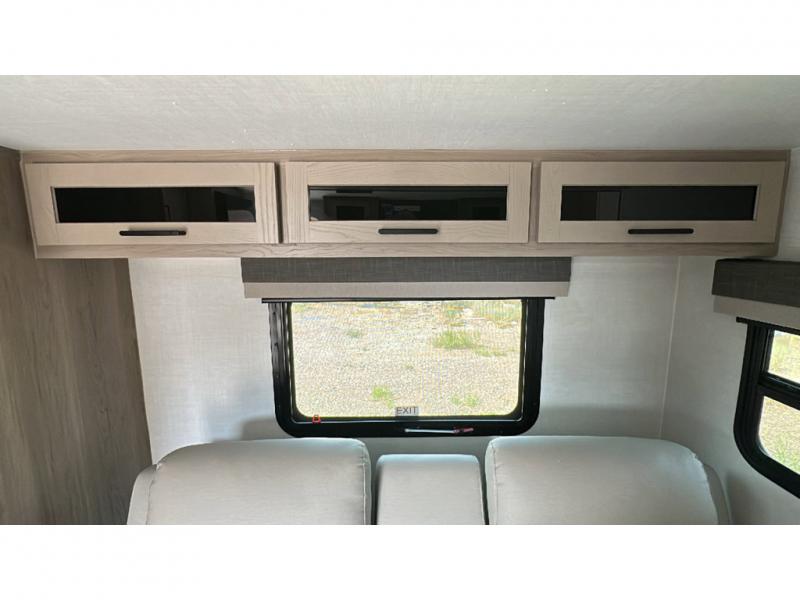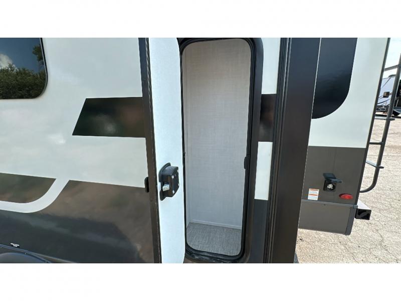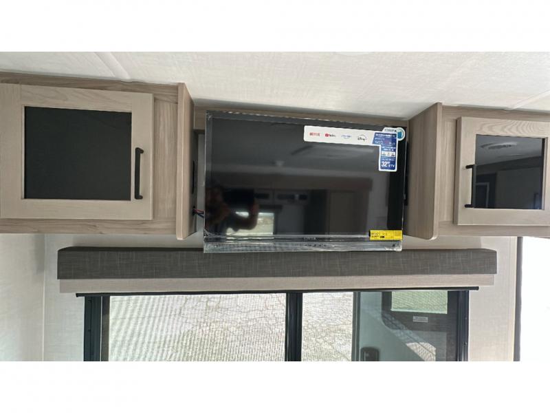 You and your spouse will have a great time camping in this travel trailer! You will have your own RV queen bed to sleep on in the front private bedroom, and an optional TV can be added if you enjoy the morning news in bed. Breakfast can be made on the three burner cooktop in the rear kitchen, or head outdoors to cook on the outside griddle. The 67" theater seating with cupholders will provide a place to relax and dine together, and the spacious walk-through bath will allow you to clean up before you head out for the day. This model includes plenty of storage space, including a pantry for your snacks, a wardrobe slide out in the bedroom, plus a drop-frame pass-through storage for larger camp gear!
