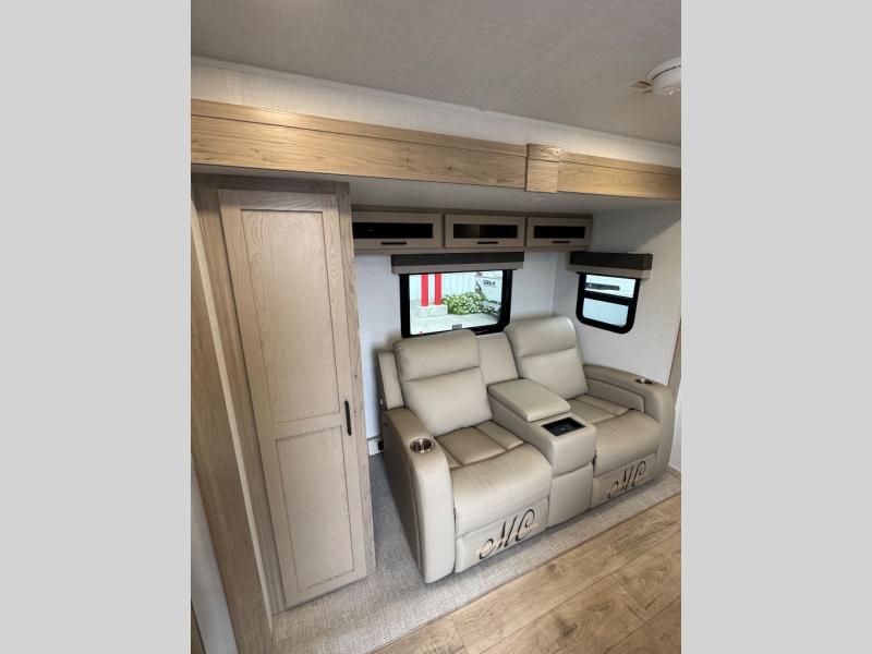You and your spouse will have a great time camping in this travel trailer! You will have your own RV queen bed to sleep on in the front private bedroom, and an optional TV can be added if you enjoy the morning news in bed. Breakfast can be made on the three burner cooktop in the rear kitchen, or head outdoors to cook on the outside griddle. The 67" theater seating with cupholders will provide a place to relax and dine together, and the spacious walk-through bath will allow you to clean up before you head out for the day. This model includes plenty of storage space, including a pantry for your snacks, a wardrobe slide out in the bedroom, plus a drop-frame pass-through storage for larger camp gear!