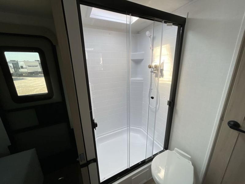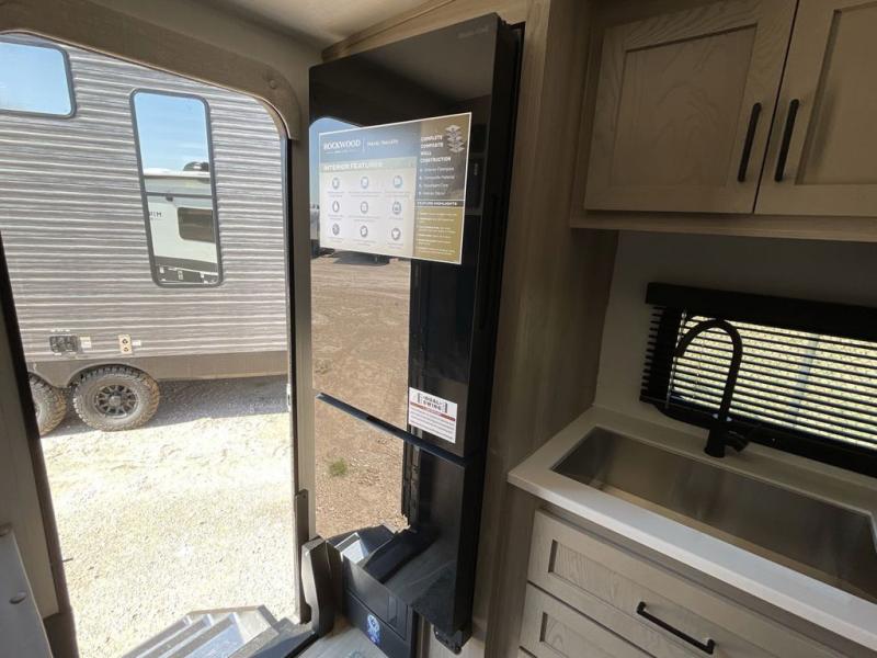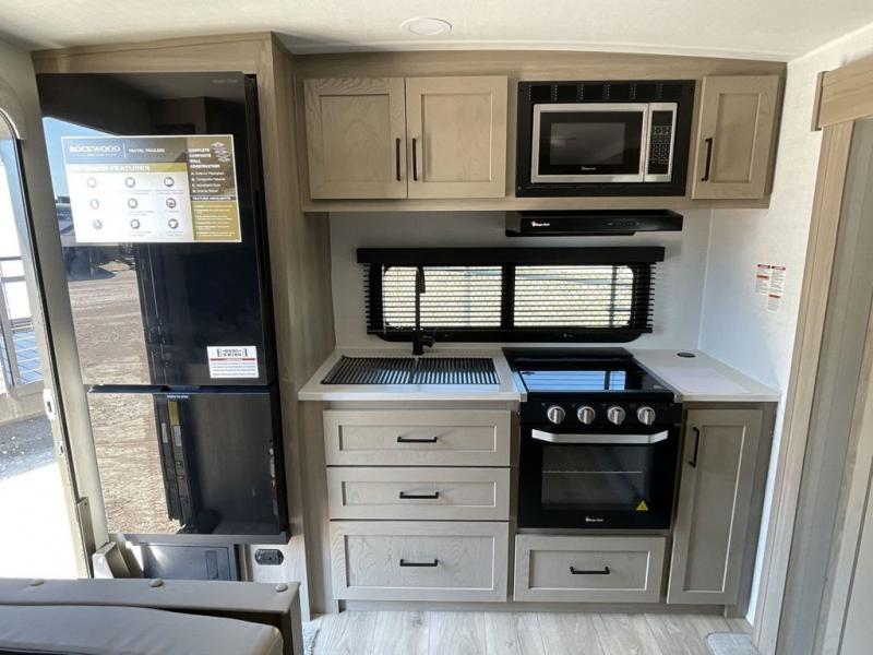 Each Rockwood Mini Lite travel trailer by Forest River is constructed with a fully laminated one-piece walkable roof, sleek frameless windows, and a six-sided full aluminum frame for strength and durability. The 12V thermostatically controlled heated tanks, plus radiant foil in the underbelly will allow you to camp well into the colder months, and the 200W roof solar panel will be perfect for a little off-gridding. Each model includes solid surface kitchen countertops, hidden hinge cabinet doors, roller shades, plus many more interior features. Having an AIR 360+ omnidirectional antenna with WiFi prep on board gives you the option to get some work done if it's needed, and the power tongue jack provides hassle-free set up, so you can enjoy more time relaxing!