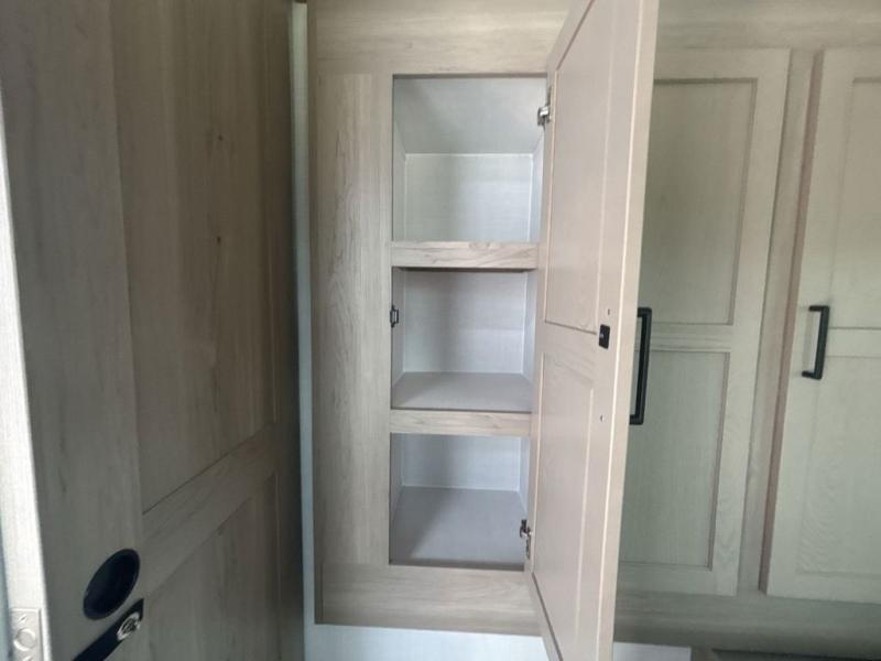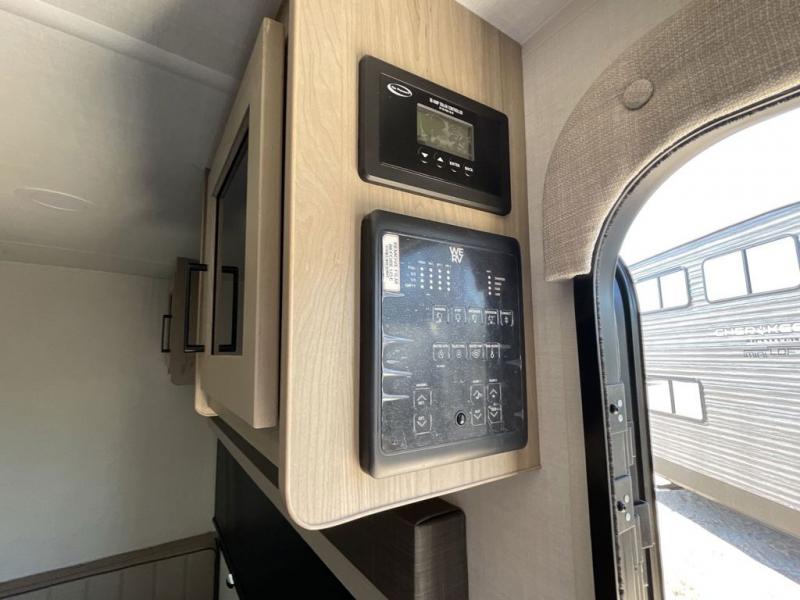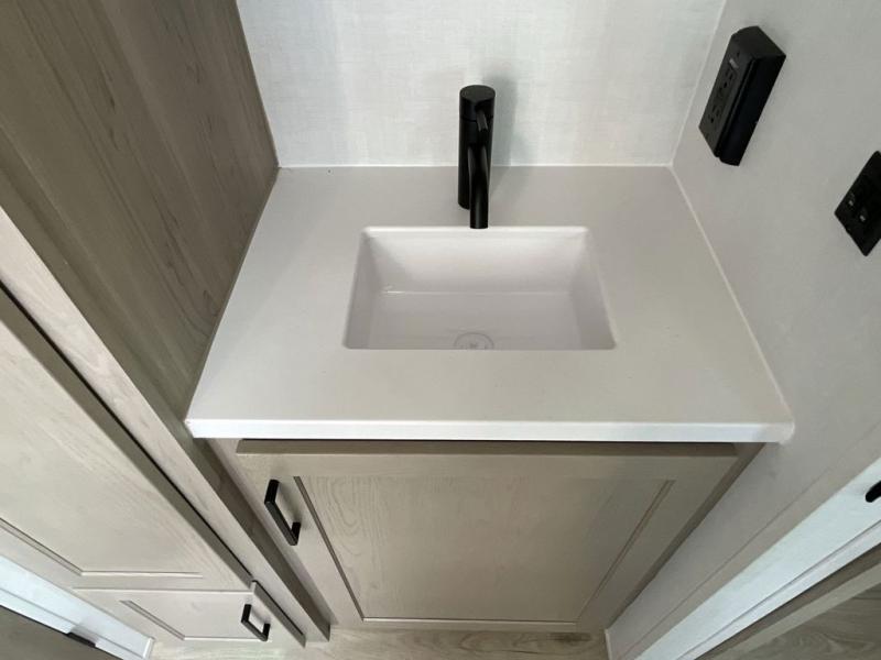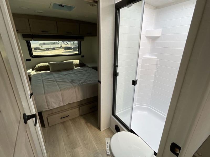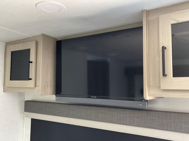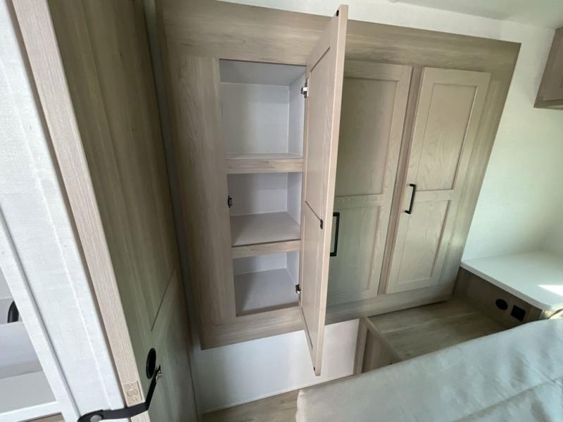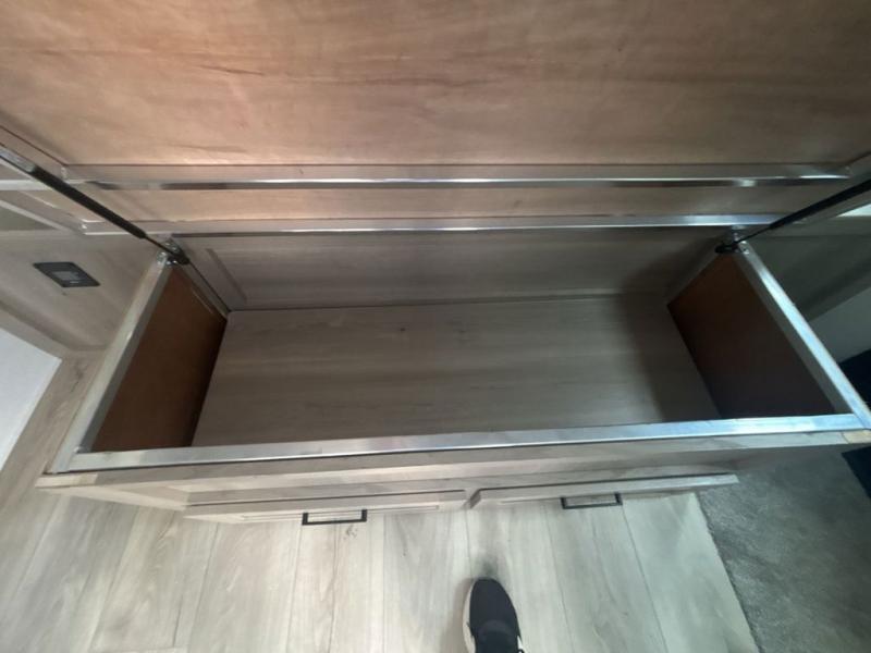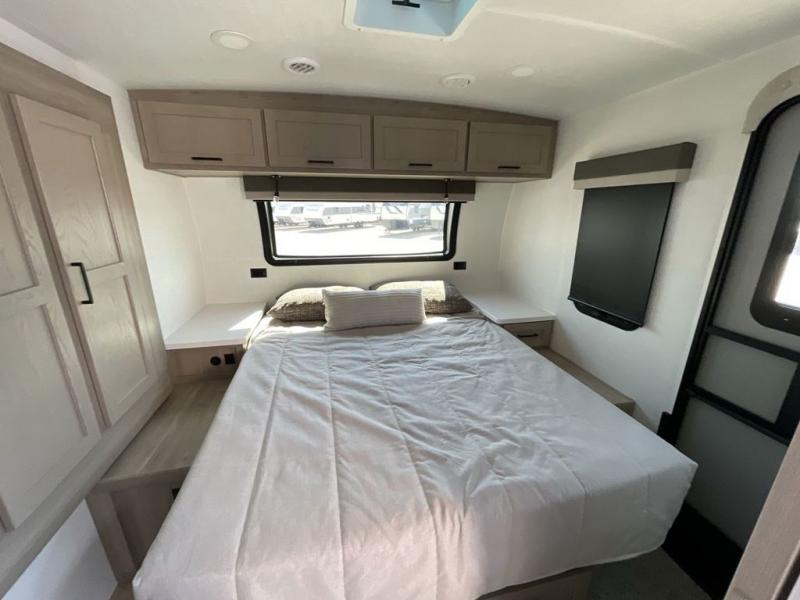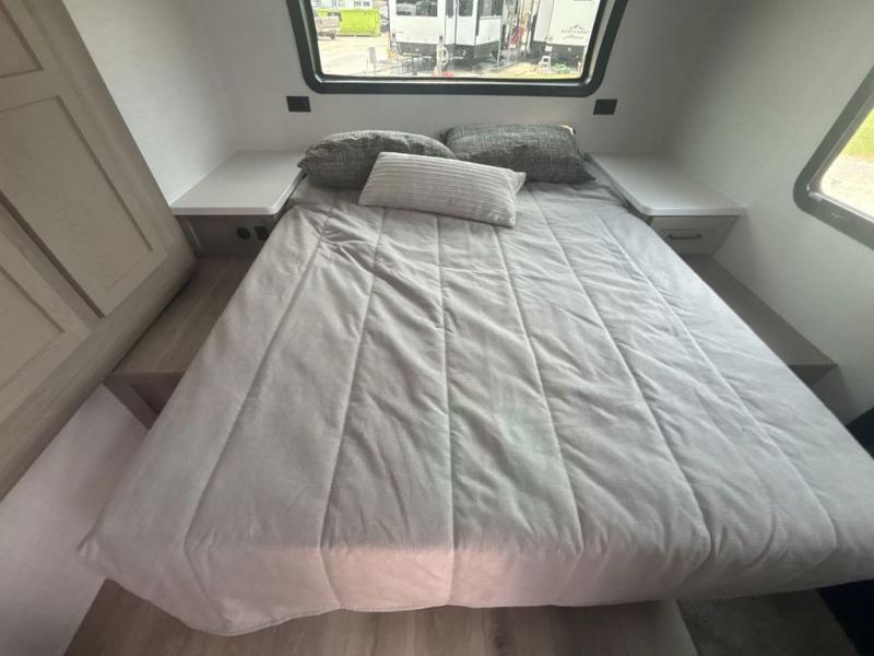 You and your spouse will have a great time camping in this travel trailer! You will have your own RV queen bed to sleep on in the front private bedroom, and an optional TV can be added if you enjoy the morning news in bed. Breakfast can be made on the three burner cooktop in the rear kitchen, or head outdoors to cook on the outside griddle. The 67" theater seating with cupholders will provide a place to relax and dine together, and the spacious walk-through bath will allow you to clean up before you head out for the day. This model includes plenty of storage space, including a pantry for your snacks, a wardrobe slide out in the bedroom, plus a drop-frame pass-through storage for larger camp gear!