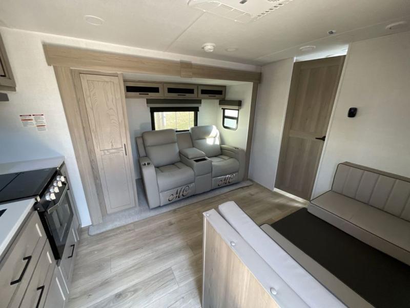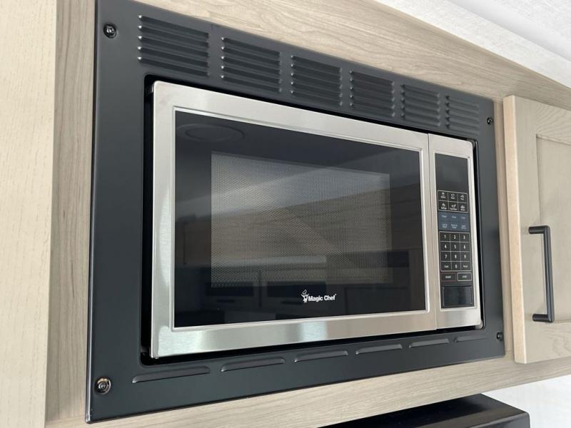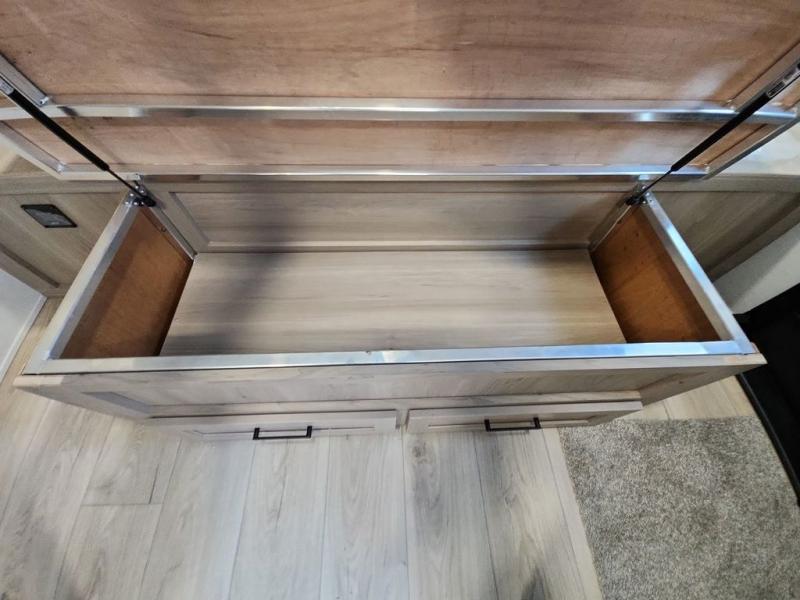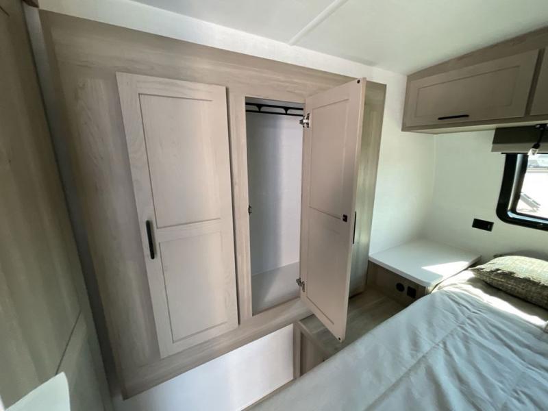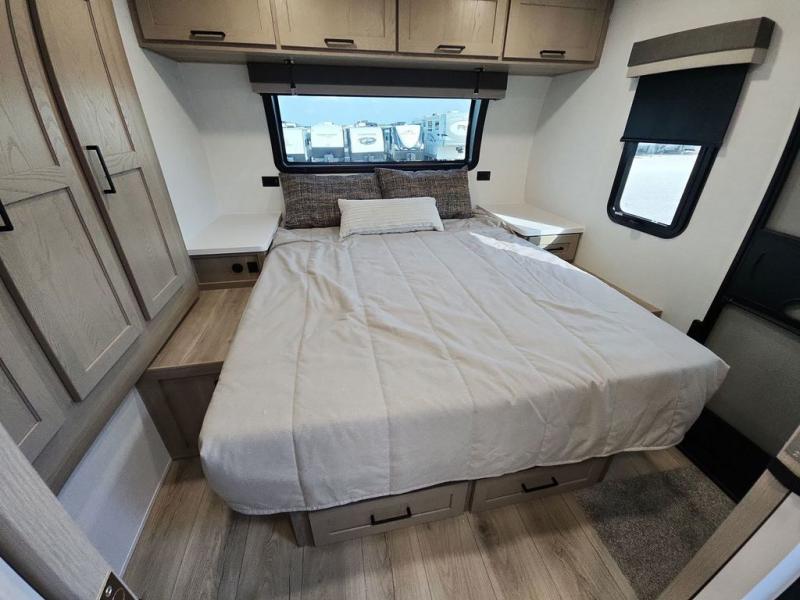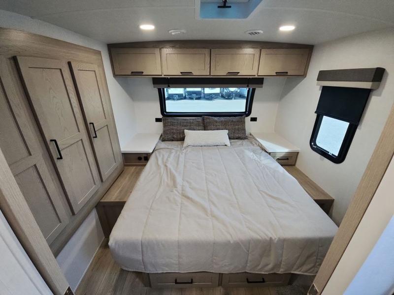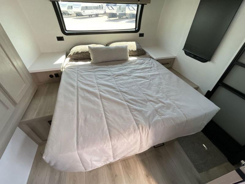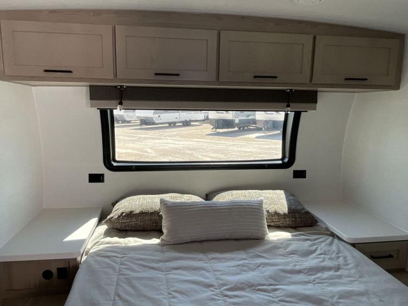 You and your spouse will have a great time camping in this travel trailer! You will have your own RV queen bed to sleep on in the front private bedroom, and an optional TV can be added if you enjoy the morning news in bed. Breakfast can be made on the three burner cooktop in the rear kitchen, or head outdoors to cook on the outside griddle. The 67" theater seating with cupholders will provide a place to relax and dine together, and the spacious walk-through bath will allow you to clean up before you head out for the day. This model includes plenty of storage space, including a pantry for your snacks, a wardrobe slide out in the bedroom, plus a drop-frame pass-through storage for larger camp gear!