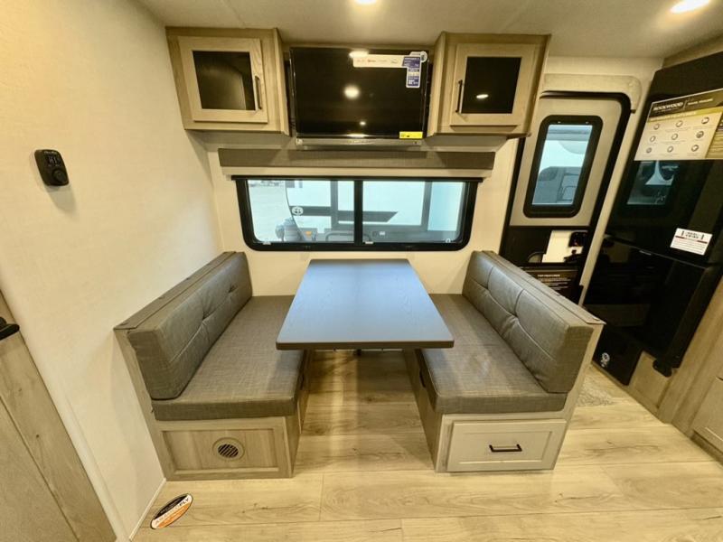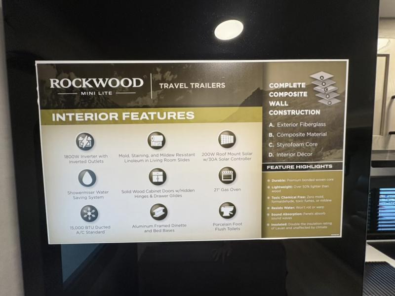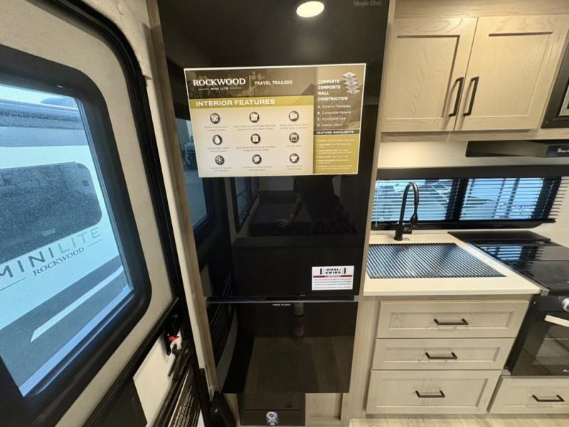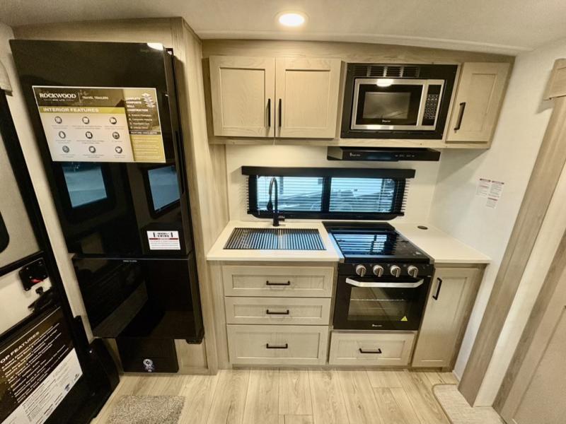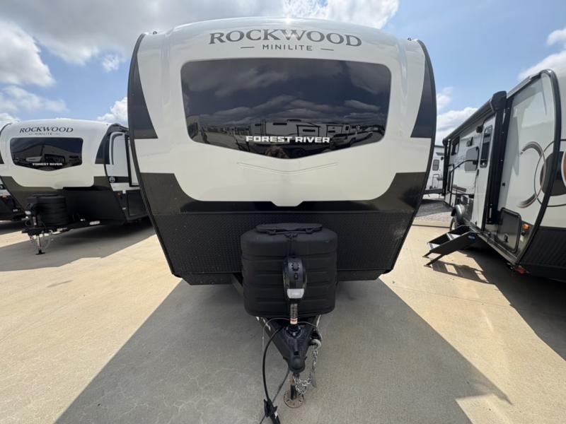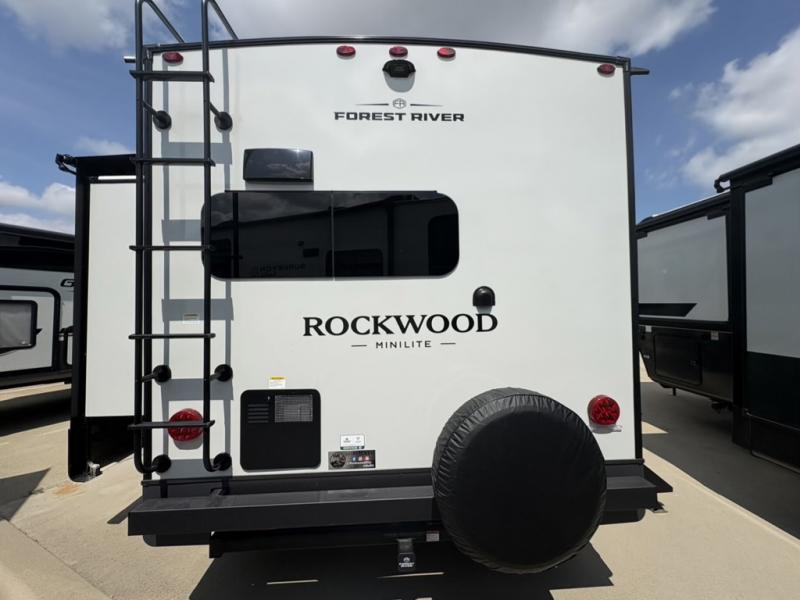 Each Rockwood Mini Lite travel trailer by Forest River is constructed with a fully laminated one-piece walkable roof, sleek frameless windows, and a six-sided full aluminum frame for strength and durability. The 12V thermostatically controlled heated tanks, plus radiant foil in the underbelly will allow you to camp well into the colder months, and the 200W roof solar panel will be perfect for a little off-gridding. Each model includes solid surface kitchen countertops, hidden hinge cabinet doors, roller shades, plus many more interior features. Having an AIR 360+ omnidirectional antenna with WiFi prep on board gives you the option to get some work done if it's needed, and the power tongue jack provides hassle-free set up, so you can enjoy more time relaxing!