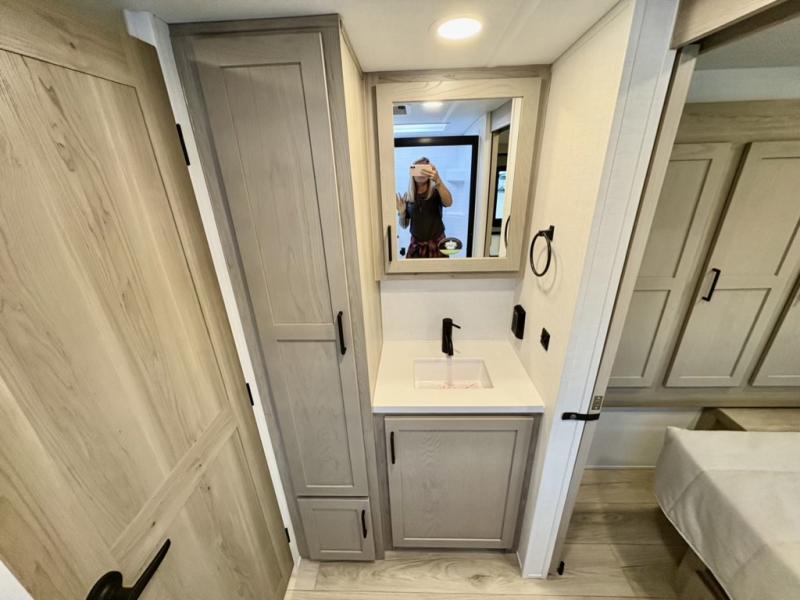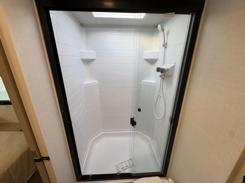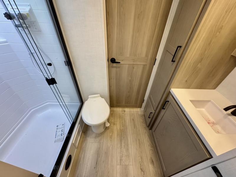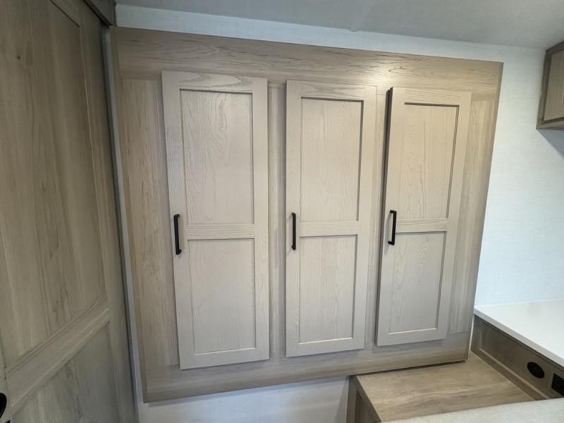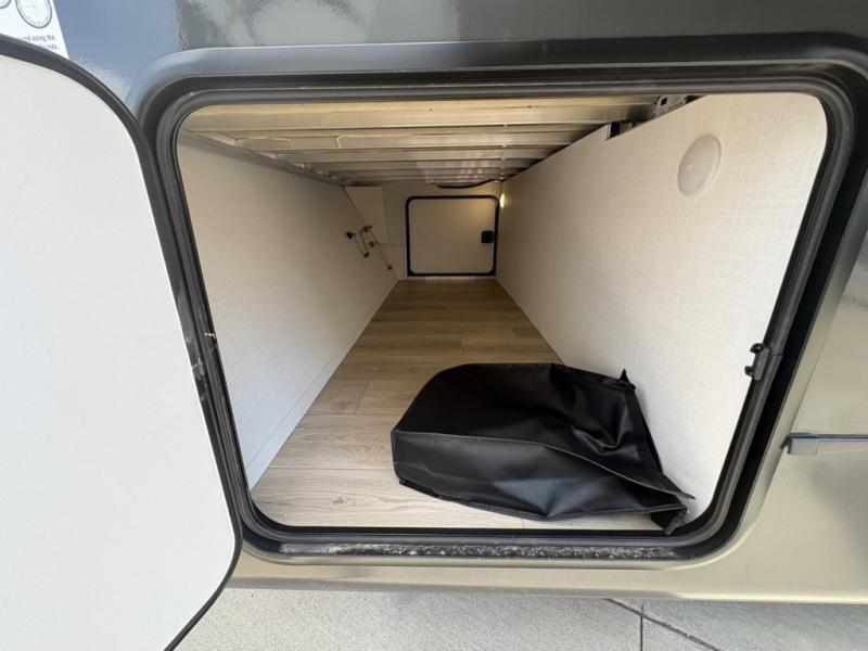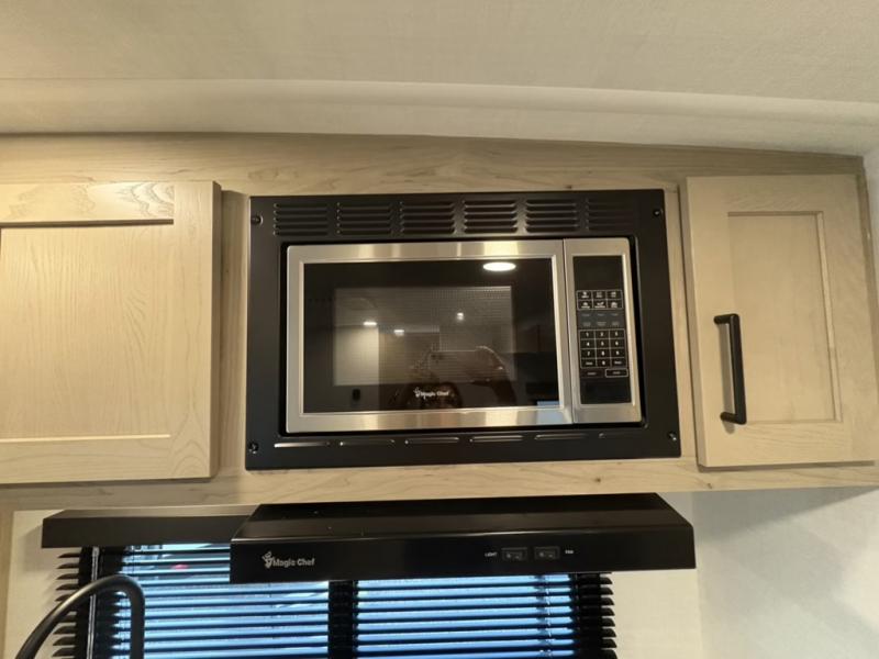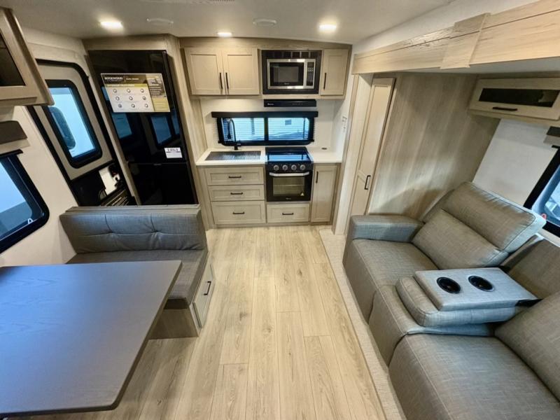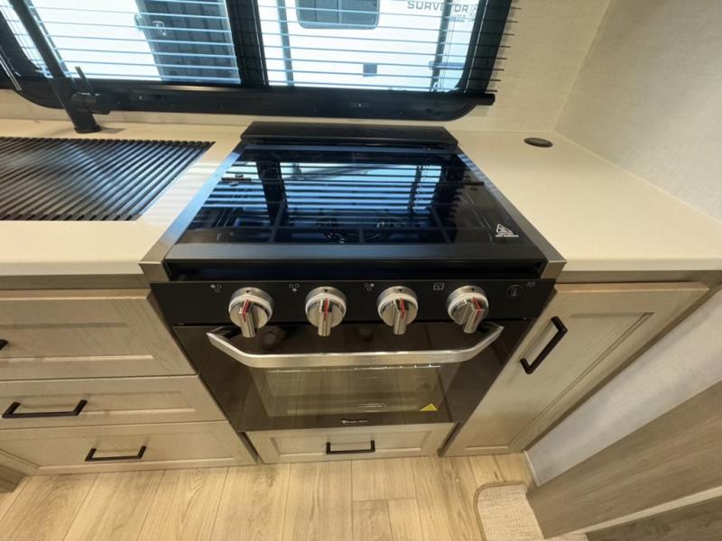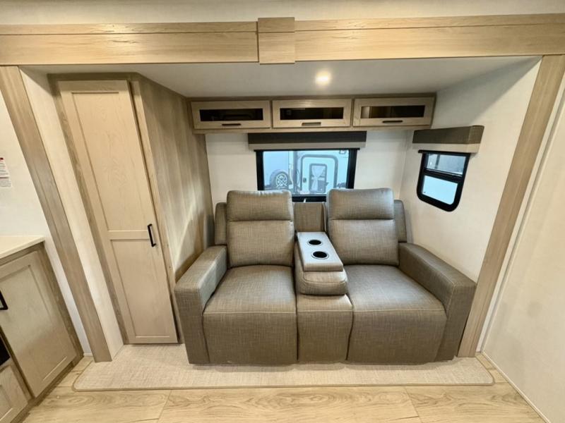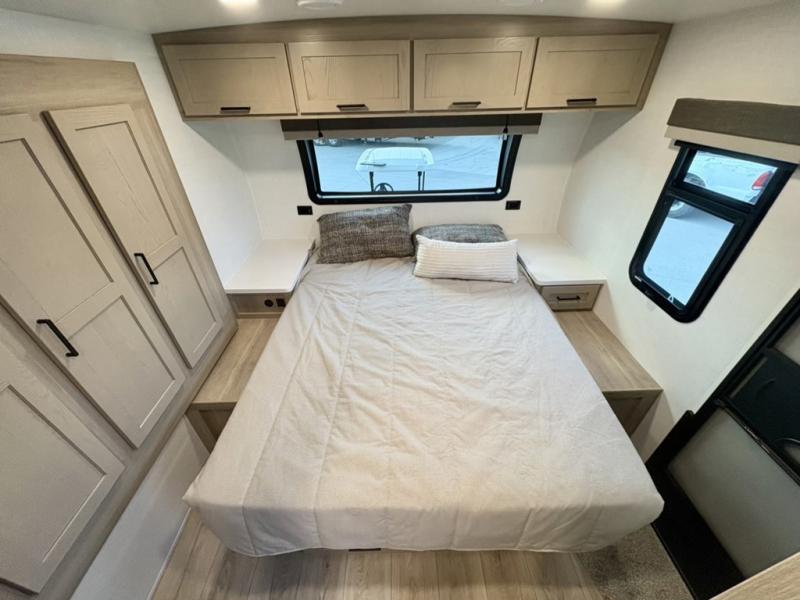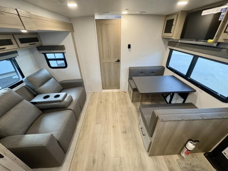 You and your spouse will have a great time camping in this travel trailer! You will have your own RV queen bed to sleep on in the front private bedroom, and an optional TV can be added if you enjoy the morning news in bed. Breakfast can be made on the three burner cooktop in the rear kitchen, or head outdoors to cook on the outside griddle. The 67" theater seating with cupholders will provide a place to relax and dine together, and the spacious walk-through bath will allow you to clean up before you head out for the day. This model includes plenty of storage space, including a pantry for your snacks, a wardrobe slide out in the bedroom, plus a drop-frame pass-through storage for larger camp gear!