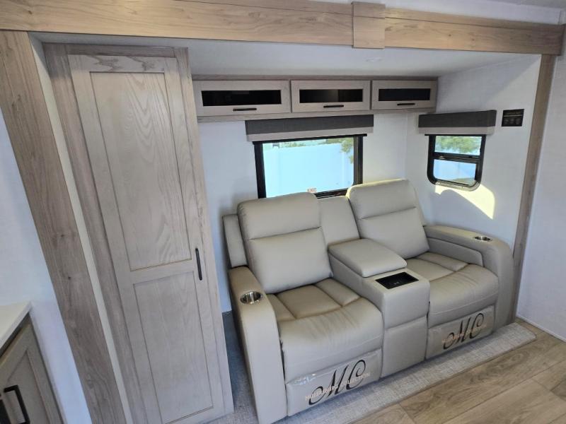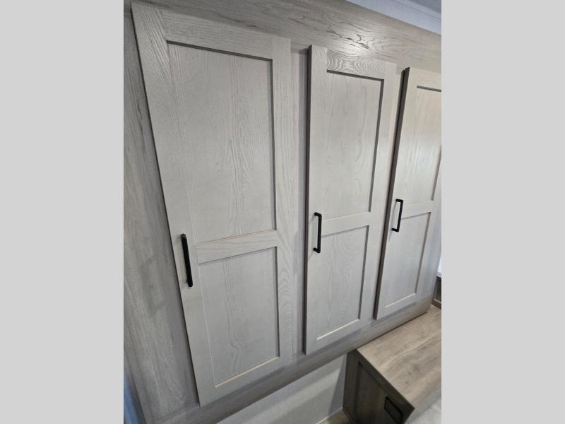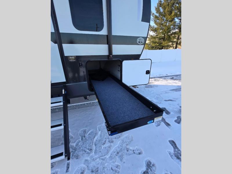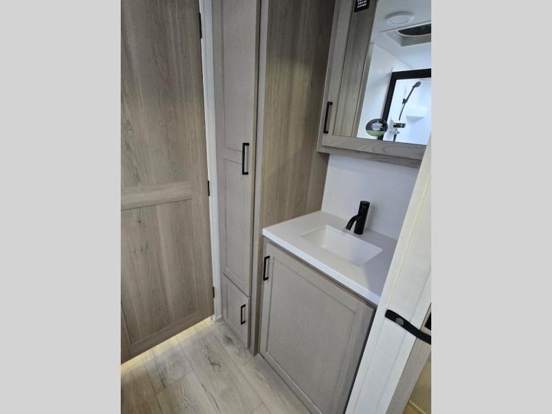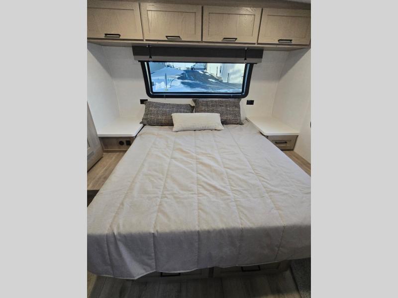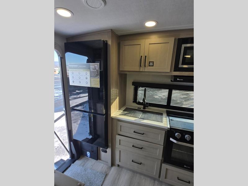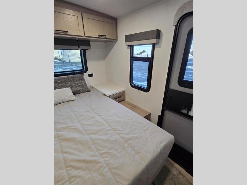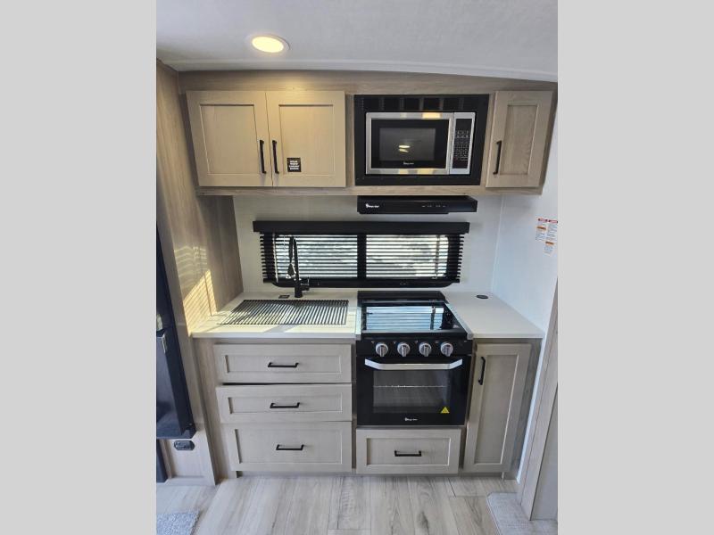 You and your spouse will have a great time camping in this travel trailer! You will have your own RV queen bed to sleep on in the front private bedroom, and an optional TV can be added if you enjoy the morning news in bed. Breakfast can be made on the three burner cooktop in the rear kitchen, or head outdoors to cook on the outside griddle. The 67" theater seating with cupholders will provide a place to relax and dine together, and the spacious walk-through bath will allow you to clean up before you head out for the day. This model includes plenty of storage space, including a pantry for your snacks, a wardrobe slide out in the bedroom, plus a drop-frame pass-through storage for larger camp gear!