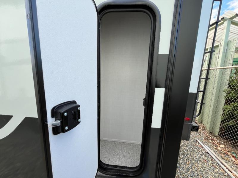 You and your spouse will have a great time camping in this travel trailer! You will have your own RV queen bed to sleep on in the front private bedroom, and an optional TV can be added if you enjoy the morning news in bed. Breakfast can be made on the three burner cooktop in the rear kitchen, or head outdoors to cook on the outside griddle. The 67" theater seating with cupholders will provide a place to relax and dine together, and the spacious walk-through bath will allow you to clean up before you head out for the day. This model includes plenty of storage space, including a pantry for your snacks, a wardrobe slide out in the bedroom, plus a drop-frame pass-through storage for larger camp gear!
