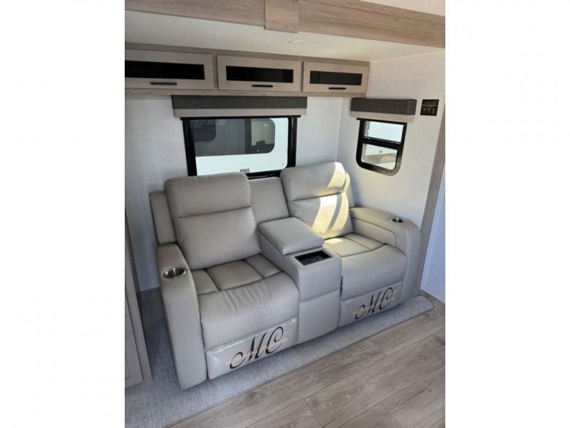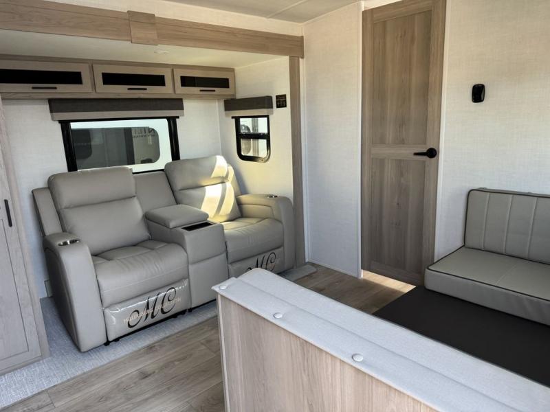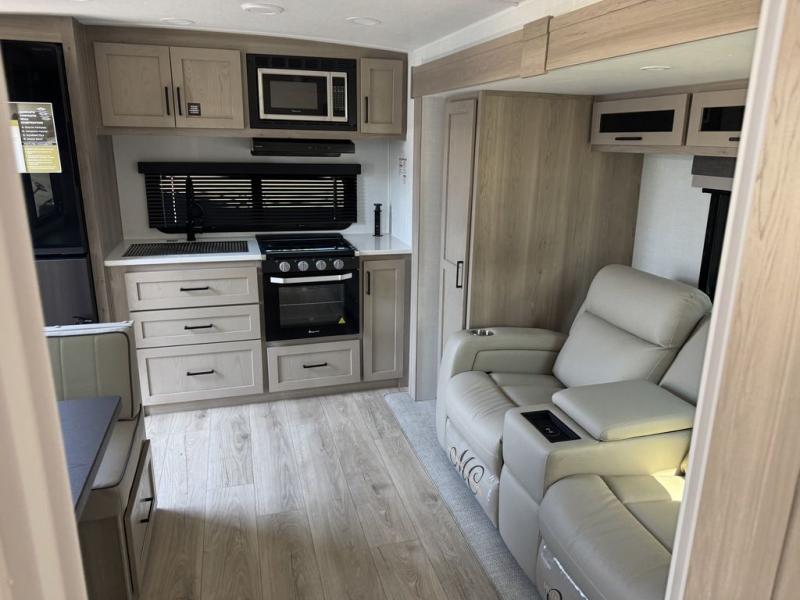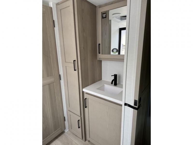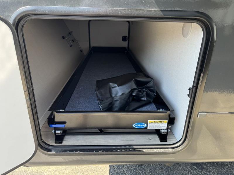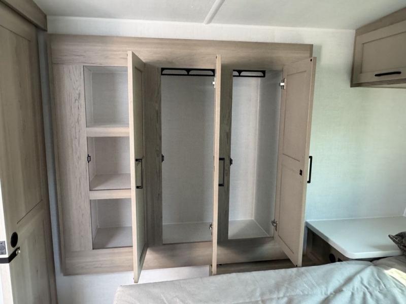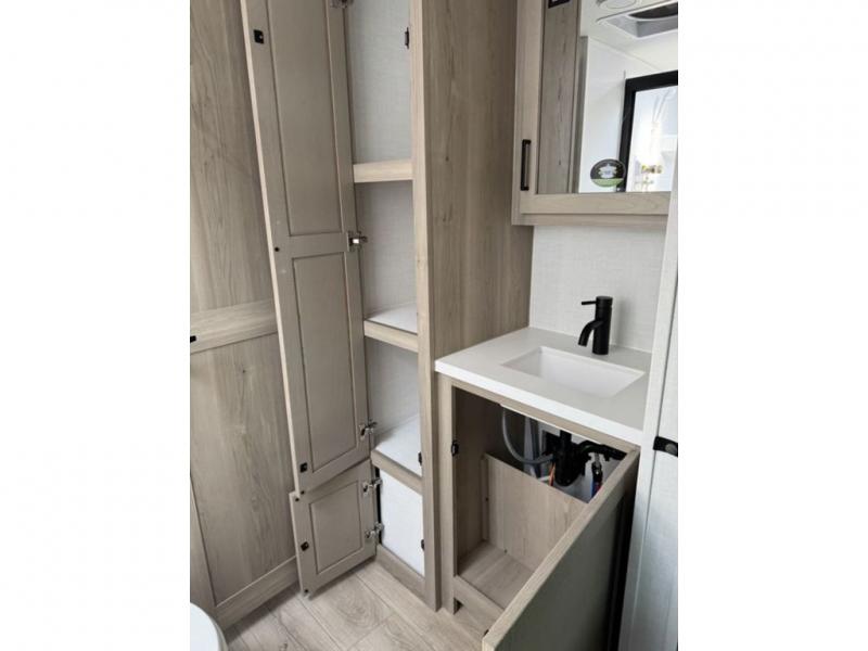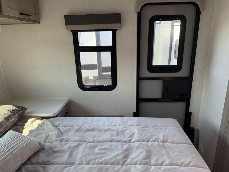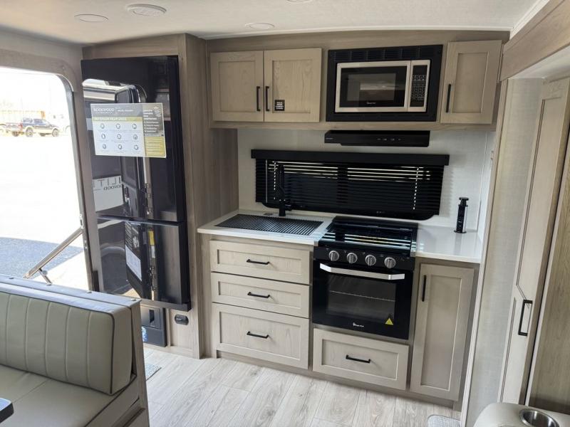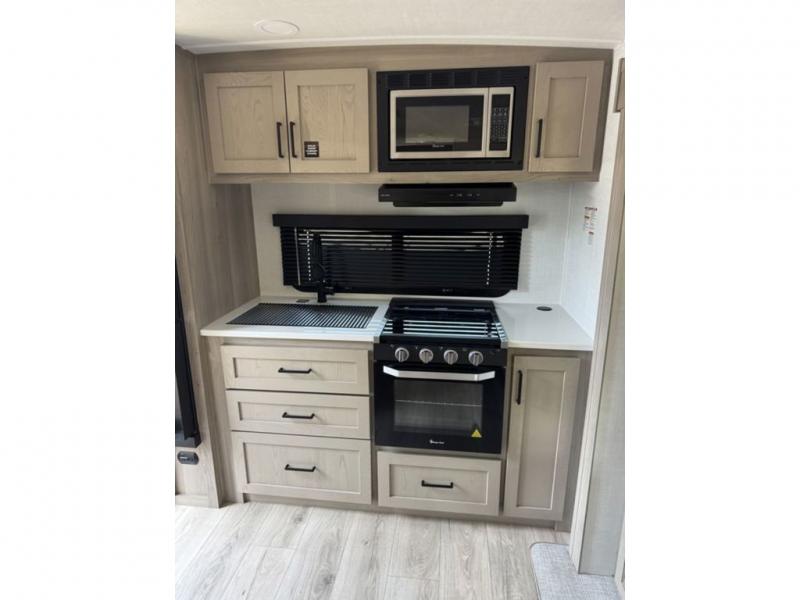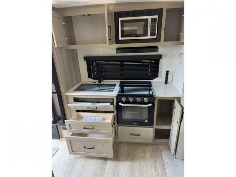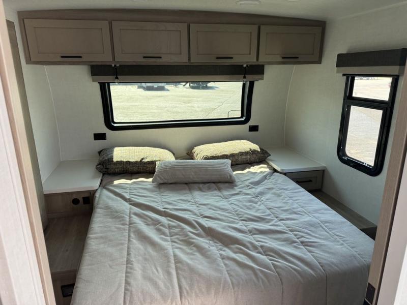 You and your spouse will have a great time camping in this travel trailer! You will have your own RV queen bed to sleep on in the front private bedroom, and an optional TV can be added if you enjoy the morning news in bed. Breakfast can be made on the three burner cooktop in the rear kitchen, or head outdoors to cook on the outside griddle. The 67" theater seating with cupholders will provide a place to relax and dine together, and the spacious walk-through bath will allow you to clean up before you head out for the day. This model includes plenty of storage space, including a pantry for your snacks, a wardrobe slide out in the bedroom, plus a drop-frame pass-through storage for larger camp gear!
