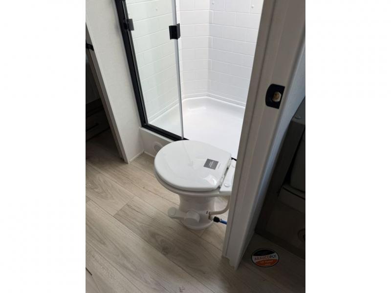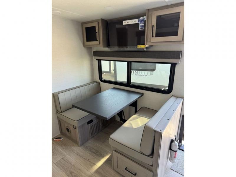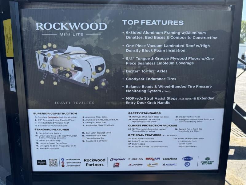 Each Rockwood Mini Lite travel trailer by Forest River is constructed with a fully laminated one-piece walkable roof, sleek frameless windows, and a six-sided full aluminum frame for strength and durability. The 12V thermostatically controlled heated tanks, plus radiant foil in the underbelly will allow you to camp well into the colder months, and the 200W roof solar panel will be perfect for a little off-gridding. Each model includes solid surface kitchen countertops, hidden hinge cabinet doors, roller shades, plus many more interior features. Having an AIR 360+ omnidirectional antenna with WiFi prep on board gives you the option to get some work done if it's needed, and the power tongue jack provides hassle-free set up, so you can enjoy more time relaxing!