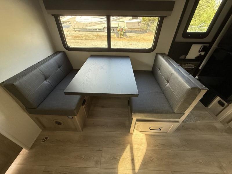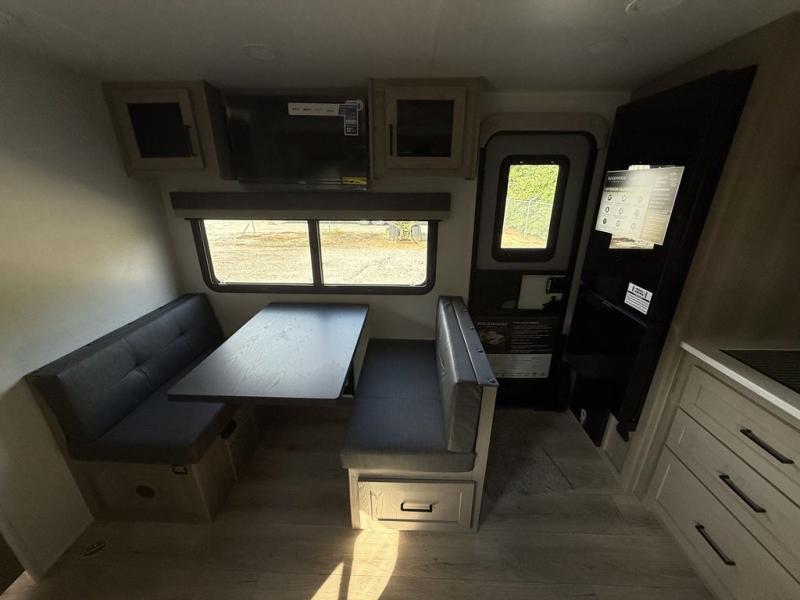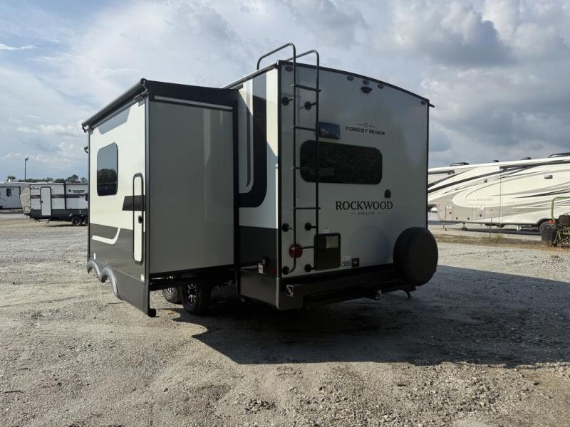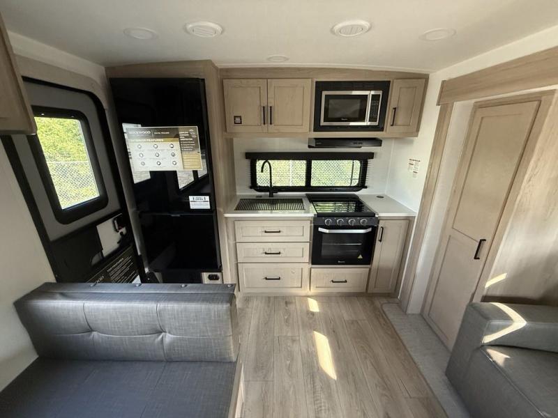 Each Rockwood Mini Lite travel trailer by Forest River is constructed with a fully laminated one-piece walkable roof, sleek frameless windows, and a six-sided full aluminum frame for strength and durability. The 12V thermostatically controlled heated tanks, plus radiant foil in the underbelly will allow you to camp well into the colder months, and the 200W roof solar panel will be perfect for a little off-gridding. Each model includes solid surface kitchen countertops, hidden hinge cabinet doors, roller shades, plus many more interior features. Having an AIR 360+ omnidirectional antenna with WiFi prep on board gives you the option to get some work done if it's needed, and the power tongue jack provides hassle-free set up, so you can enjoy more time relaxing!