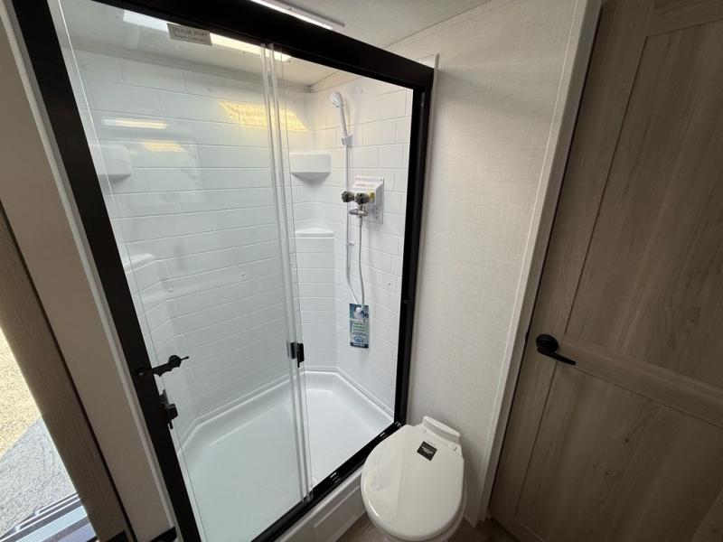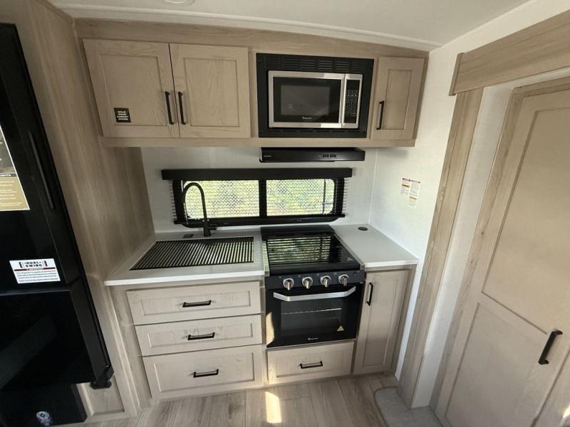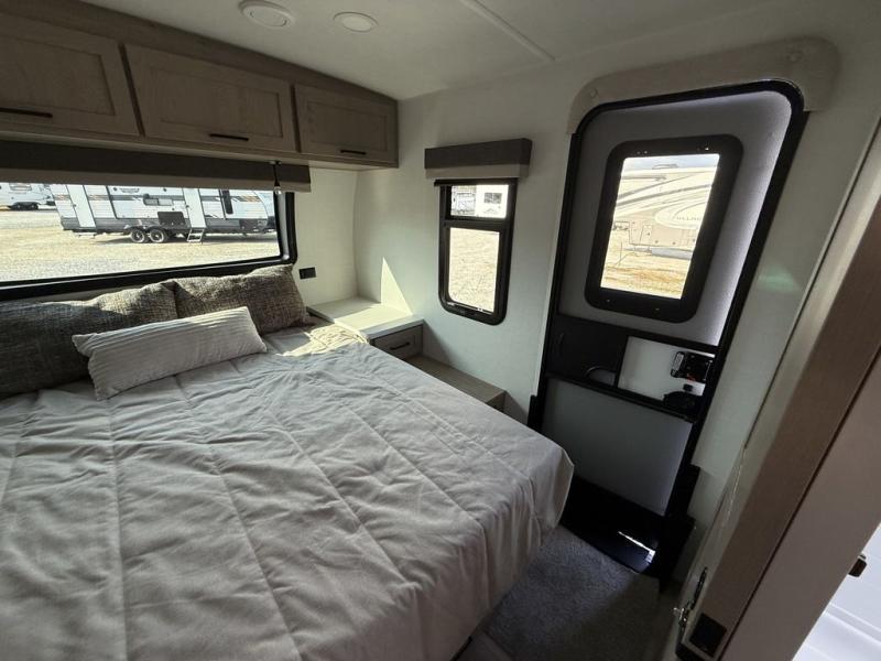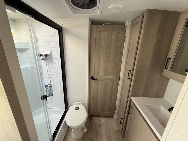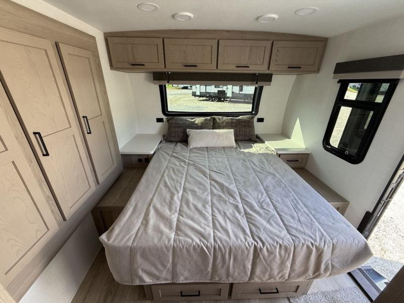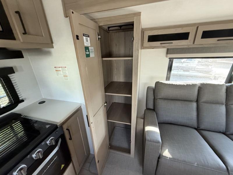 You and your spouse will have a great time camping in this travel trailer! You will have your own RV queen bed to sleep on in the front private bedroom, and an optional TV can be added if you enjoy the morning news in bed. Breakfast can be made on the three burner cooktop in the rear kitchen, or head outdoors to cook on the outside griddle. The 67" theater seating with cupholders will provide a place to relax and dine together, and the spacious walk-through bath will allow you to clean up before you head out for the day. This model includes plenty of storage space, including a pantry for your snacks, a wardrobe slide out in the bedroom, plus a drop-frame pass-through storage for larger camp gear!