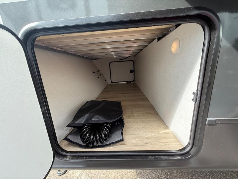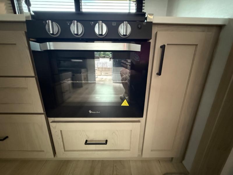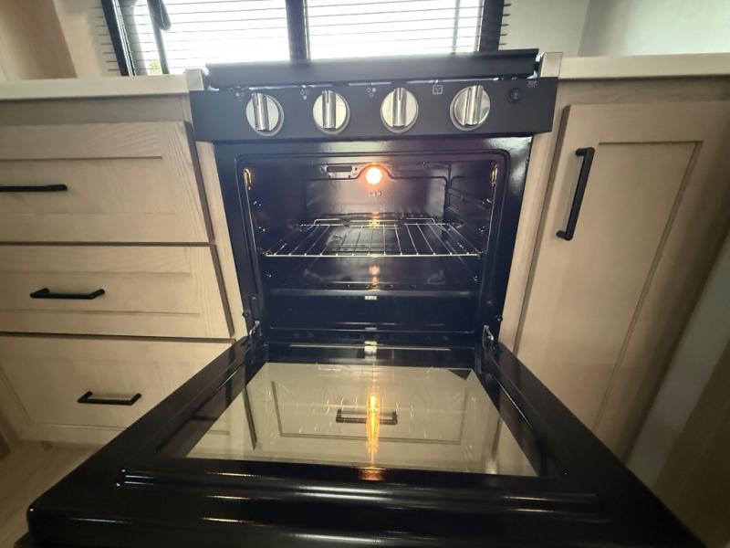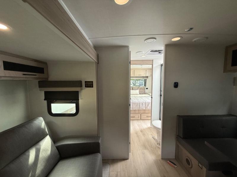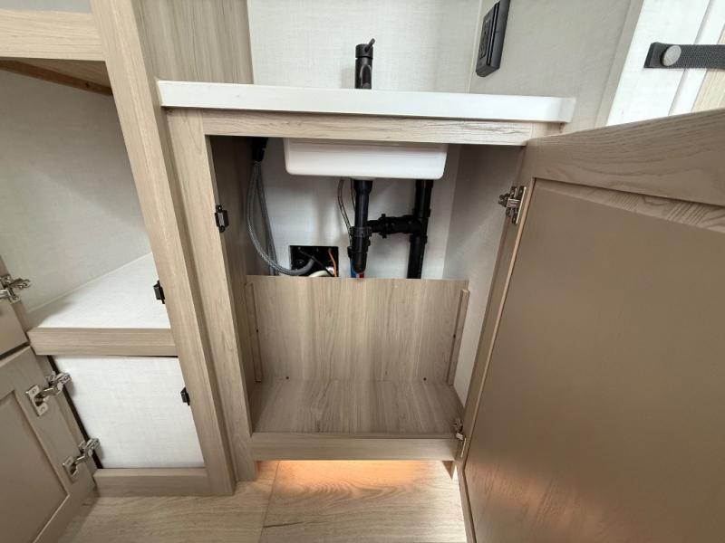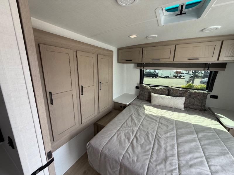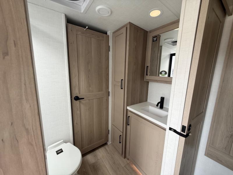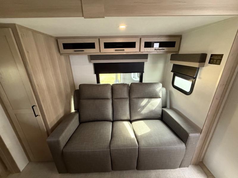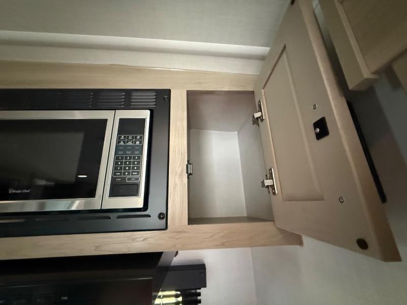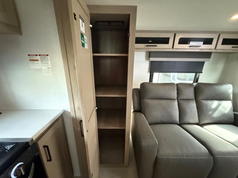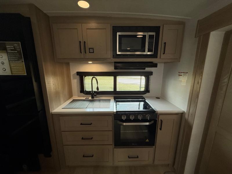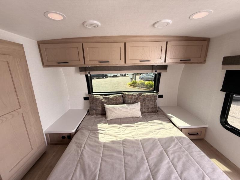 You and your spouse will have a great time camping in this travel trailer! You will have your own RV queen bed to sleep on in the front private bedroom, and an optional TV can be added if you enjoy the morning news in bed. Breakfast can be made on the three burner cooktop in the rear kitchen, or head outdoors to cook on the outside griddle. The 67" theater seating with cupholders will provide a place to relax and dine together, and the spacious walk-through bath will allow you to clean up before you head out for the day. This model includes plenty of storage space, including a pantry for your snacks, a wardrobe slide out in the bedroom, plus a drop-frame pass-through storage for larger camp gear!