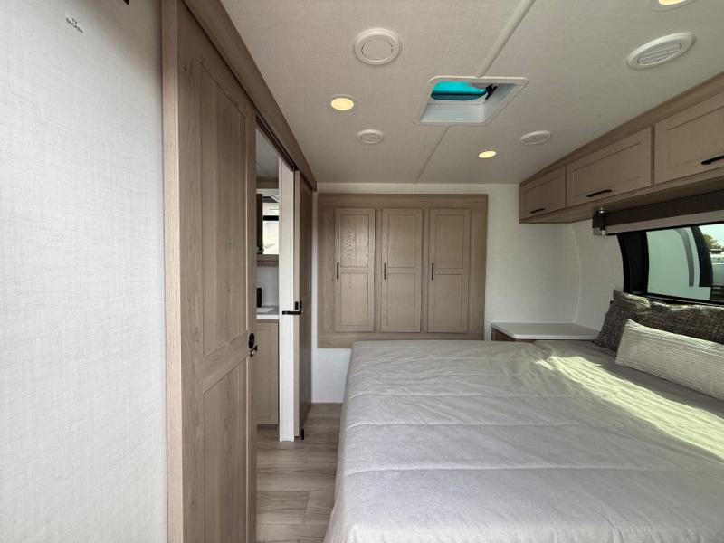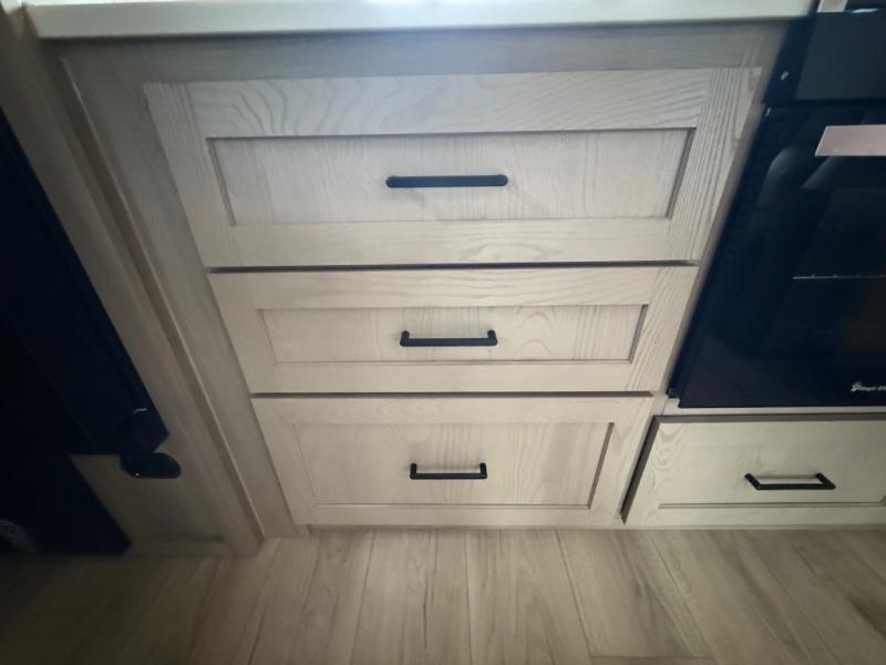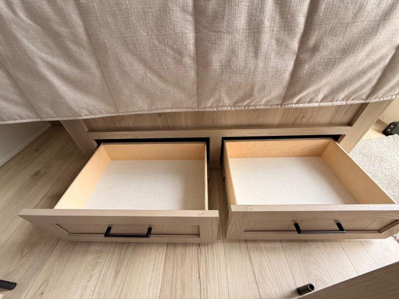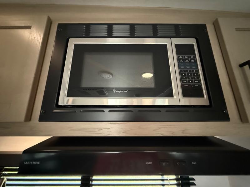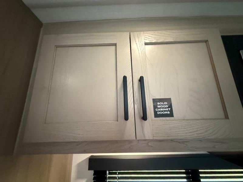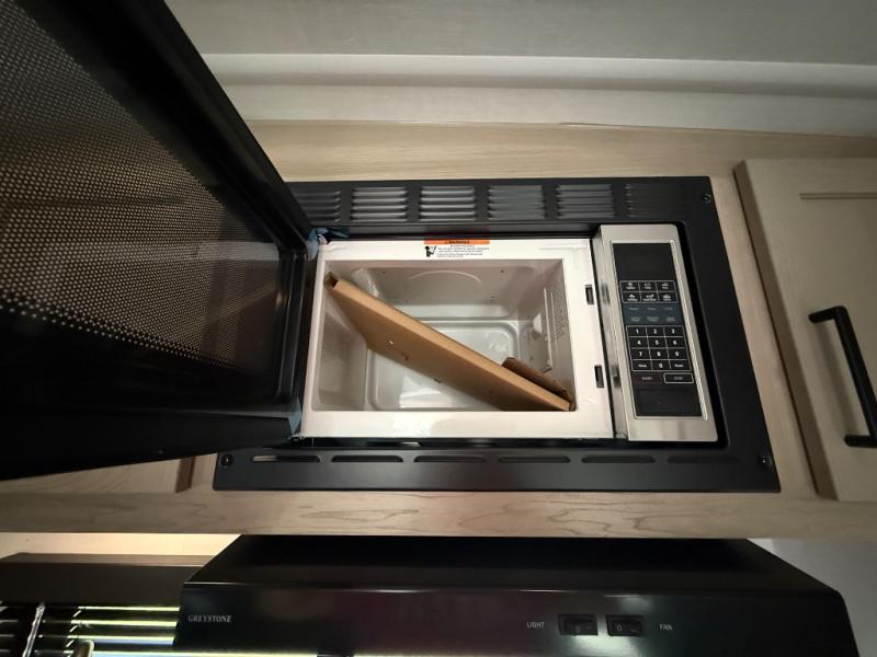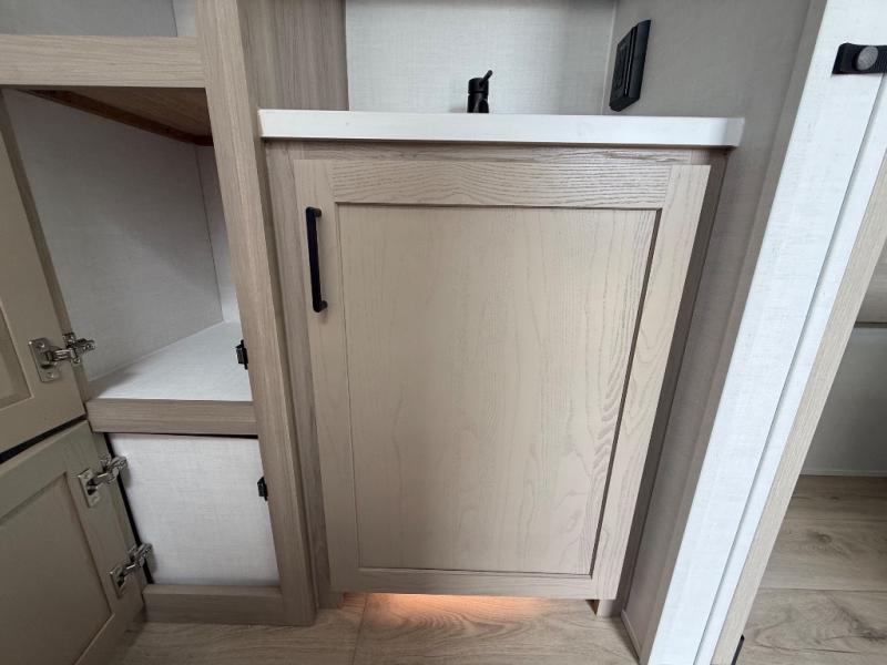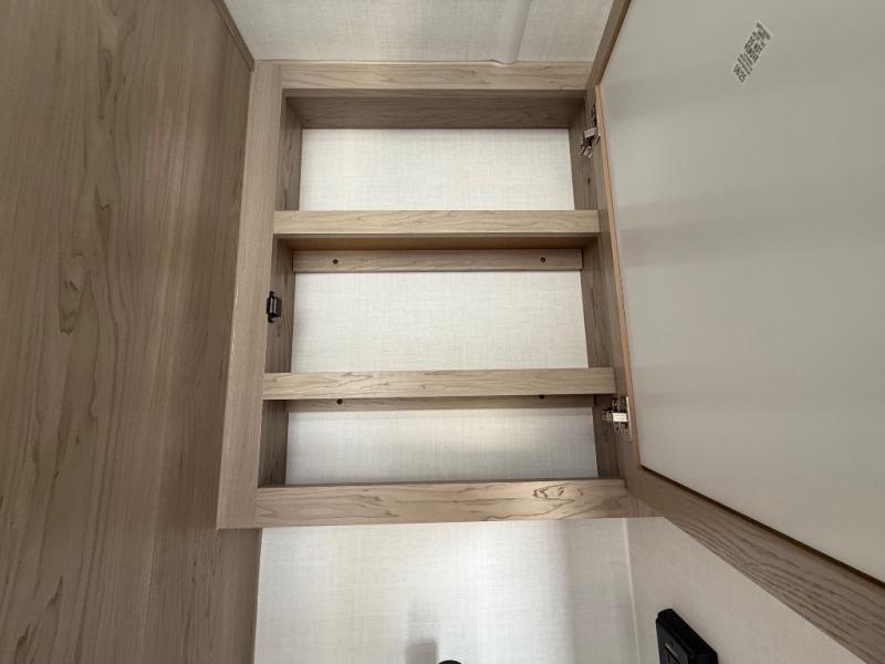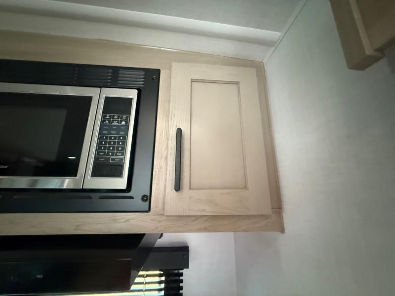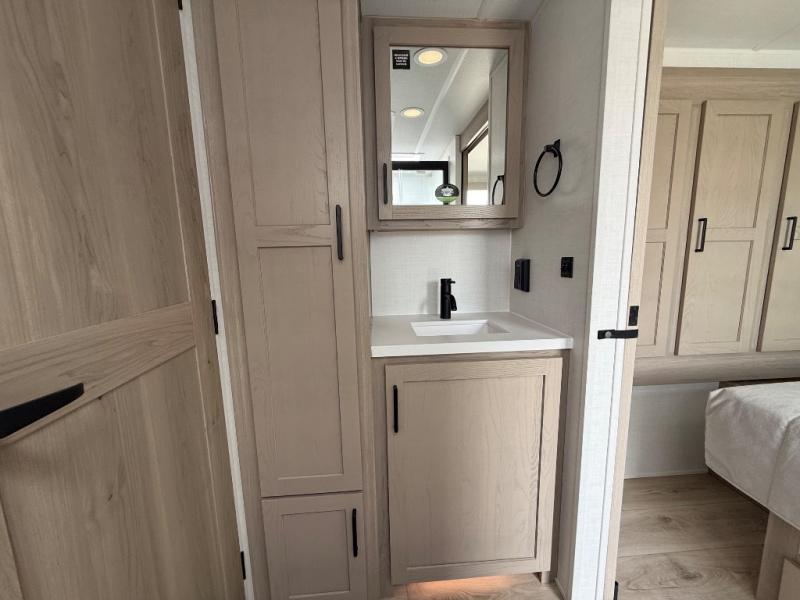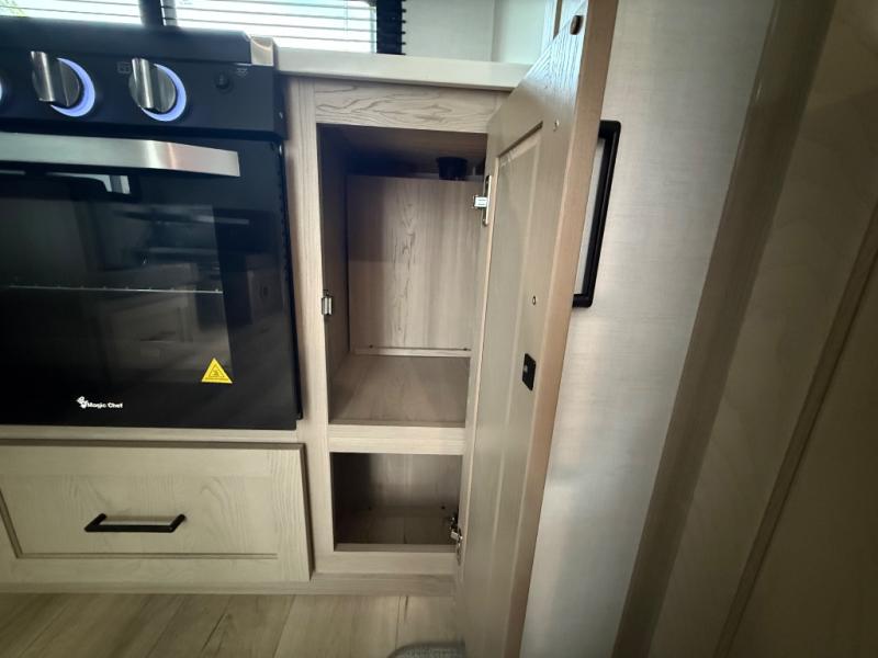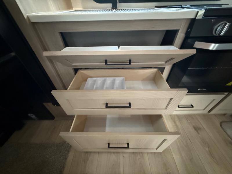 You and your spouse will have a great time camping in this travel trailer! You will have your own RV queen bed to sleep on in the front private bedroom, and an optional TV can be added if you enjoy the morning news in bed. Breakfast can be made on the three burner cooktop in the rear kitchen, or head outdoors to cook on the outside griddle. The 67" theater seating with cupholders will provide a place to relax and dine together, and the spacious walk-through bath will allow you to clean up before you head out for the day. This model includes plenty of storage space, including a pantry for your snacks, a wardrobe slide out in the bedroom, plus a drop-frame pass-through storage for larger camp gear!