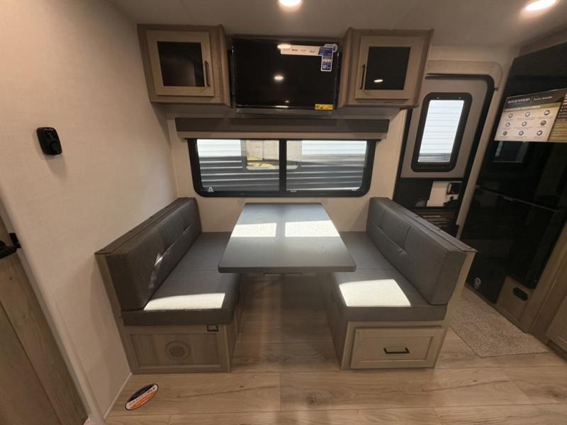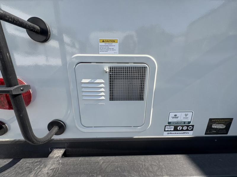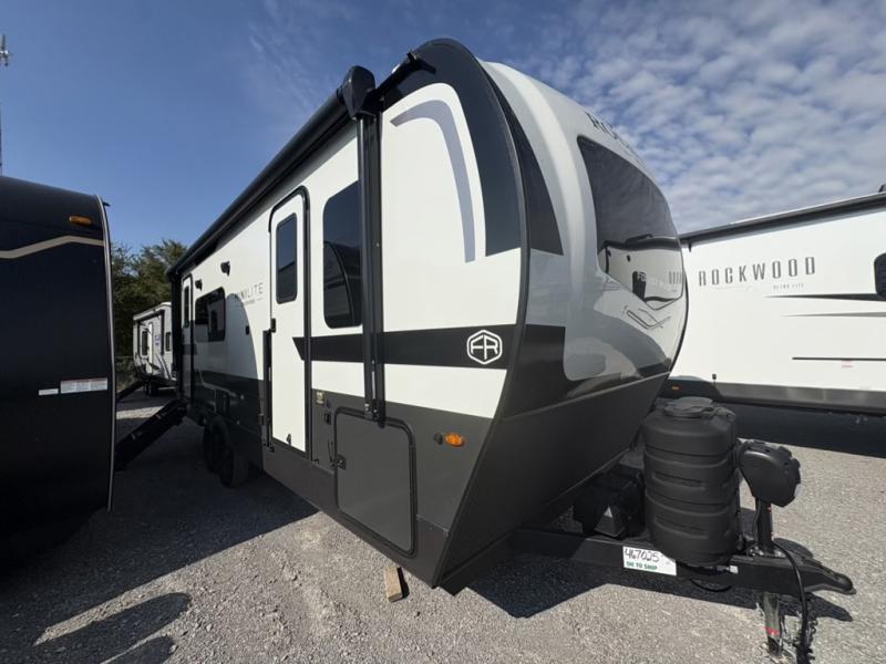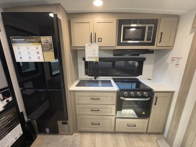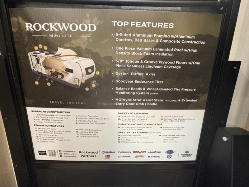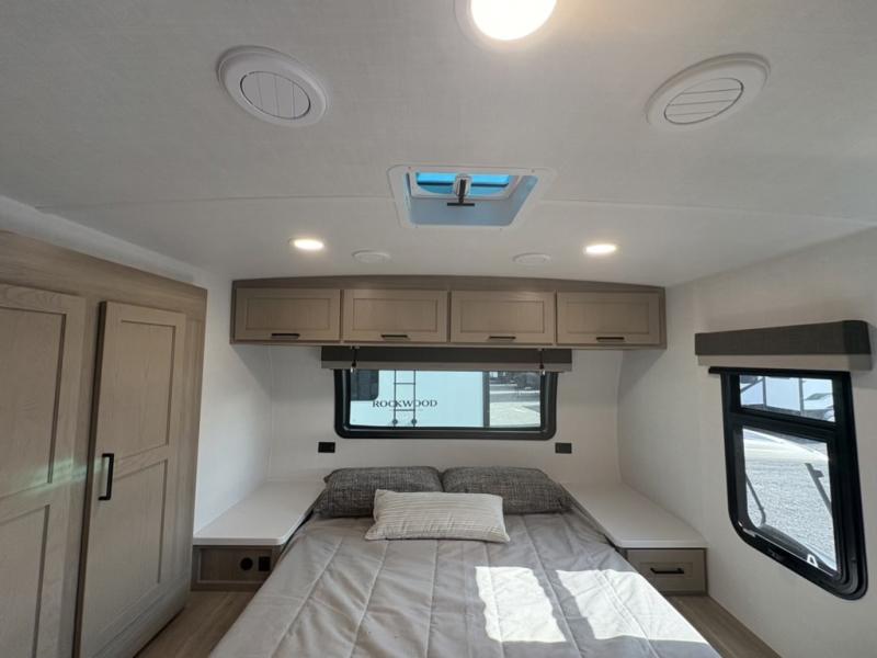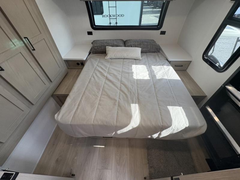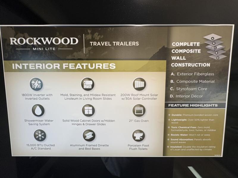 Each Rockwood Mini Lite travel trailer by Forest River is constructed with a fully laminated one-piece walkable roof, sleek frameless windows, and a six-sided full aluminum frame for strength and durability. The 12V thermostatically controlled heated tanks, plus radiant foil in the underbelly will allow you to camp well into the colder months, and the 200W roof solar panel will be perfect for a little off-gridding. Each model includes solid surface kitchen countertops, hidden hinge cabinet doors, roller shades, plus many more interior features. Having an AIR 360+ omnidirectional antenna with WiFi prep on board gives you the option to get some work done if it's needed, and the power tongue jack provides hassle-free set up, so you can enjoy more time relaxing!