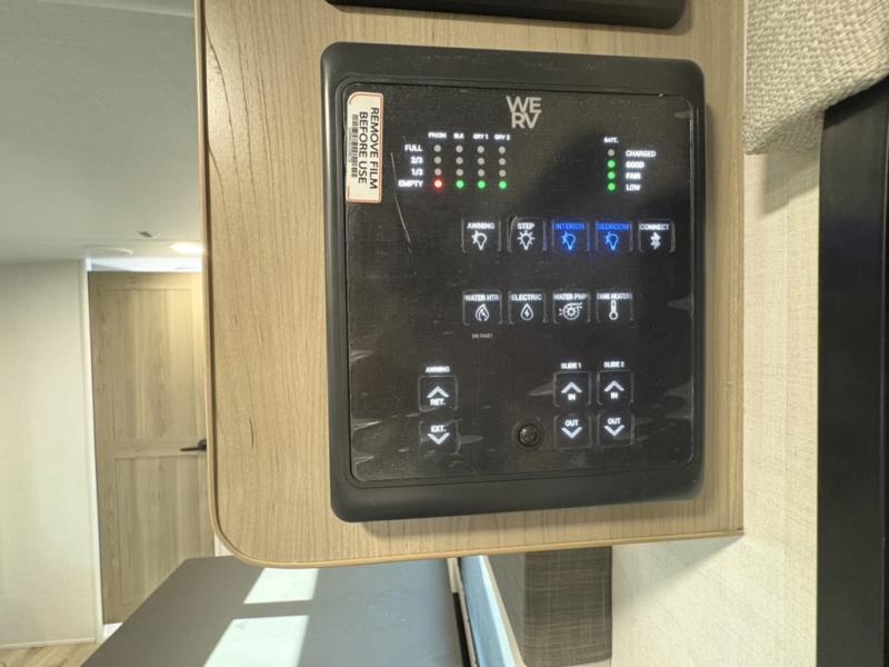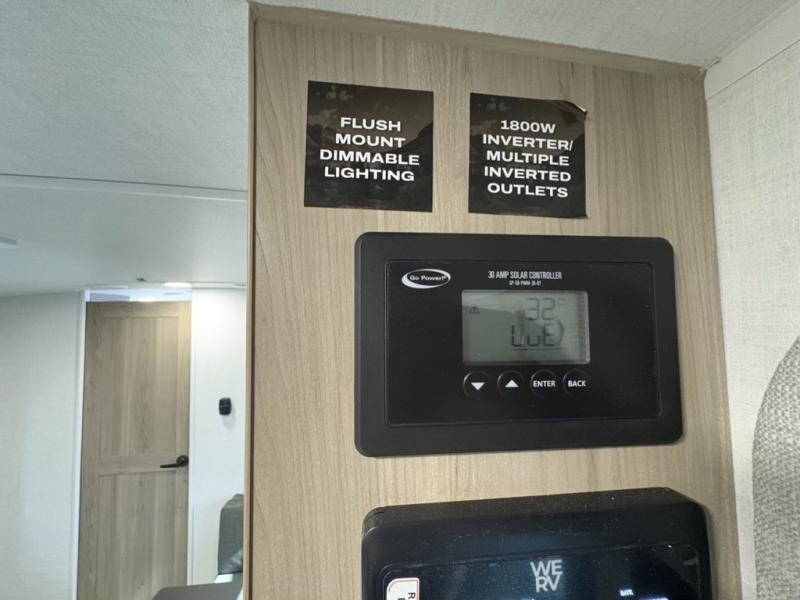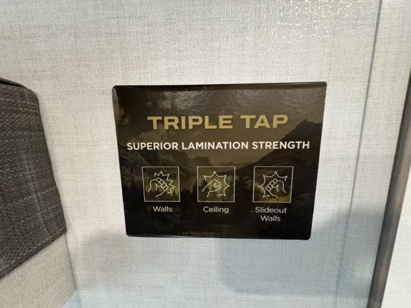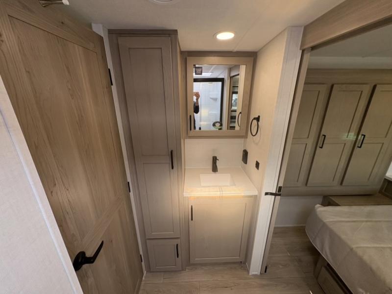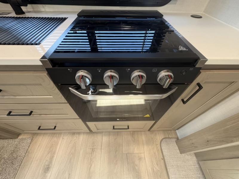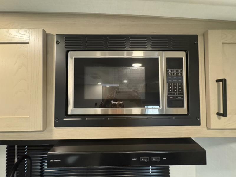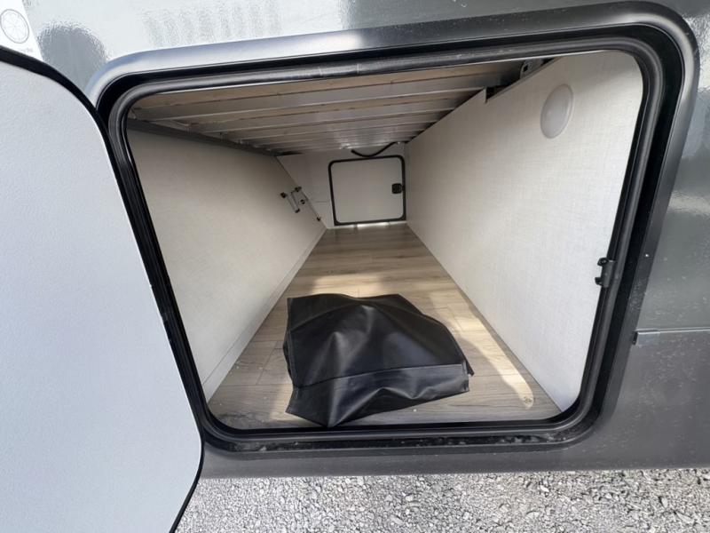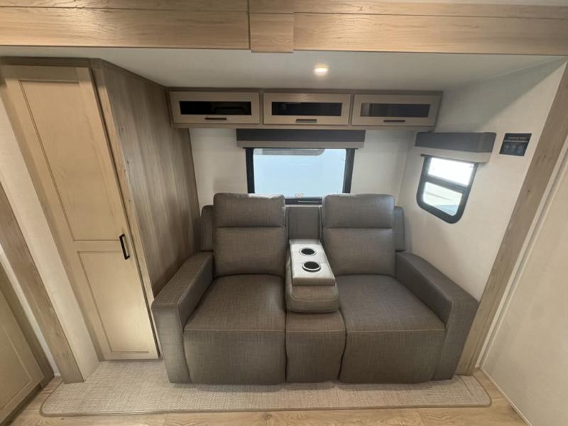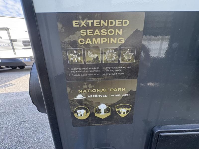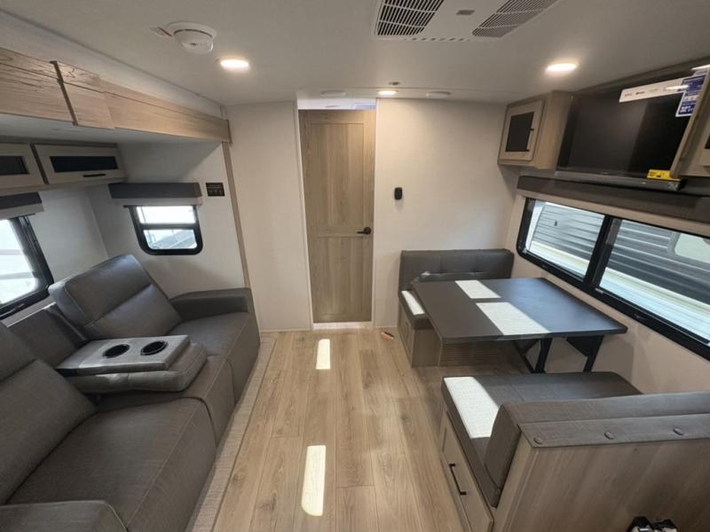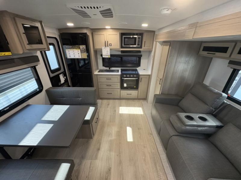 You and your spouse will have a great time camping in this travel trailer! You will have your own RV queen bed to sleep on in the front private bedroom, and an optional TV can be added if you enjoy the morning news in bed. Breakfast can be made on the three burner cooktop in the rear kitchen, or head outdoors to cook on the outside griddle. The 67" theater seating with cupholders will provide a place to relax and dine together, and the spacious walk-through bath will allow you to clean up before you head out for the day. This model includes plenty of storage space, including a pantry for your snacks, a wardrobe slide out in the bedroom, plus a drop-frame pass-through storage for larger camp gear!